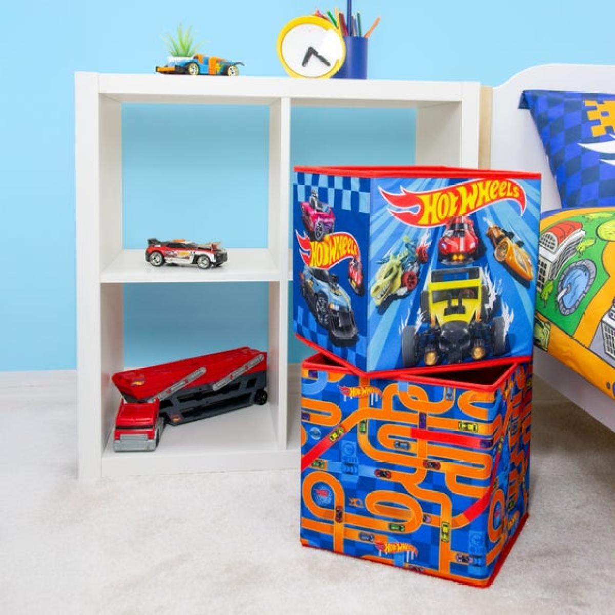 * Includes 2 storage cubes with different race themed prints * Features toy cars, orange track and checkerboard patterns * Great for toys, books and games * Folds flat when not in use Time to burn some rubber. These Hot Wheels storage boxes are perfect for young racing fans who love speed, colour and keeping things tidy. With bold designs featuring toy cars, checkerboard patterns and the iconic orange track, they bring the racetrack right into their room. Great for storing toys, books and games, they are made from strong polyester and fold away when not in use. Light enough to carry and easy to move around, they are a fun way to keep playrooms and bedrooms neat. Just the thing for little racers who need a pit stop for their stuff.