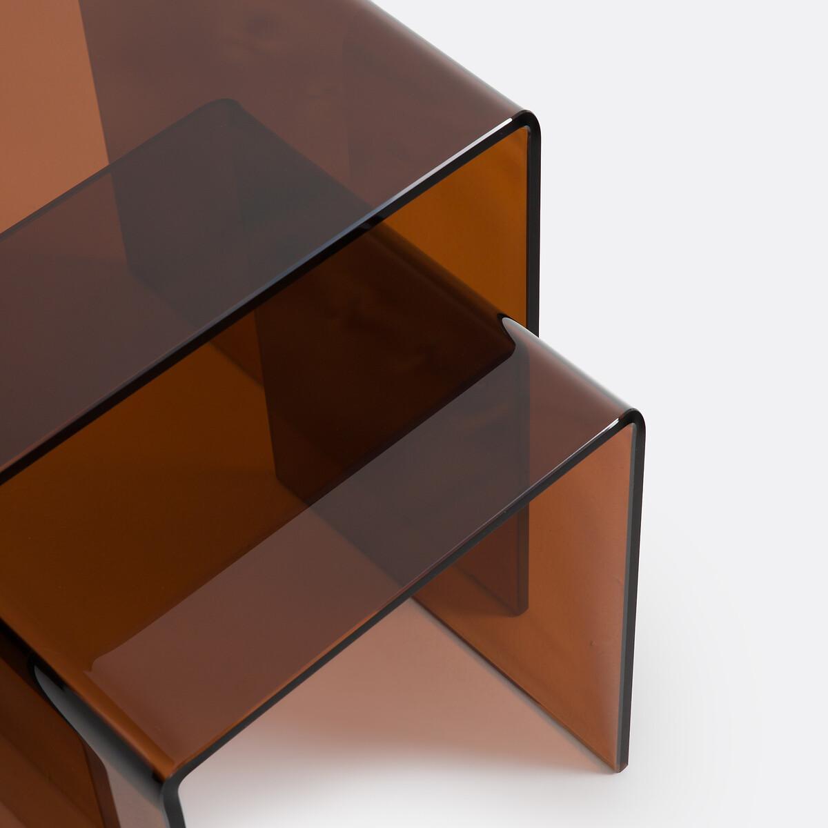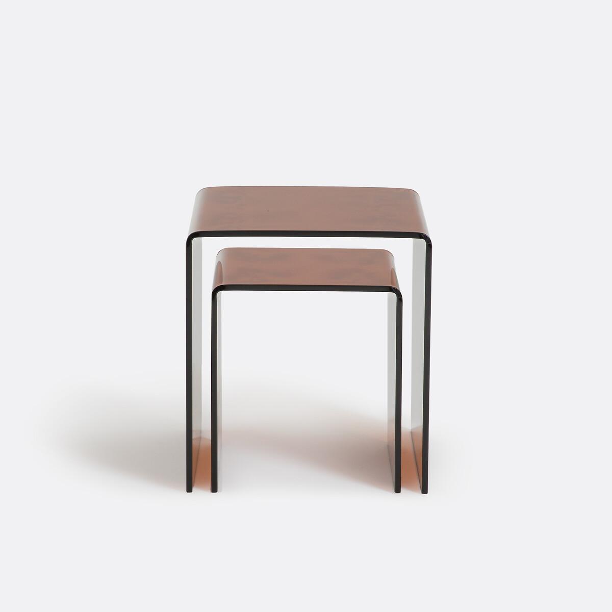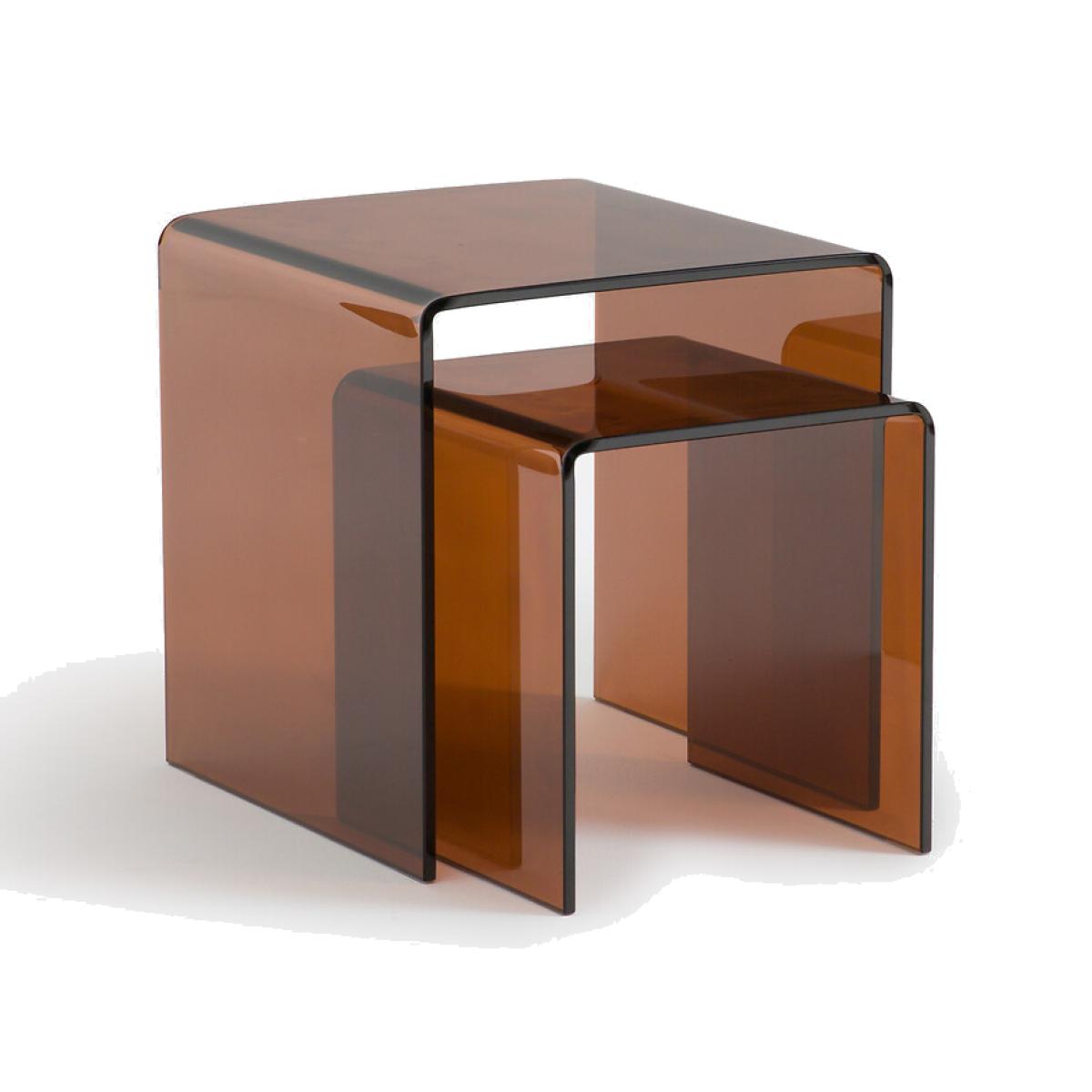 In tempered glass, the two Joan nesting end tables adopt a definitively modern and refined style. They work in any interior. Product Details • Smoked or amber tempered glass, 12mm thick • Sheer polyethylene runners • Maximum weight supported : 10kg for the large model, 5kg for the small model • Set of 2 side tables, different sizes. Care Advice • To protect your side table, think about using coasters, trivets and placemats. Dimensions. Large • Width: 45cm • Height: 50cm • Depth: 45cm. Small • Width: 35cm • Height: 35cm • Depth: 40cm. Total weight of batch: 30kg • Sold pre-assembled. Dimensions and weight of parcel1 parcel • L56 x H51 x D51cm. 34kg