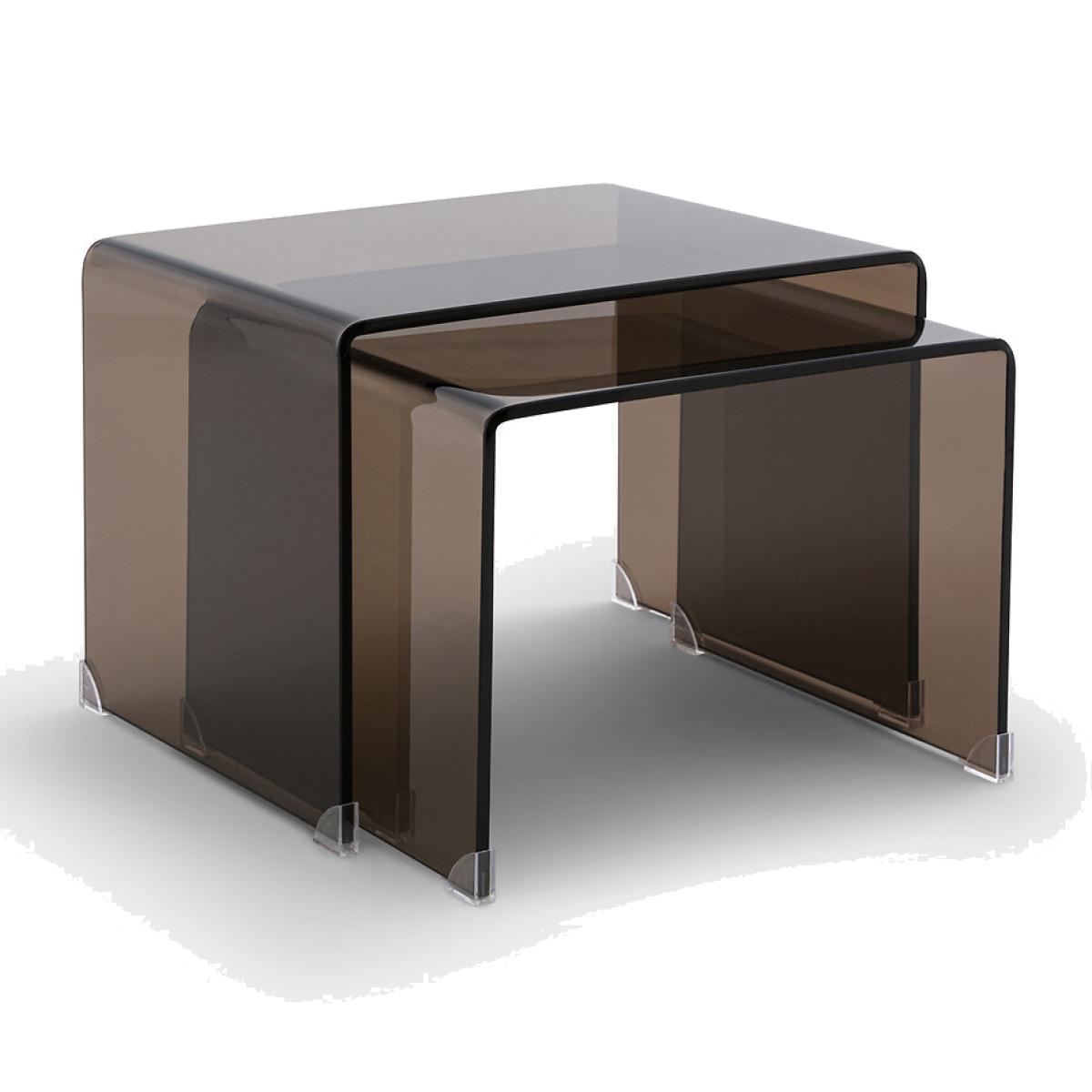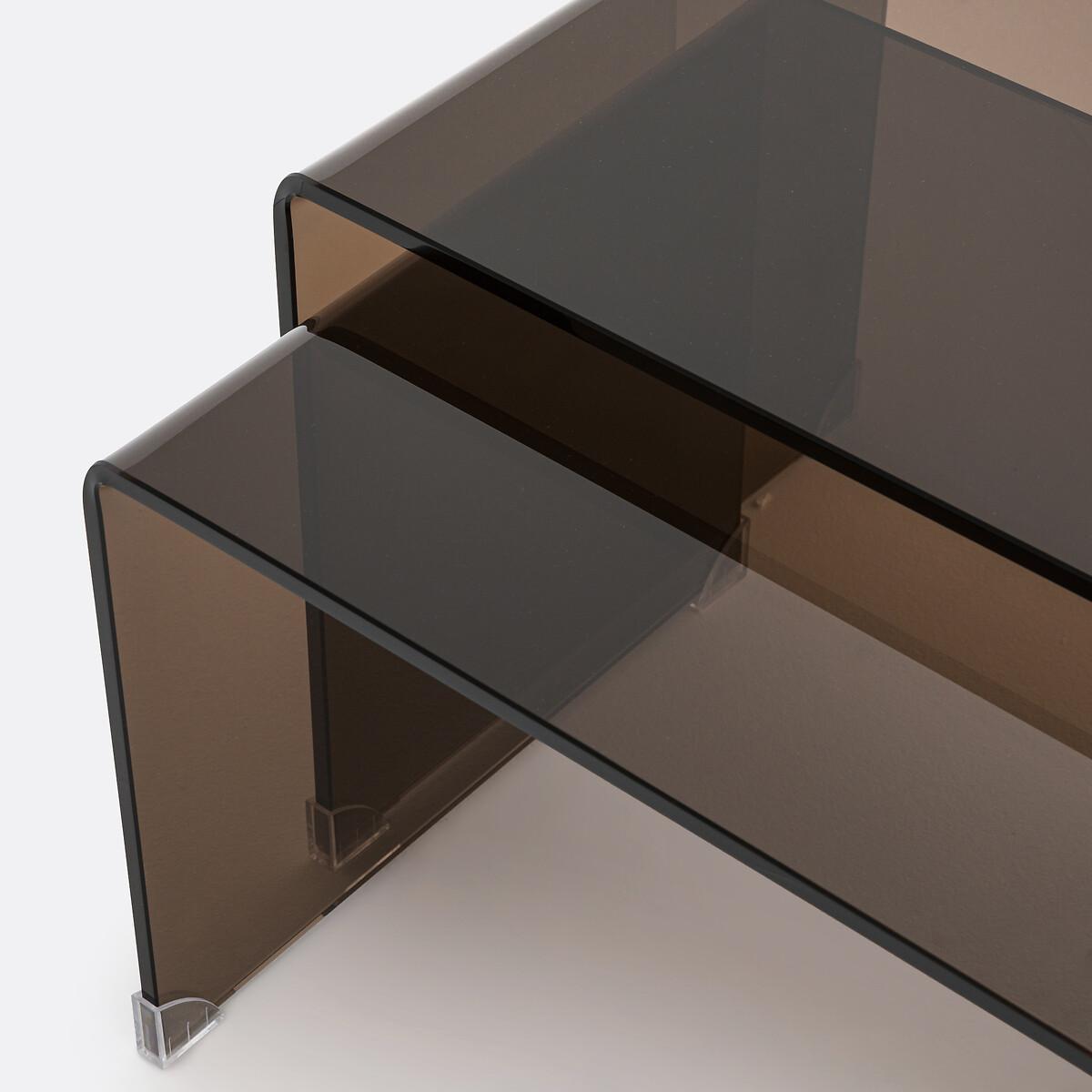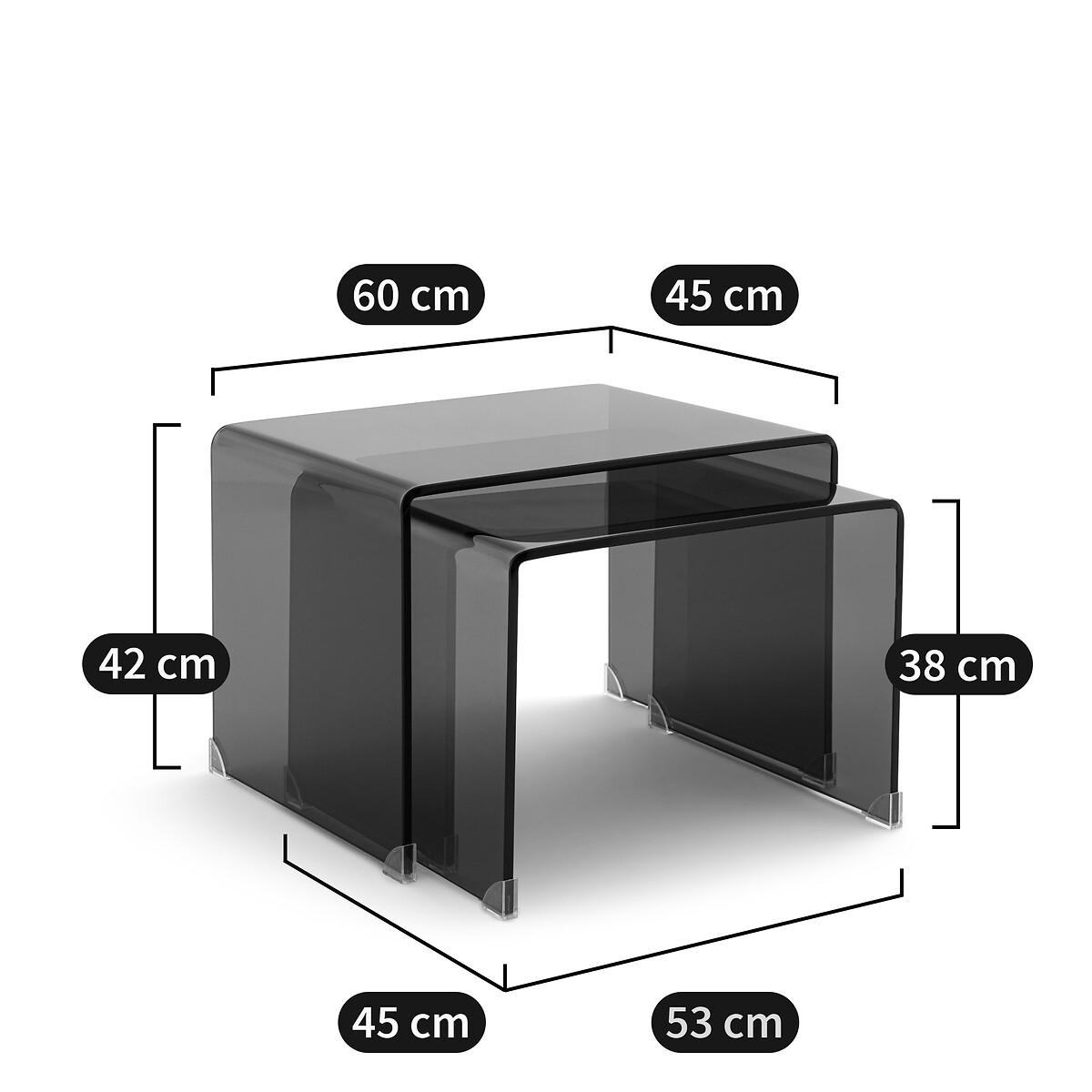 In smoked tempered glass, the two Joan nesting coffee tables adopt a definitively modern and refined style. They fit into all interiors. Product Details • In transparent smoked brown tempered glass, thickness 12mm • Transparent polyethylene plastic glides • Set of 2 tables, different sizes. Quality Info • These coffee tables are made of tempered glass for your safety. Care Advice • To protect your coffee tables, consider trivets, coasters and placemats. Dimensions Small table • Width: 53cm • Height: 38cm • Depth: 45cm. Large table • Width: 60cm • Height: 42cm • Depth: 45cmDelivery:. Sold pre-assembled. Note! Please check that all access points are large enough to accommodate your delivery (doors, stairs, lifts).Dimensions and weight of parcel1 parcel • L66 x H51 x D48cm. 37.7kg