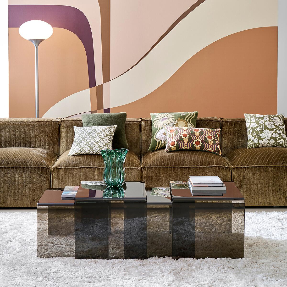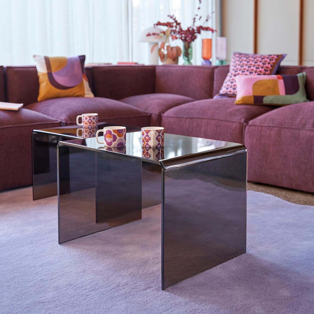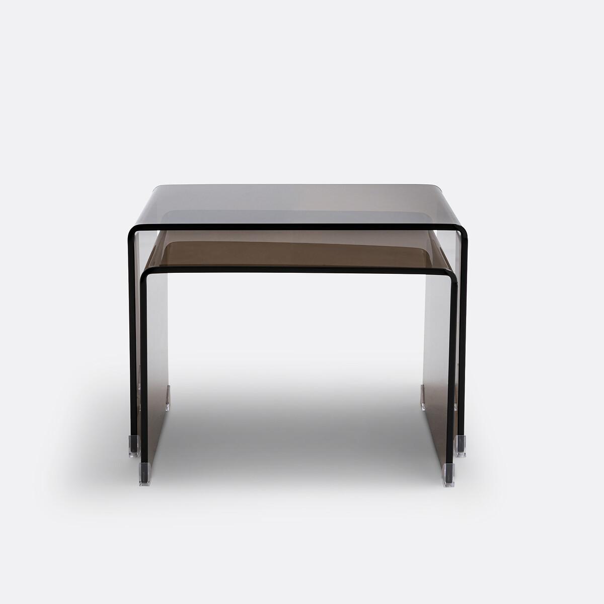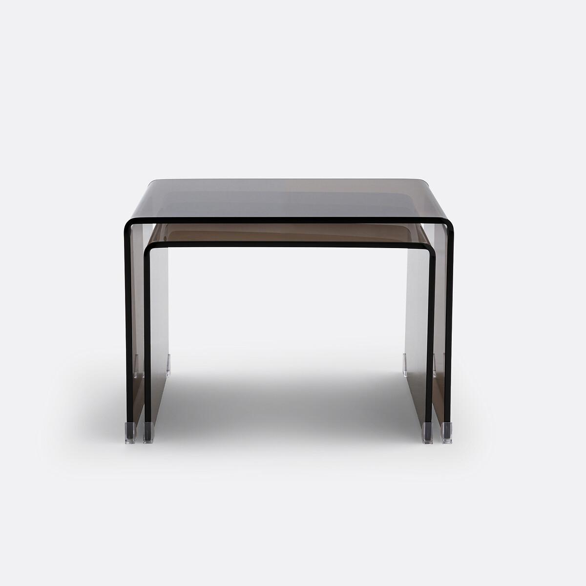In smoked tempered glass, the two Joan nesting coffee tables adopt a definitively modern and refined style. They fit into all interiors. Product Details • In transparent smoked brown tempered glass, thickness 12mm • Transparent polyethylene plastic glides • Set of 2 tables, different sizes. Quality Info • These coffee tables are made of tempered glass for your safety. Care Advice • To protect your coffee tables, consider trivets, coasters and placemats. Dimensions Small table • Width: 53cm • Height: 38cm • Depth: 45cm. Large table • Width: 60cm • Height: 42cm • Depth: 45cmDelivery:. Sold pre-assembled. Note! Please check that all access points are large enough to accommodate your delivery (doors, stairs, lifts).Dimensions and weight of parcel1 parcel • L66 x H51 x D48cm. 37.7kg