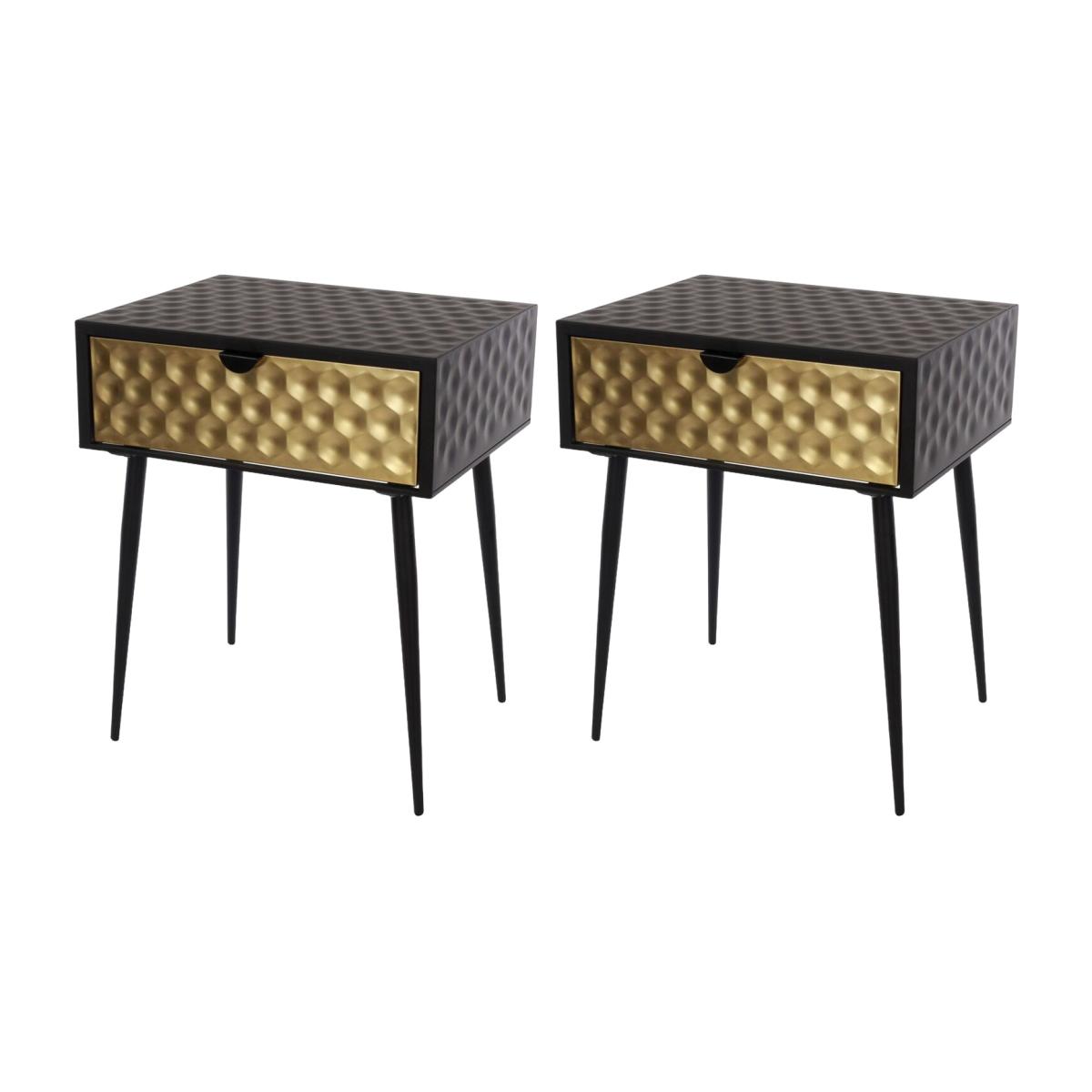 Comes in a set of 2, this strong and stylish bedside cabinet is crafted entirely from metal, finished in black with a contrasting gold effect honeycomb drawer front and sleek black handle. The metal drawer box features smooth, easy glide runners, while mid century inspired tapered legs elevate the cabinet for easy cleaning. Perfect as a bedside cabinet or side table, it combines durability, practicality, and standout style.