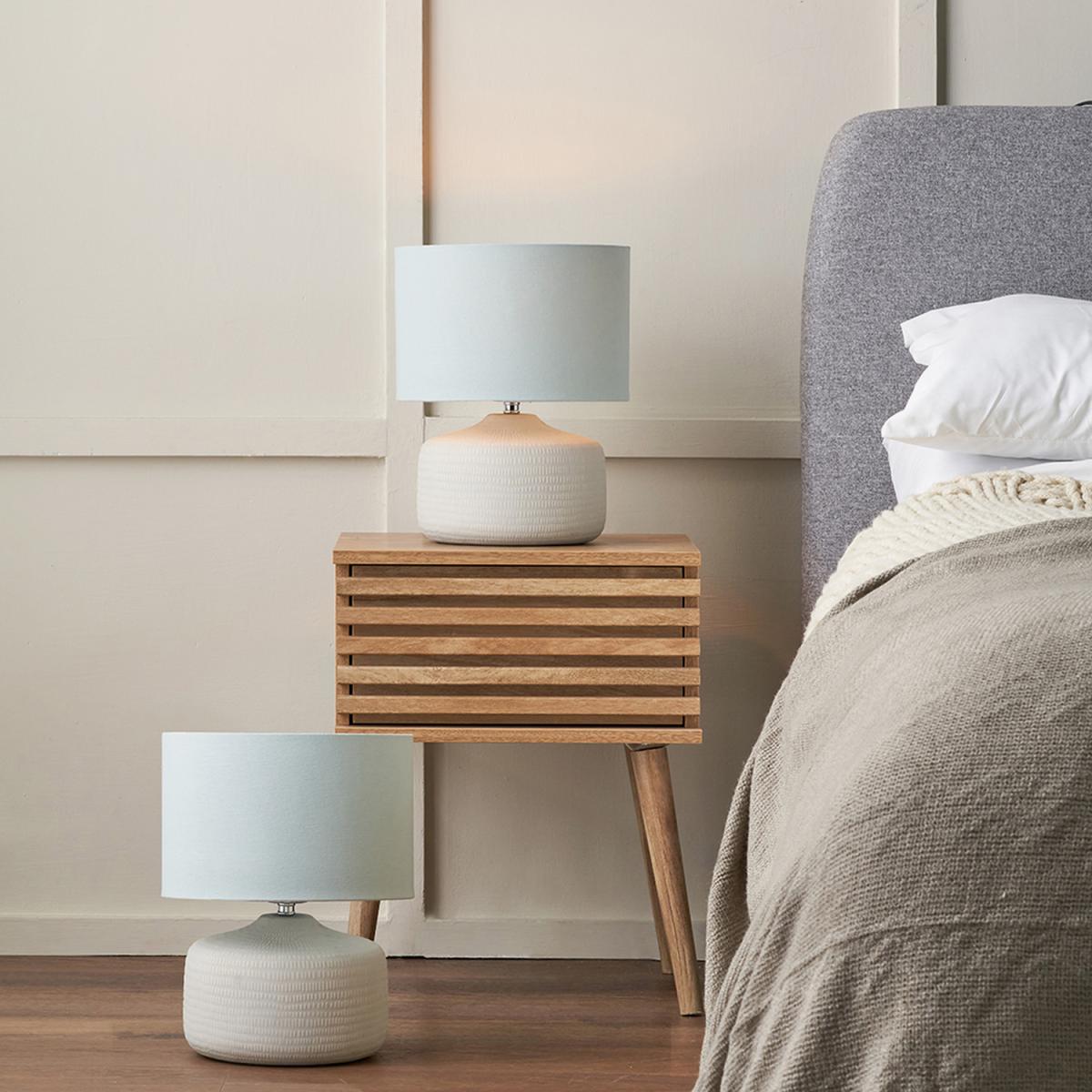 Add modern texture to your home with this set of 2 Kai textured ceramic table lamps. Featuring a stylish, textured ceramic base, these lamps bring subtle detail and contemporary charm to any space. Finished with classic fabric shades, they are perfect for bedside tables, living rooms or hallways, providing soft, ambient lighting.