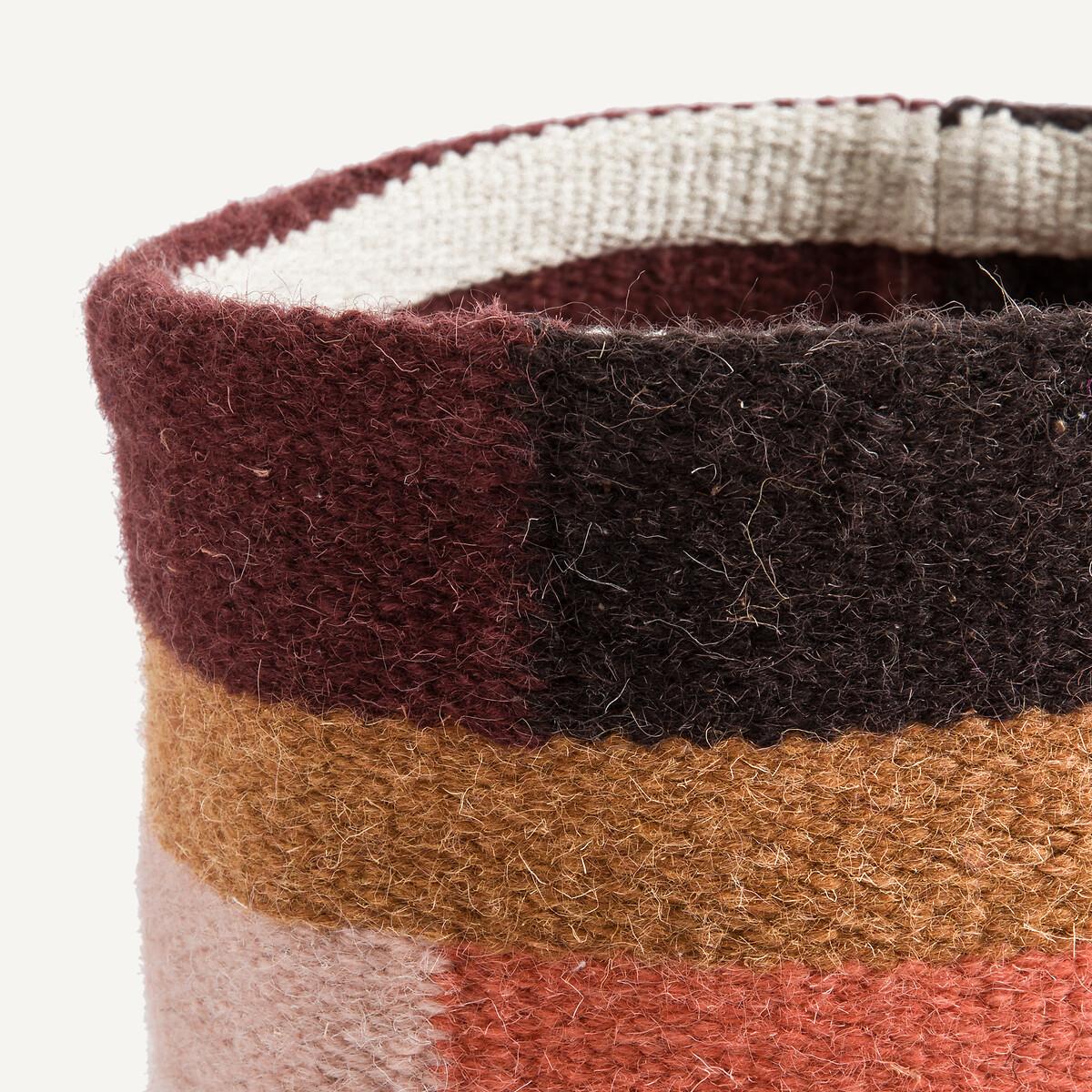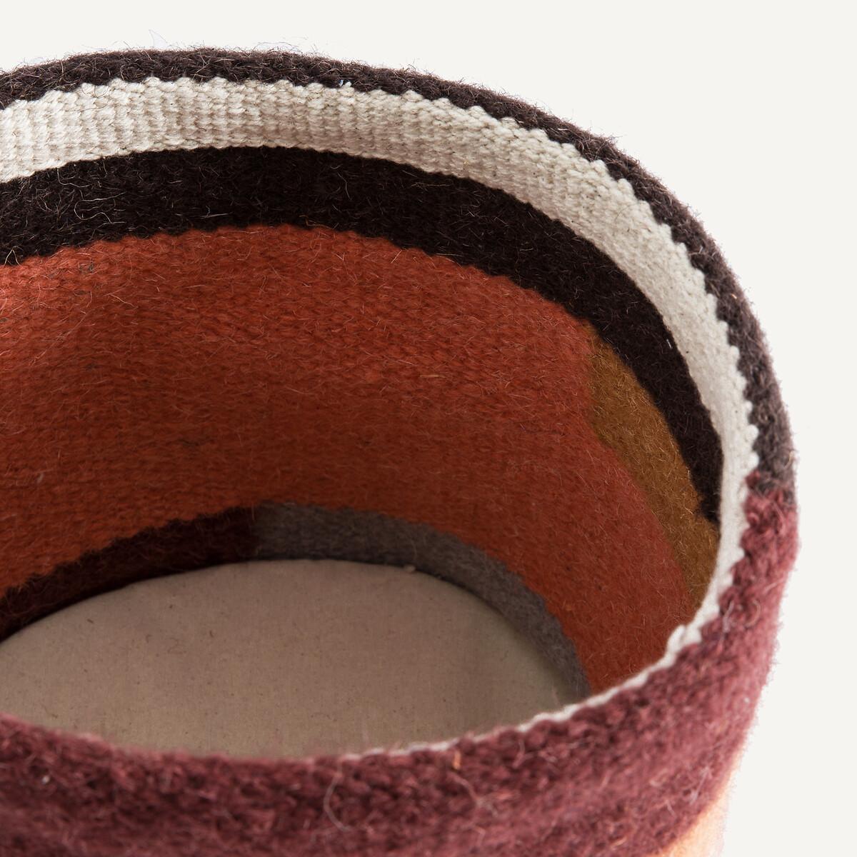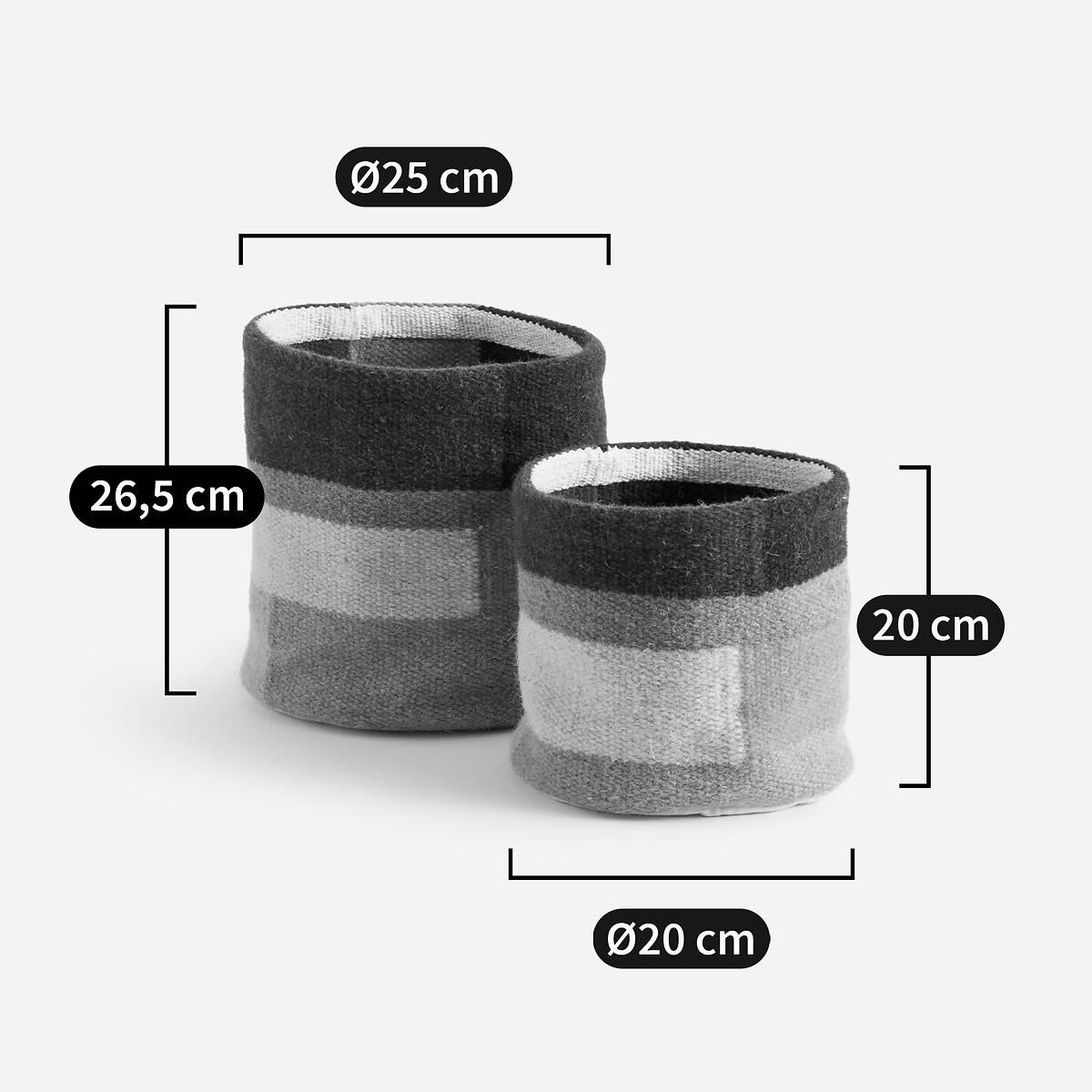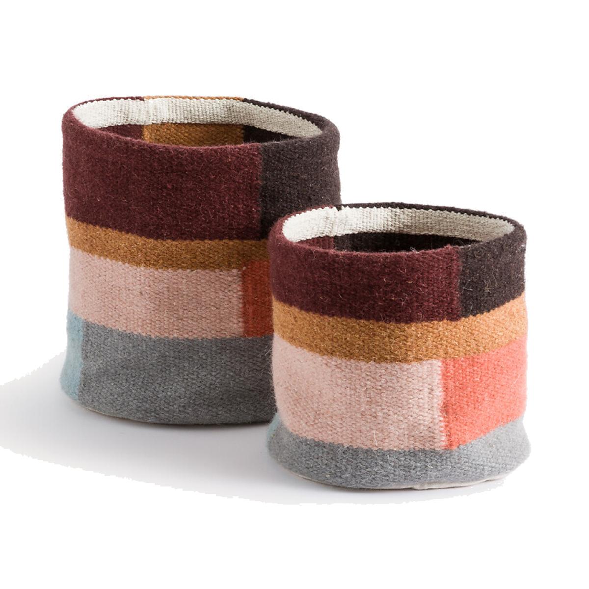 Warm, trendy colours and a woven wool/cotton blend. This set of 2 Kanta baskets brings a change of scene into the home. They're both decorative and practical, in the living room, hallway or bedroom. Stackable, they are easy to store and take up little space. Product Details • Outside:91% wool, 9% cotton • Background: 100% cottonDimensions. Size 1 • Diameter: 25cm • Height: 26.5cm. Size 2 • Diameter: 20cm • Height: 20cm