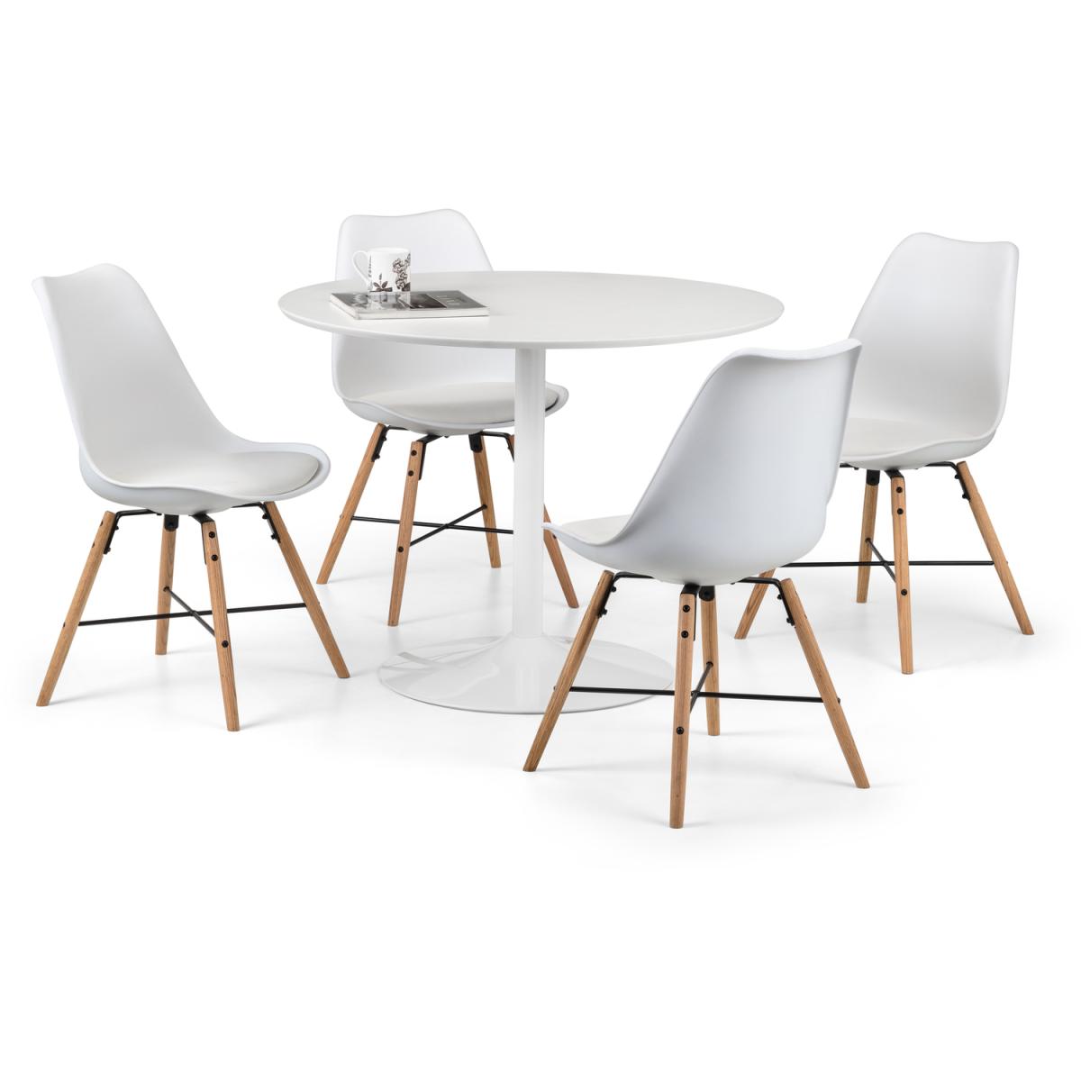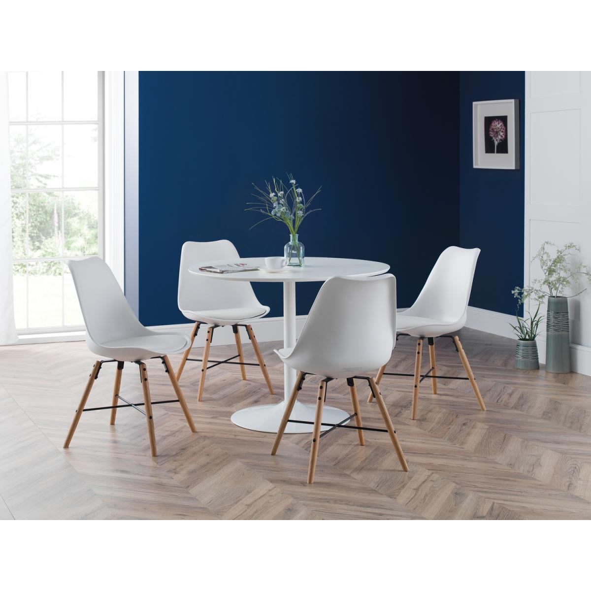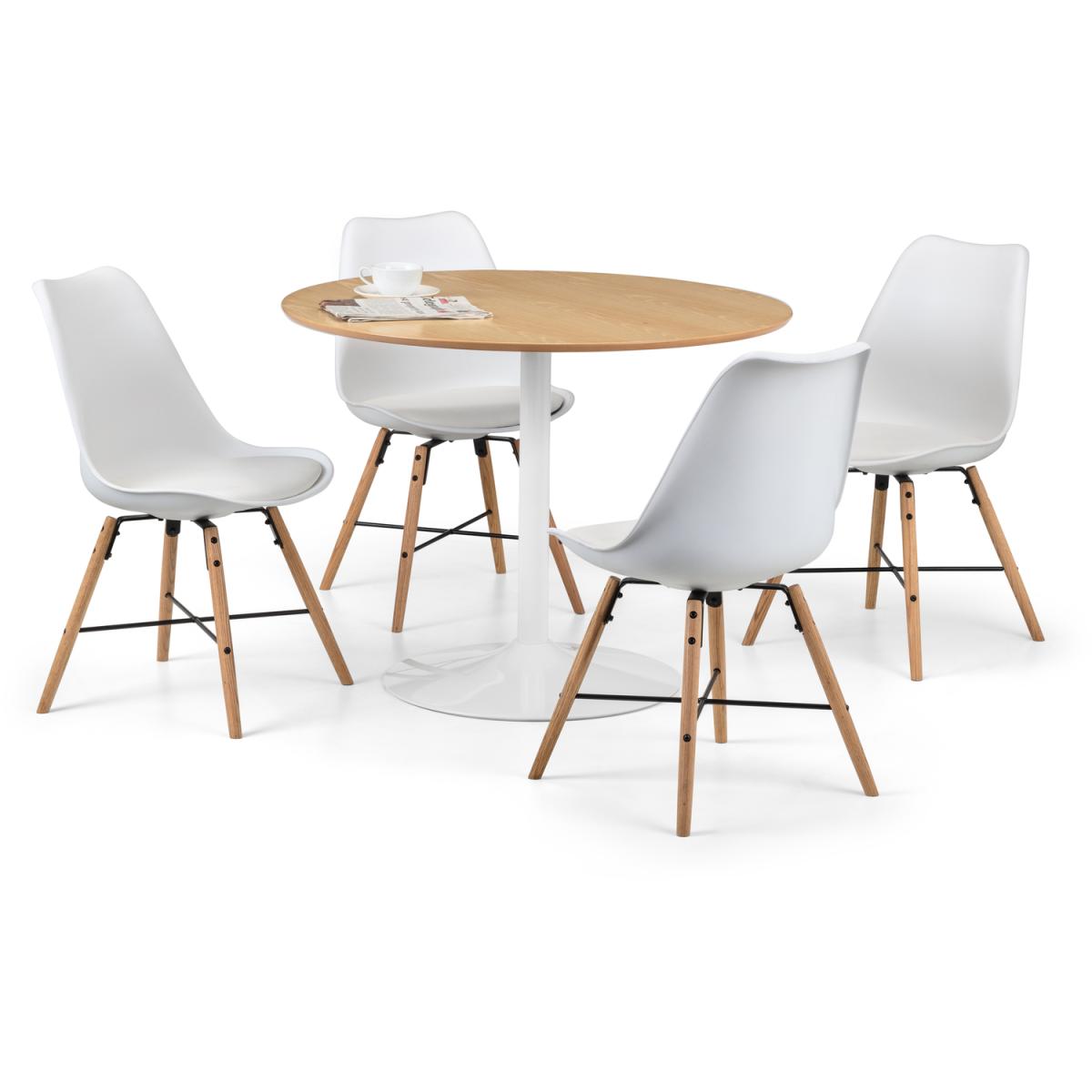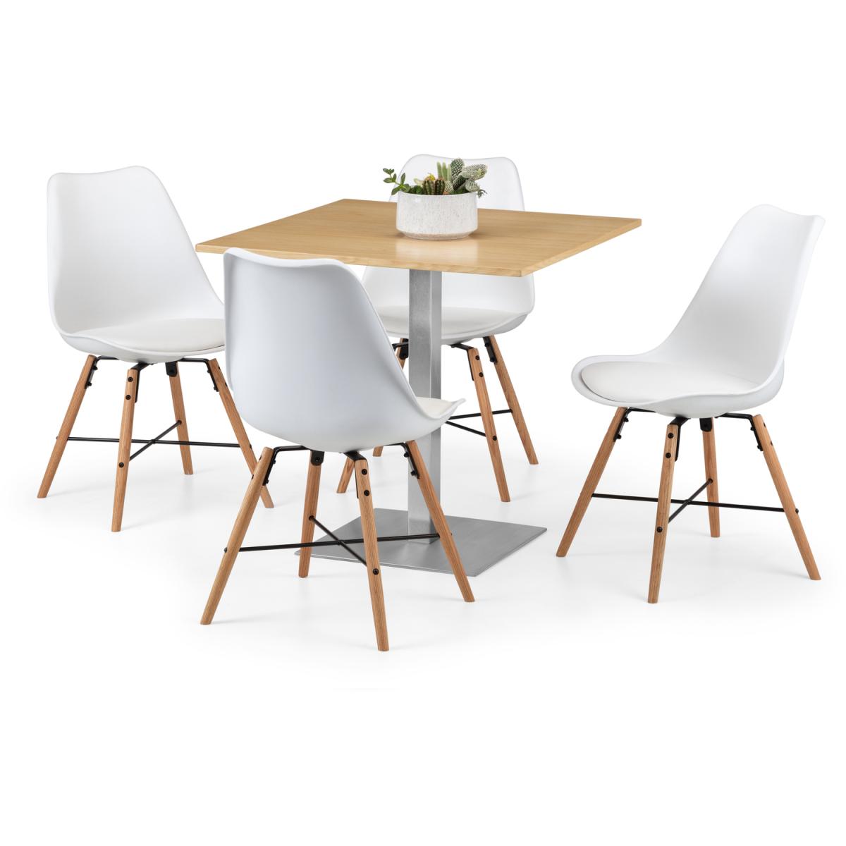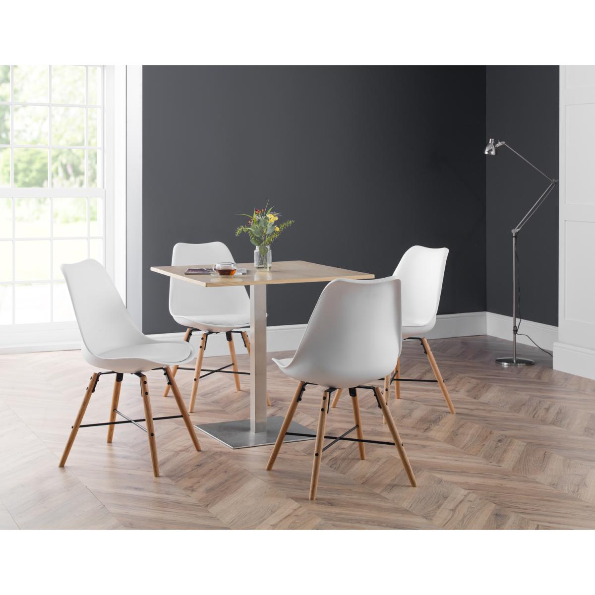 The Kari Dining Chair features a curved design that conforms to the natural curve of the spine, paired with a high-quality padded seat allowing you to reach maximum comfort. Featuring a white, easily-cleaned seat and oak effect legs, with an steel cross bar giving this chair a modern industrial feel.