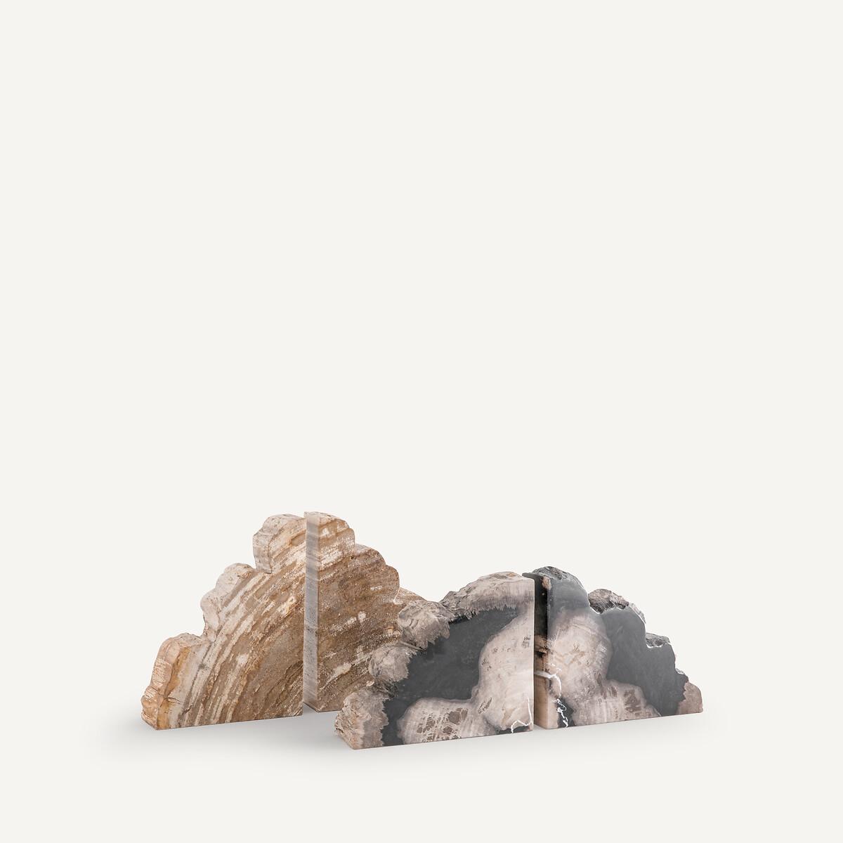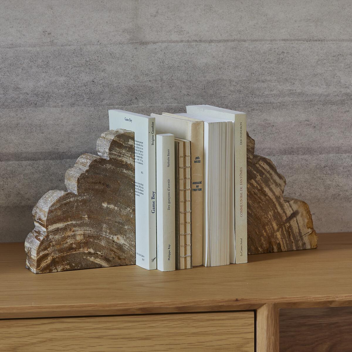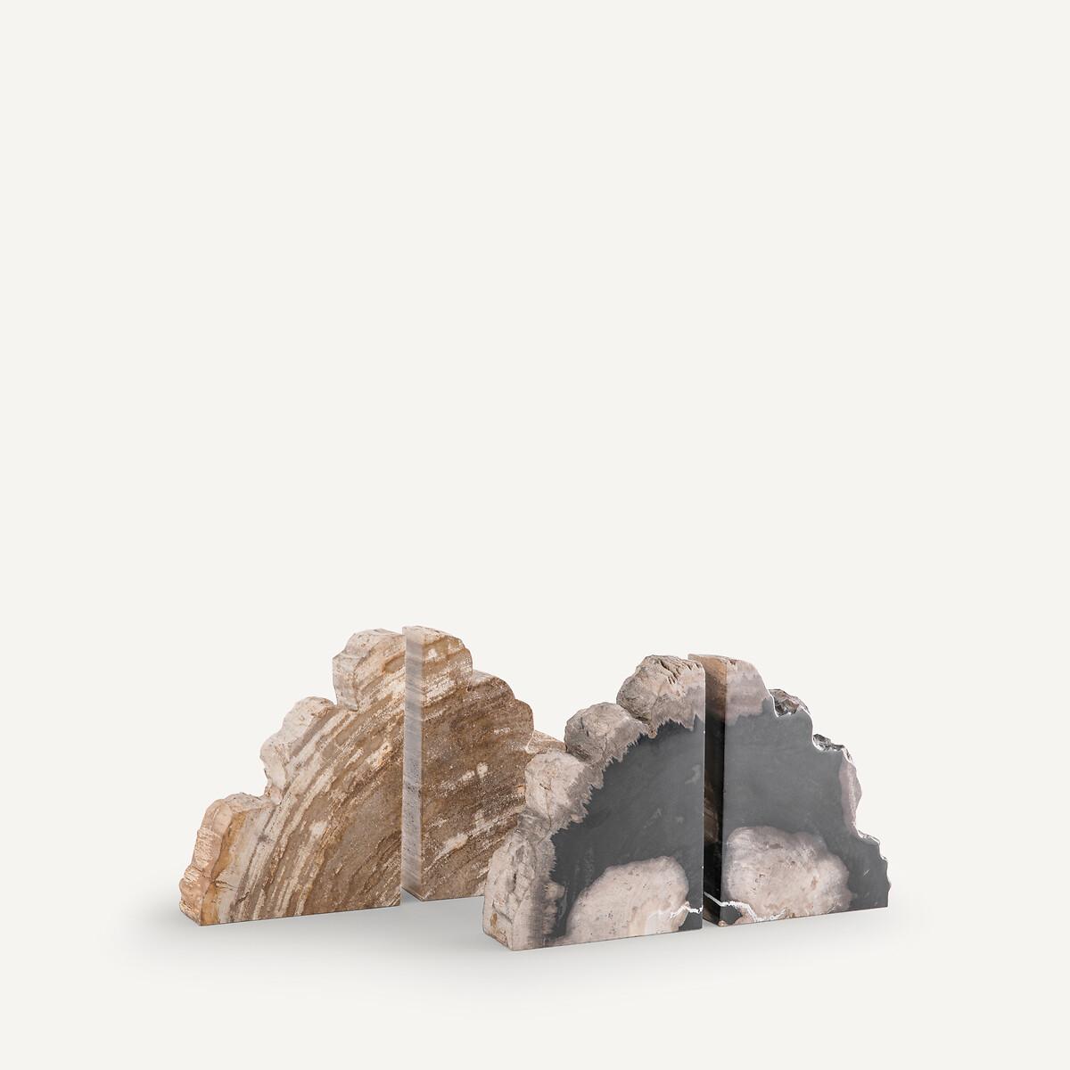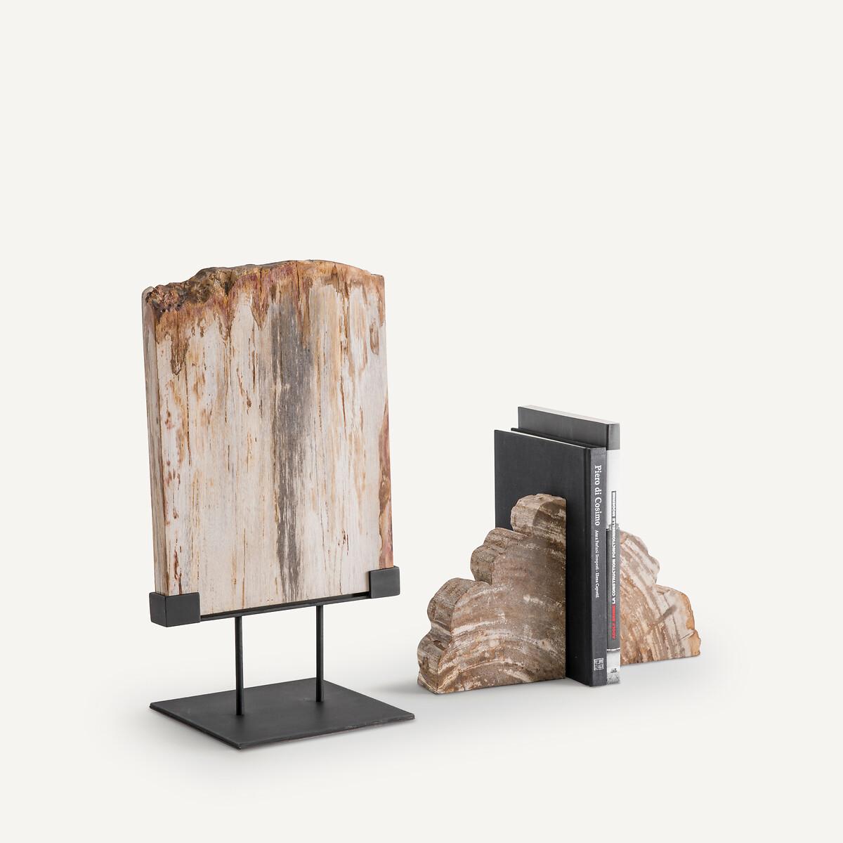 More than a useful and beautiful decorative object, it is a work of art shaped by nature. The growth rings of the petrified tree create an incomparable aesthetic. Each piece is unique and reveals its own colour palette. Between raw naturalness and extreme sophistication. Product Details • Petrified wood • Sold in packs of 2. Quality Info • Petrified wood, also called “fossilised wood”, embodies timeless elegance by revealing the beauty of nature. • Through a long process of fossilisation, organic wood is impregnated with minerals such as quartz, calcite and jasper.. It transforms over millennia into a work of stone, retaining all the details of its original structure.. • Meticulously quarried and polished by hand, each piece of petrified wood is unique. • Its shades can range from grey to red, including beige, brown or even black.. The colour of the product received is therefore random and can vary from the lightest to the darkest tone.. • To preserve its beauty, keep it away from a window exposed to sunlight and rooms subject to extreme fluctuations in temperature or humidity. Care Advice • 1. Clean with a soft, slightly damp cloth. • 2. Ban scrubbing sponges and harsh cleaning products. • 3. Handle it with care: even though it is solid, petrified wood can break or crack if dropped or violently impacted. Dimensions. Each piece: • Width: 18cm • Height: 28cm • Depth: 5cm Parcel dimensions and weight • 1 parcel • L42 x H27 x D34cm. 5kg