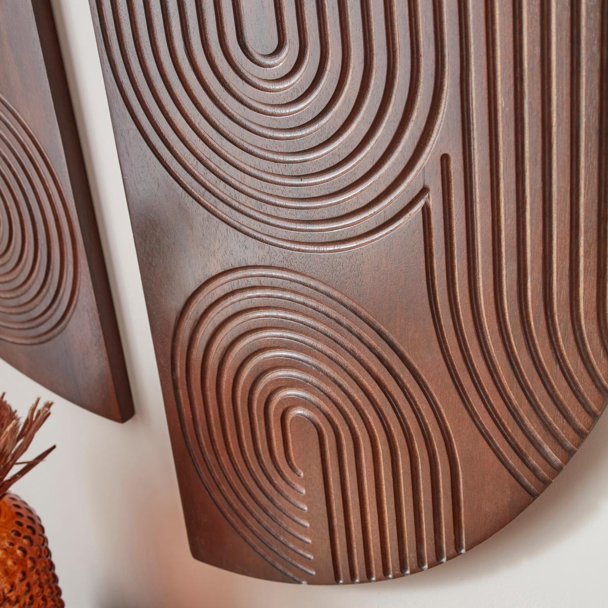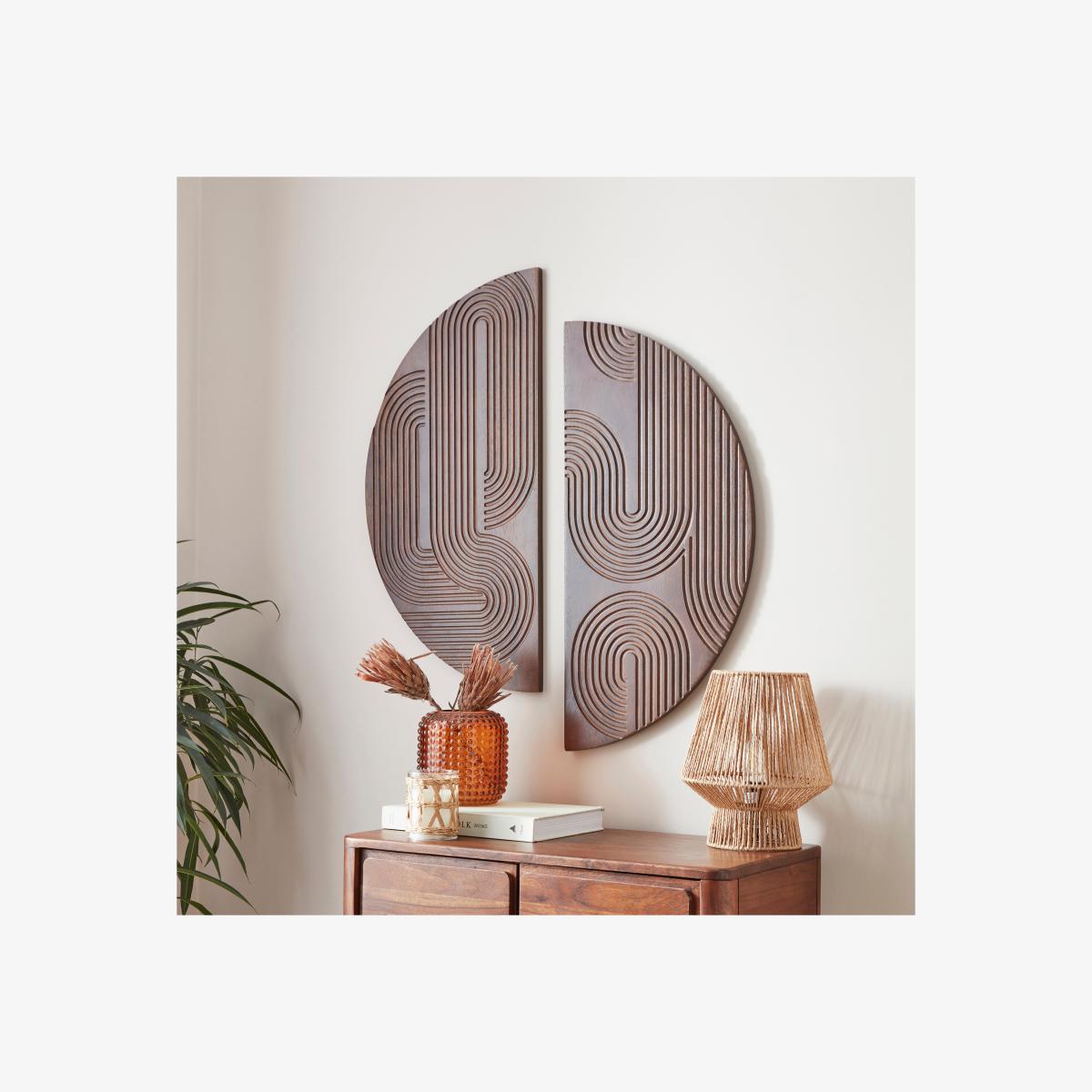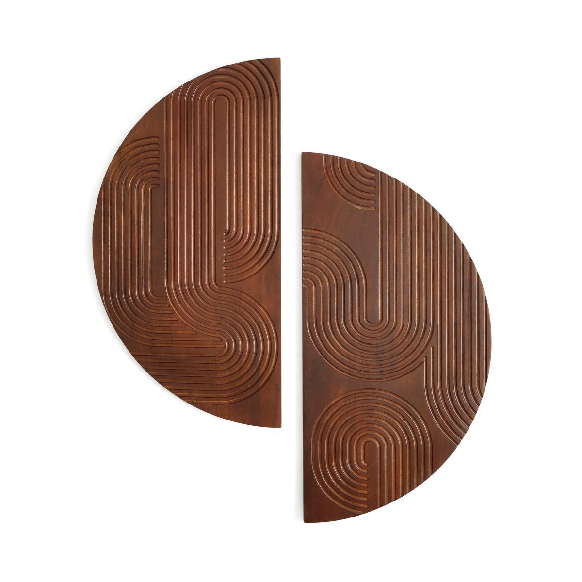 * Carved mango wood* Set of 2* Half circle designs* Indoor use Bring geometric style and earthy tones to your space with this set of 2 Khari wall art. The carved curving lines give this mango wood piece movement and visual interest. Both half circles make a lovely statement when hung together or would create a cohesive look to your interior if hung separately.