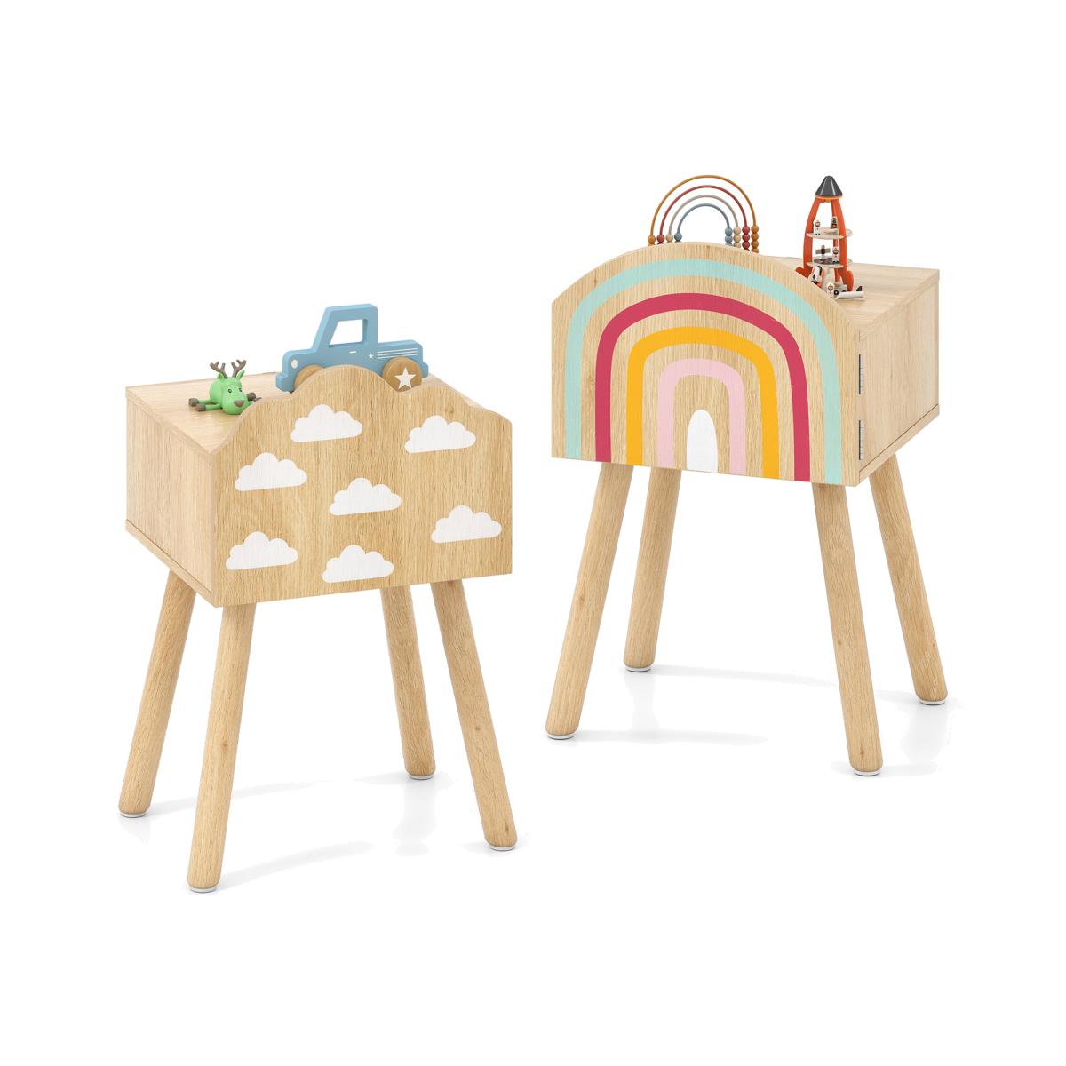 Upgrade kid's living space with our 2 pcs nightstands! Decorated with delightful rainbow and cloud patterns, the end tables add a splash of color and whimsy to any kid's bedroom, playroom, kindergarten, or nursery. The top area and enclosed cabinet can store kid's books, toys, blocks, and more. Furthermore, the solid wood legs with anti-slip foot pads keep the nightstand steady and stable. The anti-toppling design ensures enhanced stability and avoids tipping over for higher security.