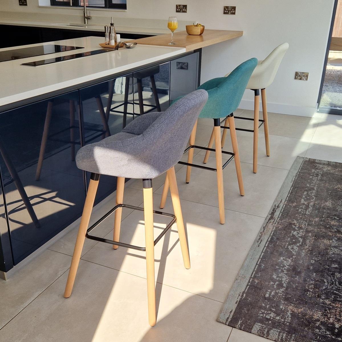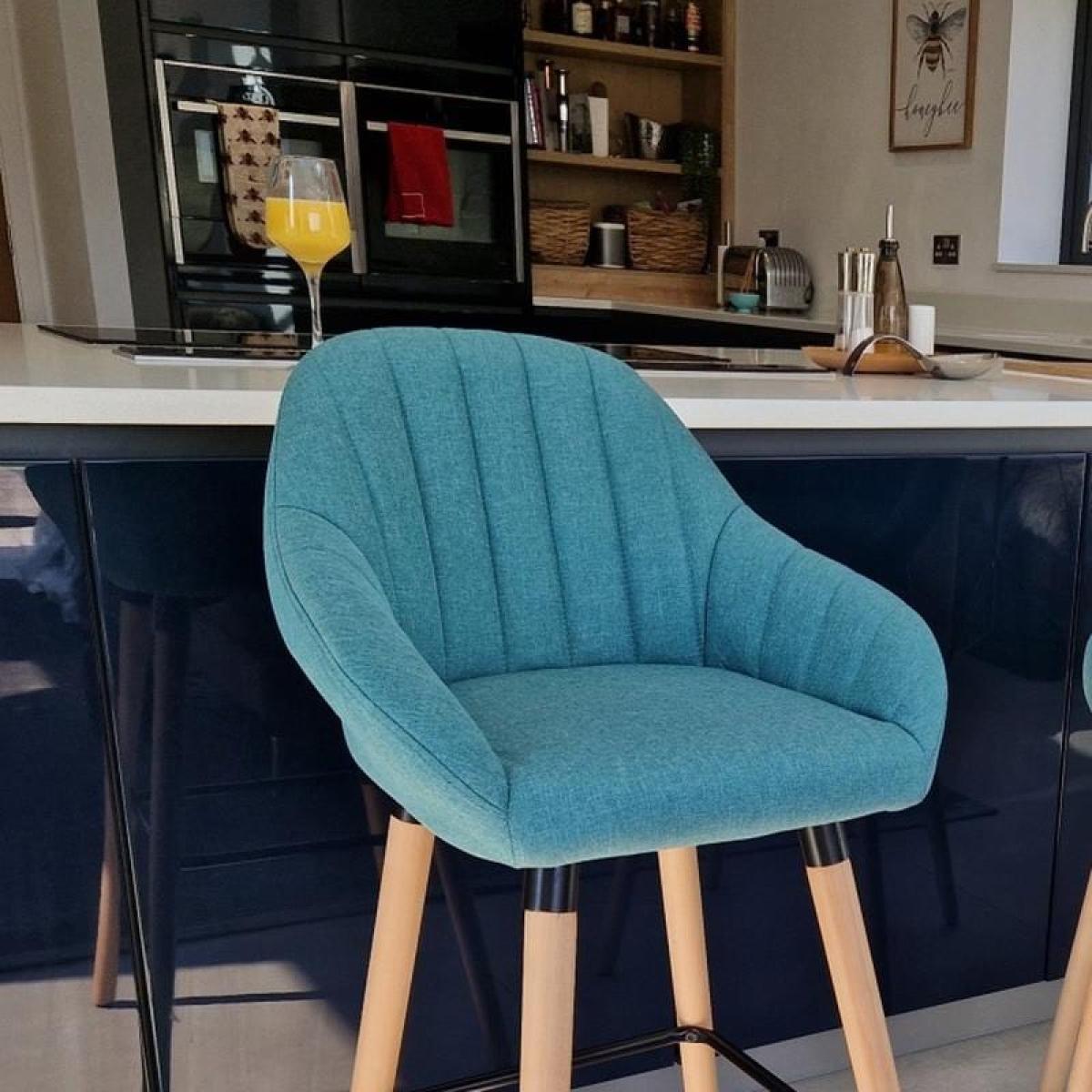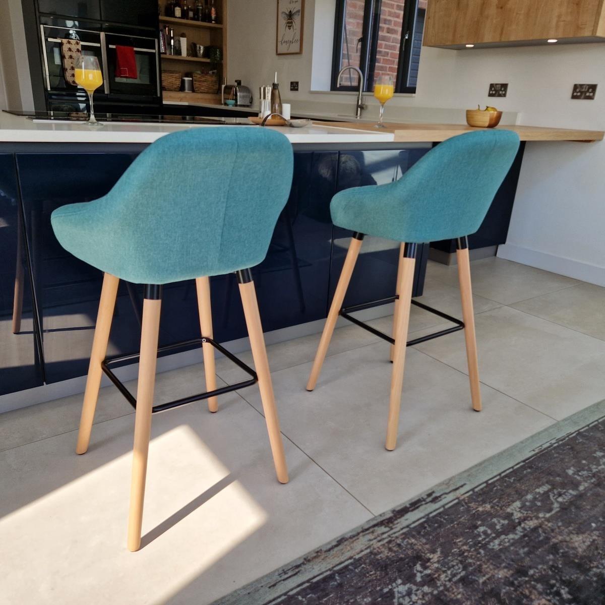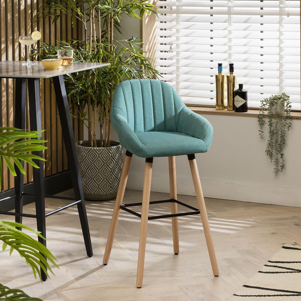 Elevate your home bar or kitchen counter with this set of 2 stylish and comfortable Green Fabric Bar Stools with Backs, Quilted Line Detailing, and Wrap-Around Arms. The modern bar stool boasts a timeless green fabric upholstery that effortlessly complements any interior decor with wooden legs for a rustic touch. Designed with your comfort in mind, the wrap-around style low arms provide extra support and a cosy feel while you enjoy a drink or engage in conversation. The bar stool also features a convenient backrest that promotes good posture and relaxation. The natural color wooden legs add a touch of rustic charm to your space, blending seamlessly with various design themes. Not only does this bar stool excel in aesthetics and comfort, but its durability is also second to none. The smooth finish on the wooden legs not only enhances its overall look but also ensures easy cleaning and maintenance. The thoughtfully integrated footrest adds an extra layer of comfort, allowing you to sit back and unwind for longer periods without any discomfort. Upgrade your kitchen bar or island with this set of Green Fabric Bar Stools with Quilted Line Detailing and Wrap-Around Arms. Whether it's for casual gatherings or everyday meals, this bar stool combines style, comfort, and functionality in one delightful package. Add a touch of elegance to your space while enjoying the utmost comfort. W52cm D49cm H99cm Seat Height 72cm Set of 2 kitchen bar stools