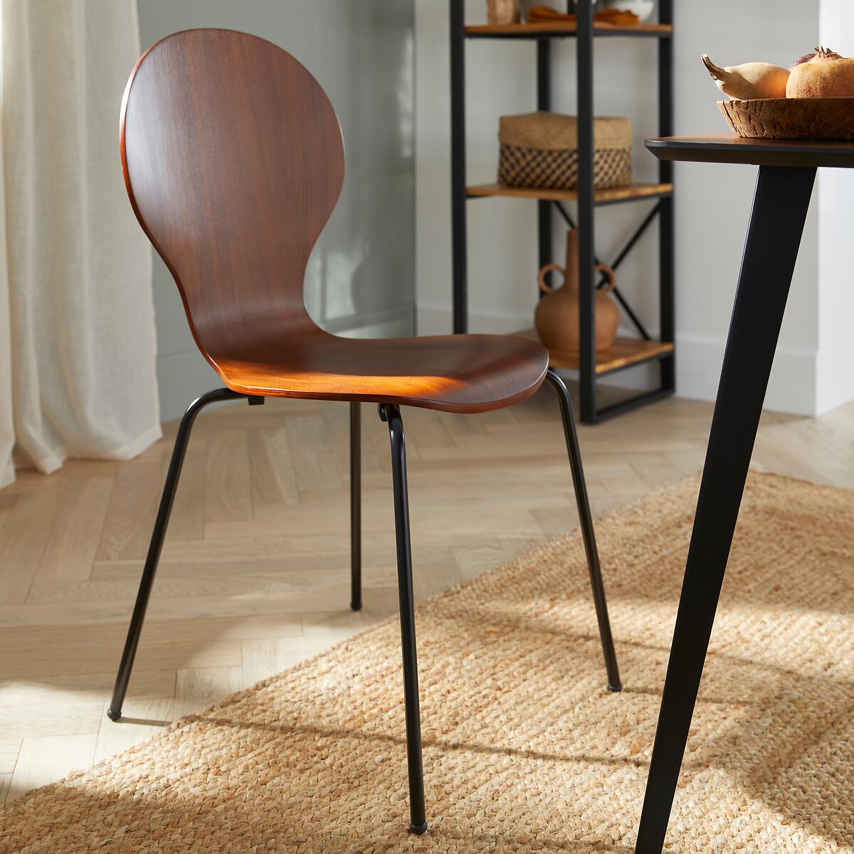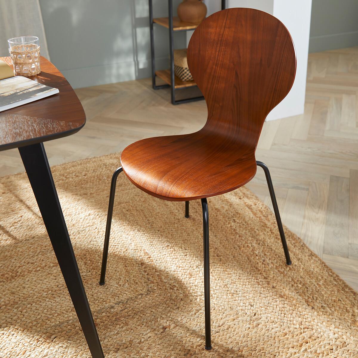 I’m a big fan of the Lenon stackers for their sleek, mid-century silhouette and warm walnut veneer paired with slim black legs. They slot effortlessly into everything from a pared-back Scandi dining space to an industrial-inspired kitchen or even a compact home office, and the fact they stack means you can store extra seating without clutter. For styling, team them with a round oak table and muted linen placemats to keep the look light, or introduce contrast with a cool concrete-top surface. A simple faux-sheepskin draped over the back adds instant cosiness, while a small potted plant or sculptural vase on the table will highlight the chairs’ clean lines.