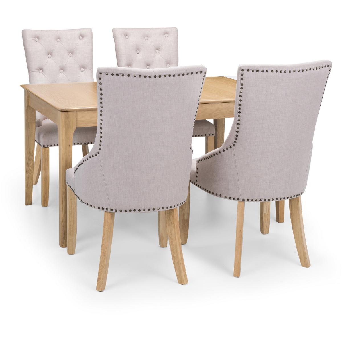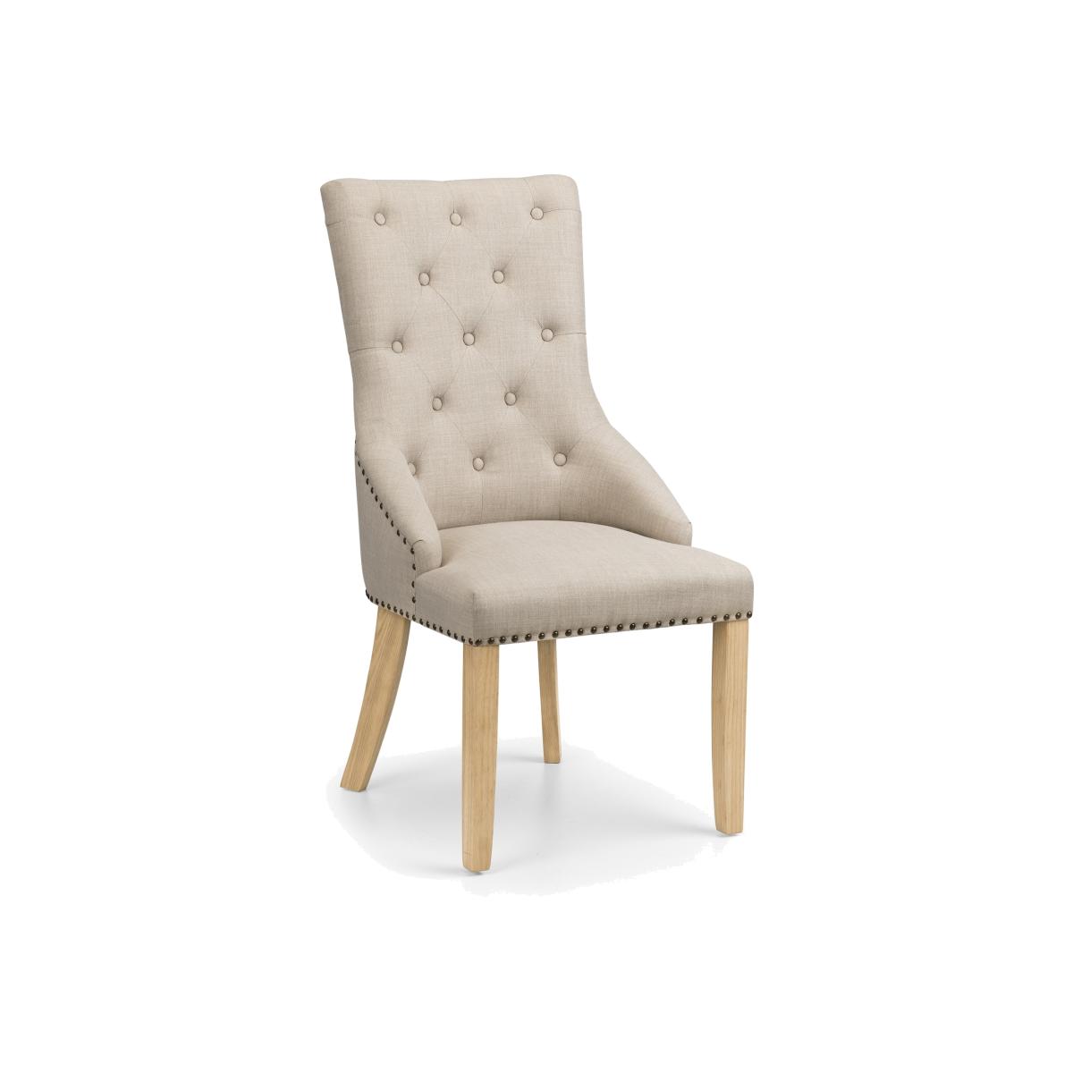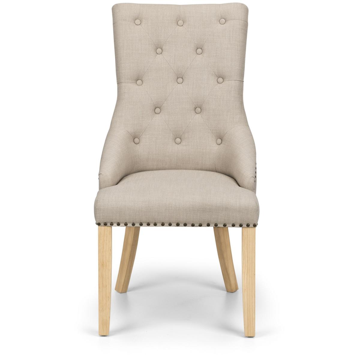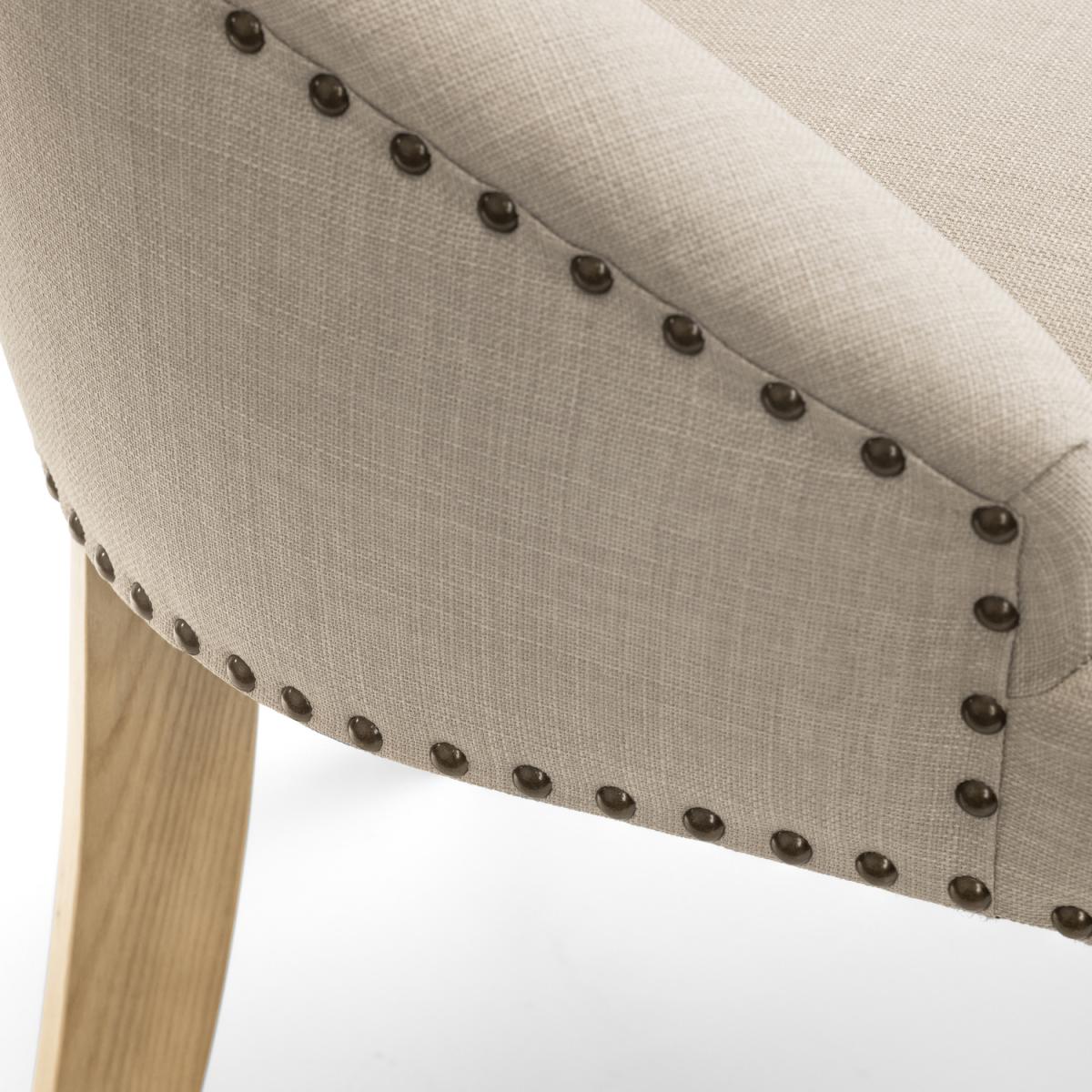 Upholstered in a luxurious oatmeal linen fabric, the Loire Button Back chair features elegant deep buttoning and a metal stud trim. Finished with sturdy natural lacquered legs, this chair is perfect as a statement standalone or as part of a dining set.