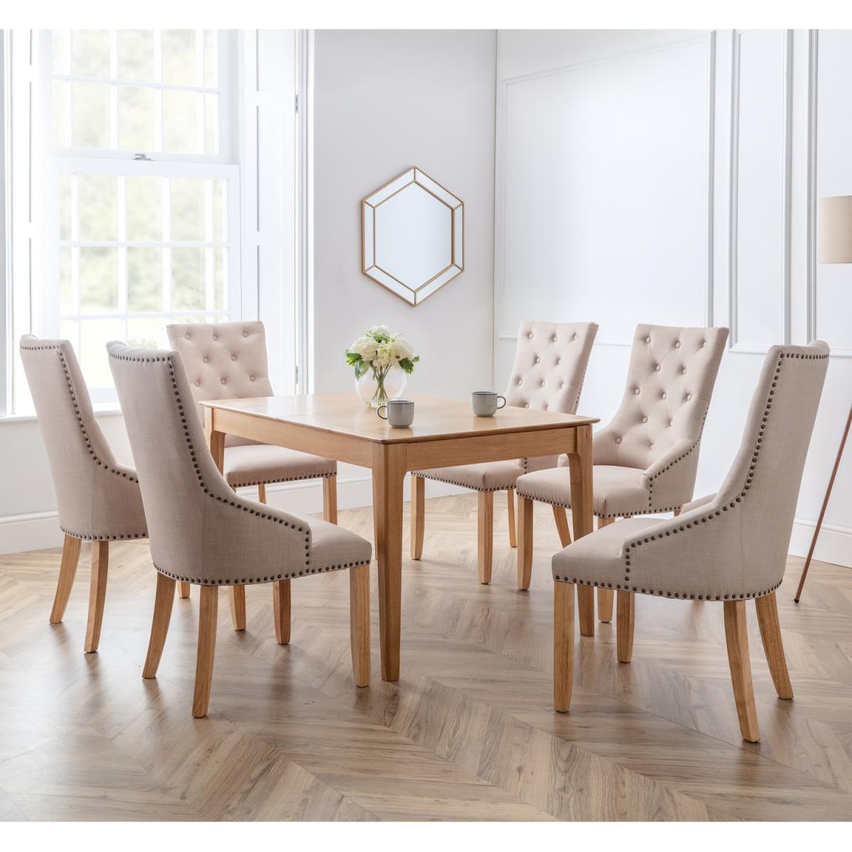 I’d recommend these Loire chairs for anyone after a versatile, neutral seat that blends with both contemporary and country-style schemes. The button-back detail and linen-look fabric introduce subtle texture without competing with bolder accents, while the pale oak legs lift the design and keep the room feeling airy. Pair them with a solid wood dining table or mix into a relaxed home office, then balance their shape with a soft woollen throw or a small lumbar cushion in a contrasting tone.