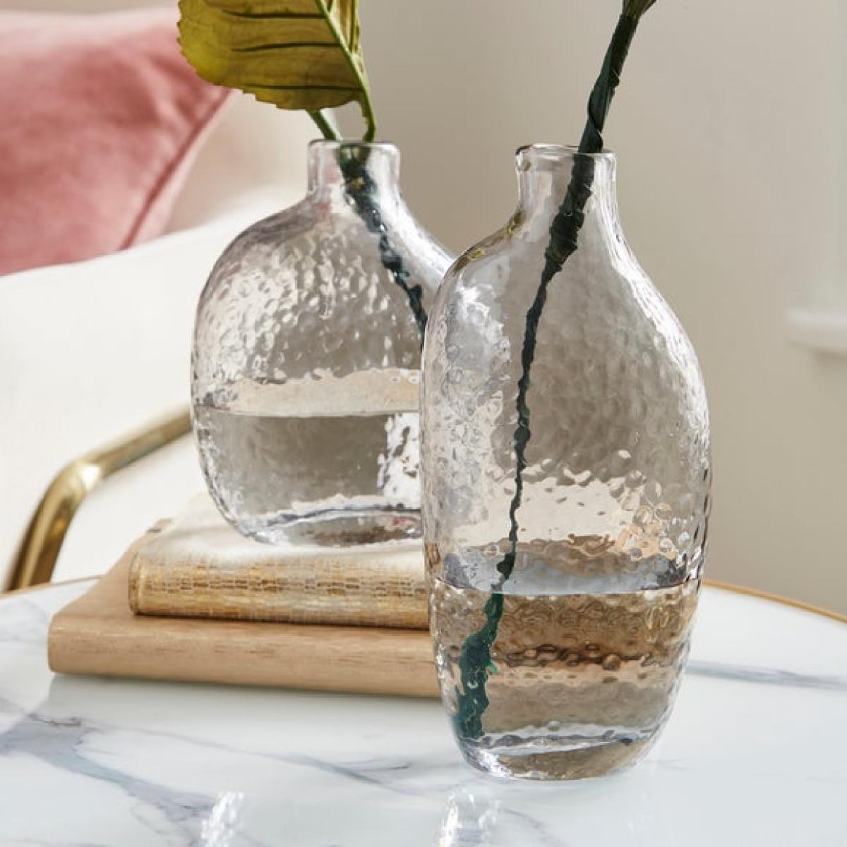 I love these little vases because of their versatile, modern look and hammered glass finish, which adds subtle texture without overpowering your décor. They’re perfect for creating minimalist displays on a side table or windowsill, especially with fresh or faux flowers to bring a touch of natural colour indoors. These vases work well in contemporary, Scandi, or even boho interiors, where their clean lines can be paired with greenery or delicate blooms for a simple but stylish centrepiece. Practical styling tips include grouping them together with different-height arrangements or using one for a single stem to keep the look pared-back and elegant.