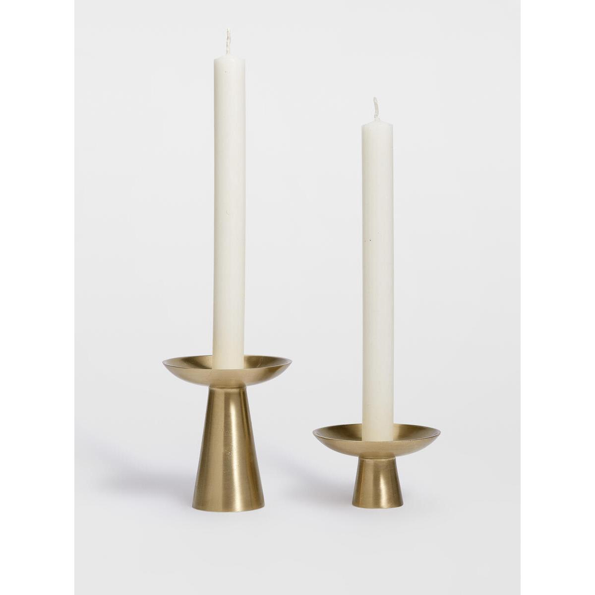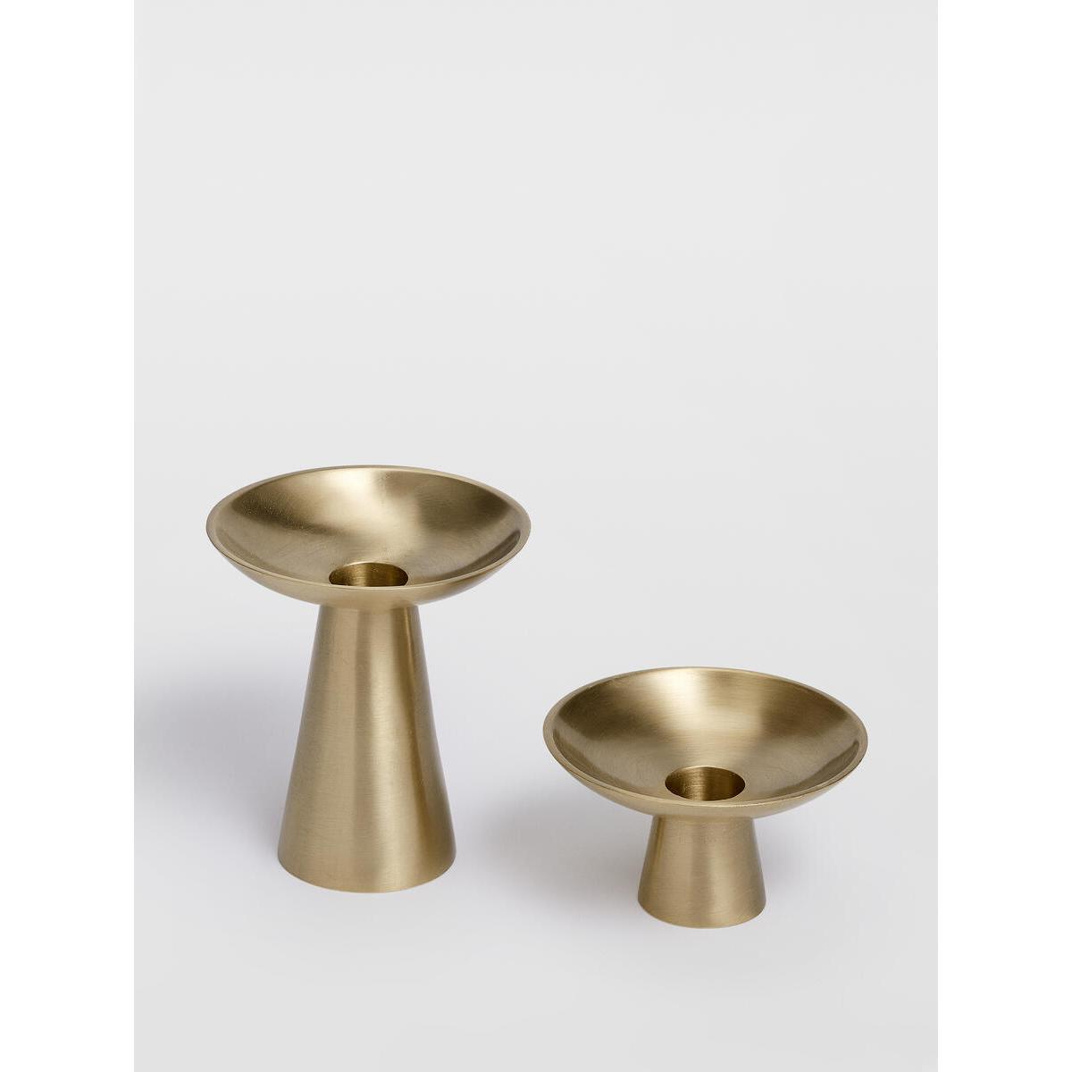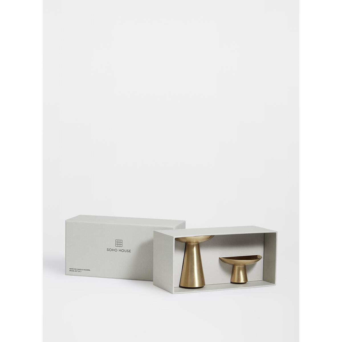 The Marlton brass candleholders take their inspiration from 180. House. Each one is made in India and crafted from brushed brasswith a dome-shaped base to display dinner candles. Brass candleholders. Set of two. Small and large size. Brushed brass. Made in India. Inspired by 180 House.