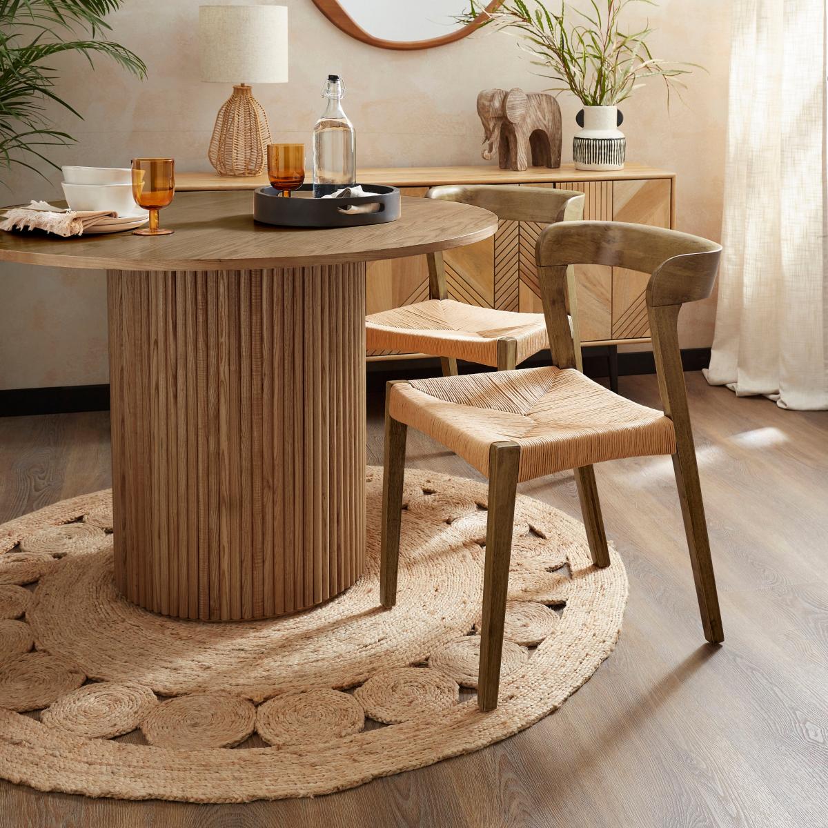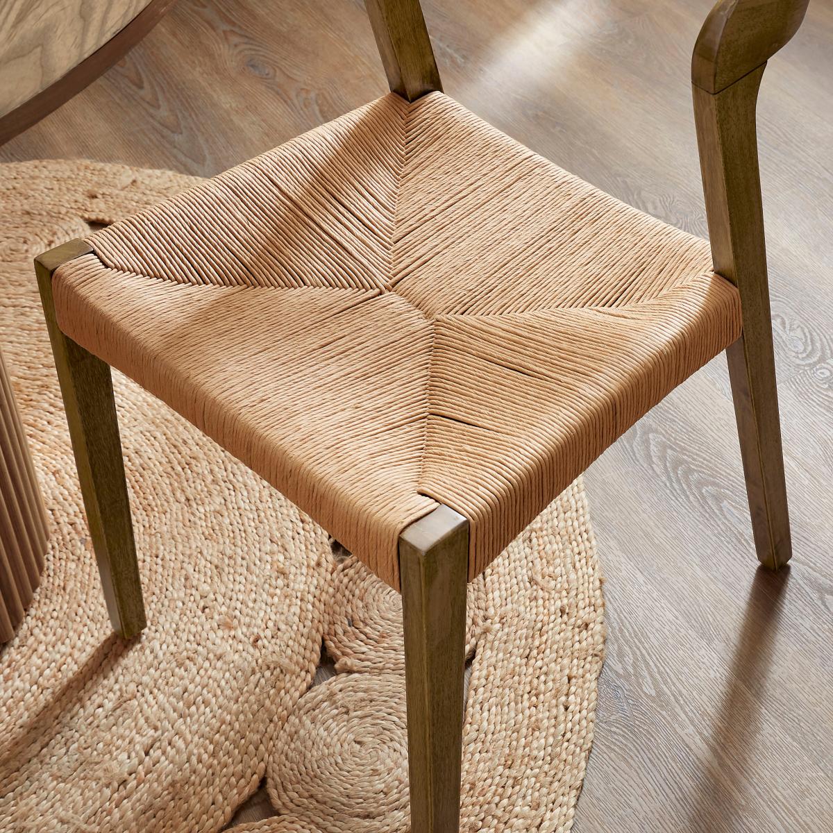 I’m a fan of these dark-stained wood dining chairs for their clean lines and the way the woven seat adds texture without fuss. They sit comfortably in contemporary Scandi schemes or more organic, boho-inspired dining rooms, and the deep finish pairs especially well with pale oak or marble-effect tables. To style them, mix in a natural-fibre rug below to echo the seat’s weave and soften the look. A runner of linen or a couple of muted, linen-blend cushions will introduce extra comfort and a hint of pattern. Keep tableware simple - think white or terracotta ceramics - so the chair’s craftsmanship remains the focal point.