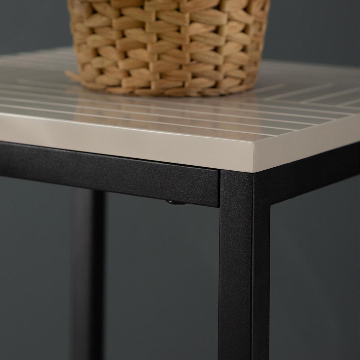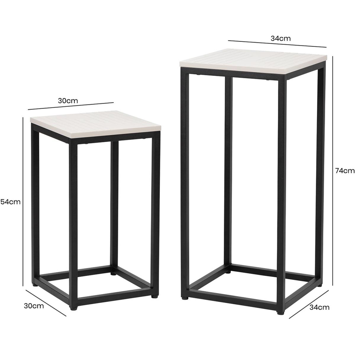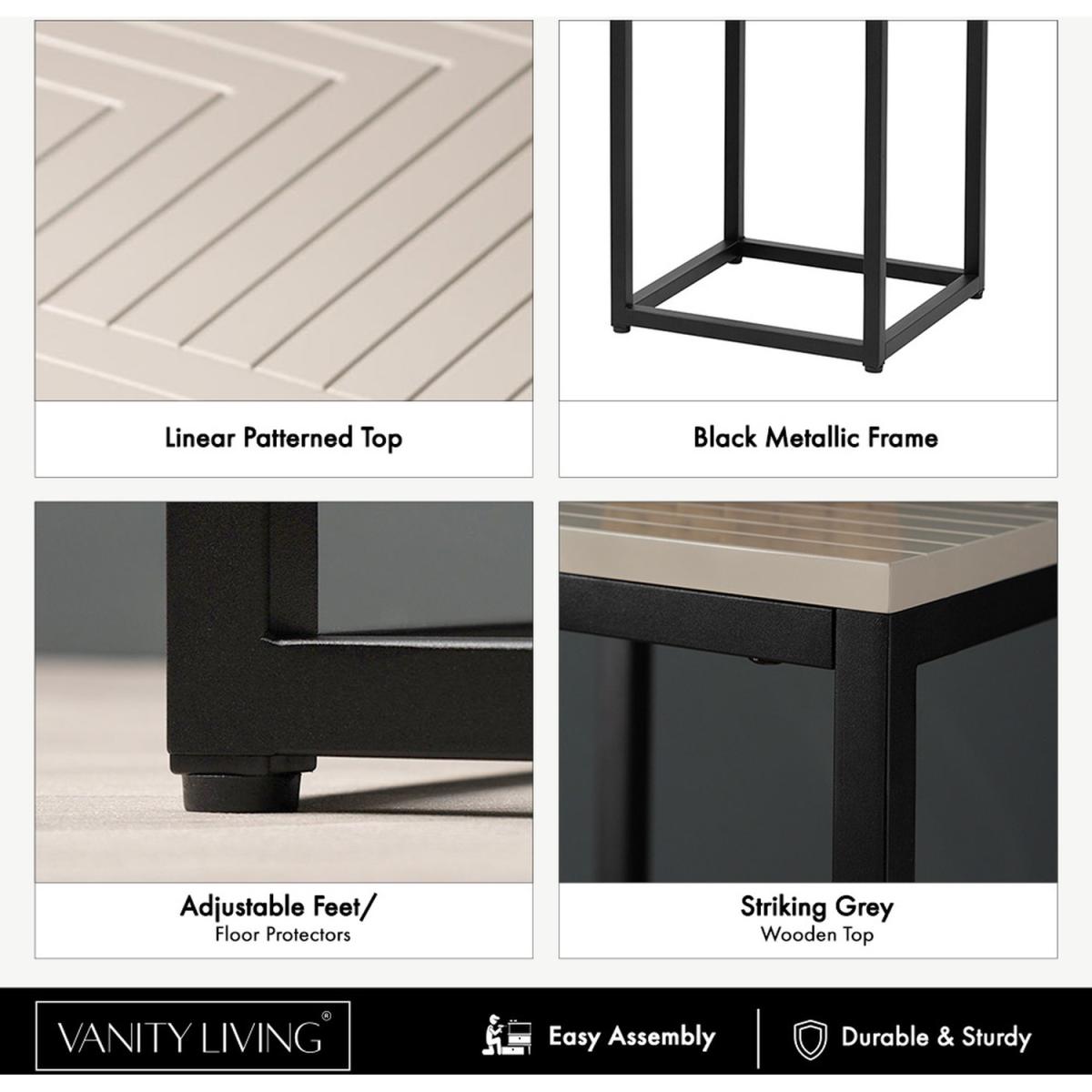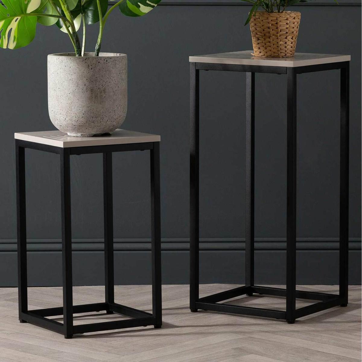 Introducing our gorgeous set of two plant stands, which are ideal for giving any living space a touch of class and usefulness. These stands are not only enduring but also adaptable, with strong black metal frames and a gorgeous grey wooden top with a linear patterned finish. These classy pieces can also be used as occasional or display tables, giving you plenty of room to display your favorite decorative objects or act as a practical tabletop for a cup of coffee or book.