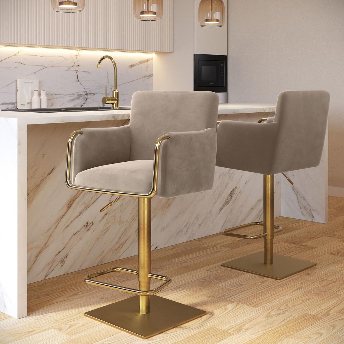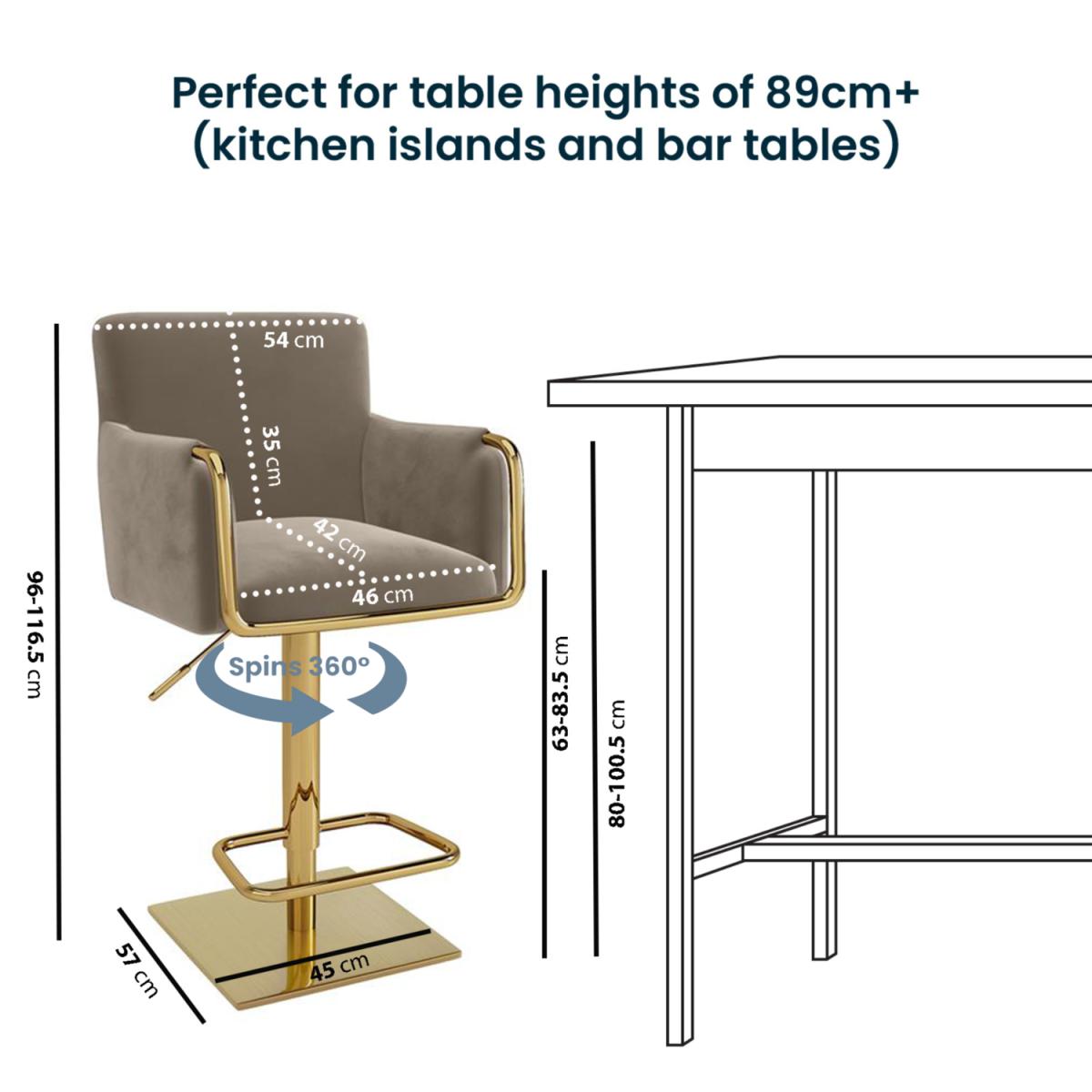 Upholstered in soft and smooth mink velvet, offering a plush, sophisticated look that enhances any space. Effortlessly customise the stool's height to suit your needs with an easy-to-use lever, making it ideal for various counter or bar heights. 360-degree swivel functionality allows for seamless movement and flexibility, perfect for entertaining or casual use. The brushed gold base not only adds a touch of glamour but ensures exceptional stability and durability. Designed with an extra-large seat and supportive backrest, offering supreme comfort for extended periods of seating. Elevate your home bar or kitchen island with these Sonny Adjustable Barstools. Wrapped in smooth mink velvet, it exudes a refined elegance that pairs beautifully with the brushed gold base. Designed for both style and functionality, these barstools features an adjustable height mechanism, allowing you to tailor it perfectly to your setup. Its 360-degree swivel function offers ease of movement, while the extra-large seat and supportive backrest ensure comfort during extended use. Whether you’re entertaining guests or enjoying a quiet moment, these Sonny Barstools are the perfect combination of luxury and practicality. Number of Stools: 2 Dimensions: W55 x D57 x H96-116.5 cm Seat height: 63-83.5 cm Weight: 19.65 kg Max supported weight: 150 kg Colour: Mink and gold (legs) Material: Velvet and solid iron (legs) Assembly required: Yes Packaging dimensions: W57 x D57 x H51 cm Packaging weight: 22.35 kg For domestic use only. Domestically UKFR certified.