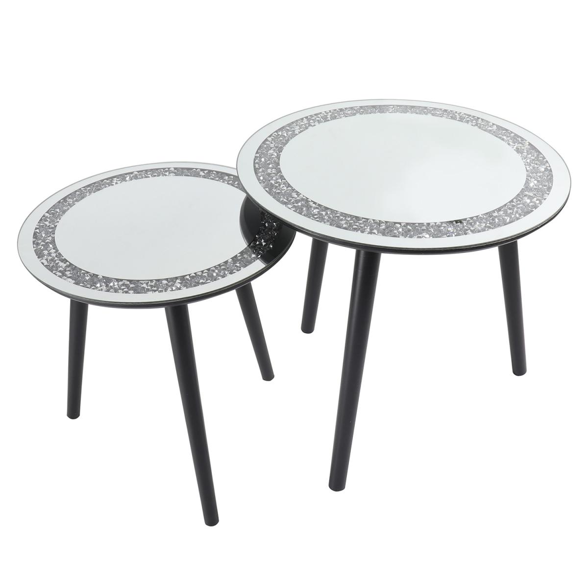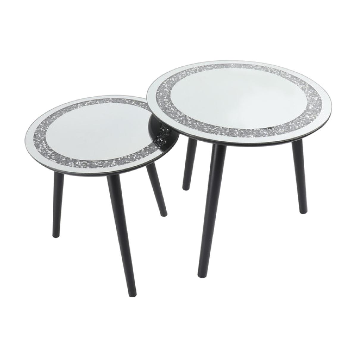 Enrich your living room with the extravagant style of this Set of 2 Mirrored Crystal Side Tables. Featuring jet black legs topped with 4mm of reflective chrome glass and decorated with a glamorous crystal border, these stunning circular nesting tables bring opulence and class to any space. Functional as well as eye-catching, they offer an ideal surface to rest drinks, remotes, and other items on and can be easily stored away to save space when not in use.