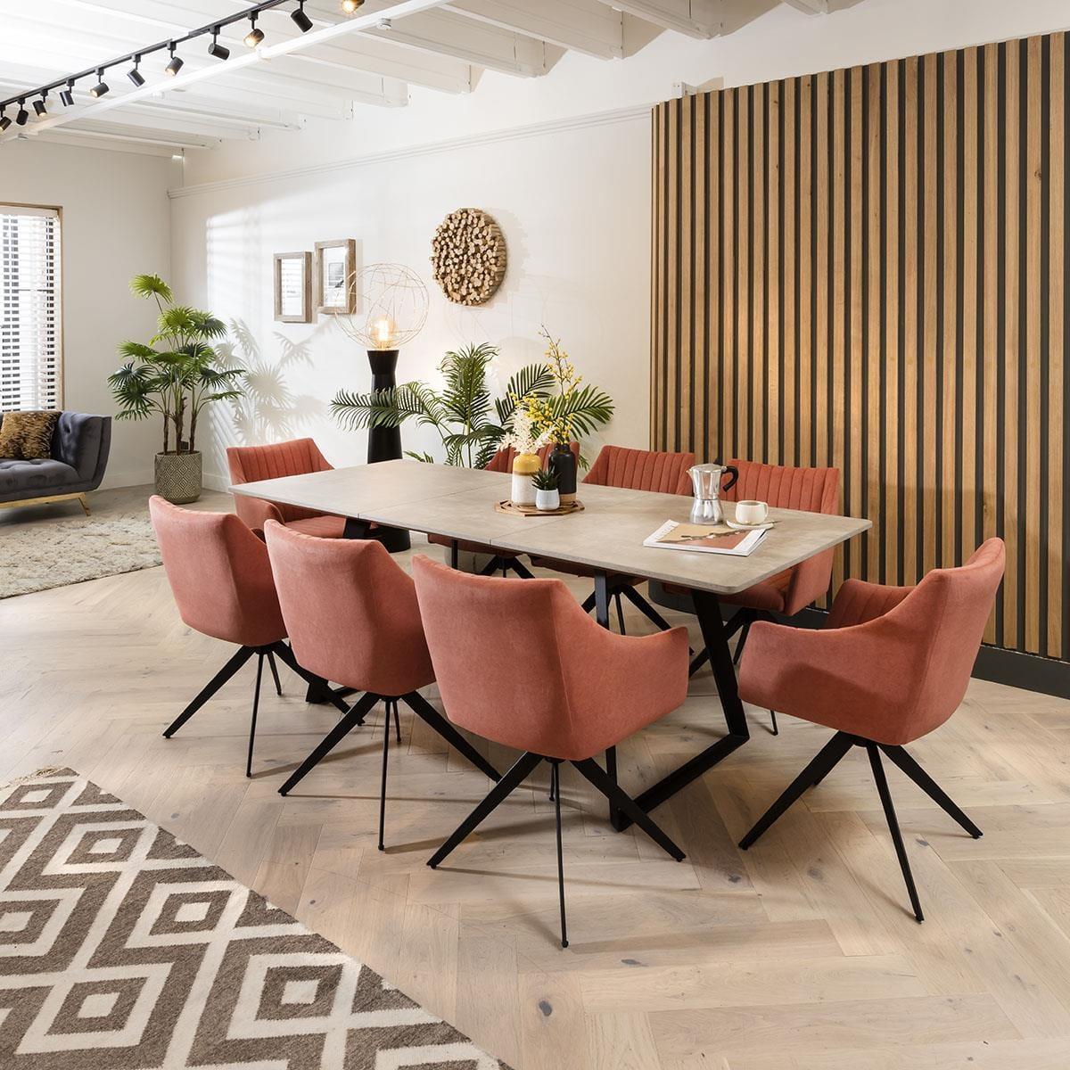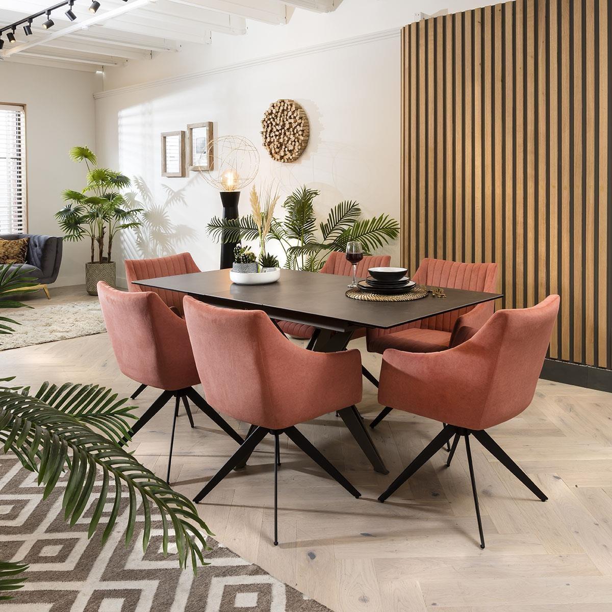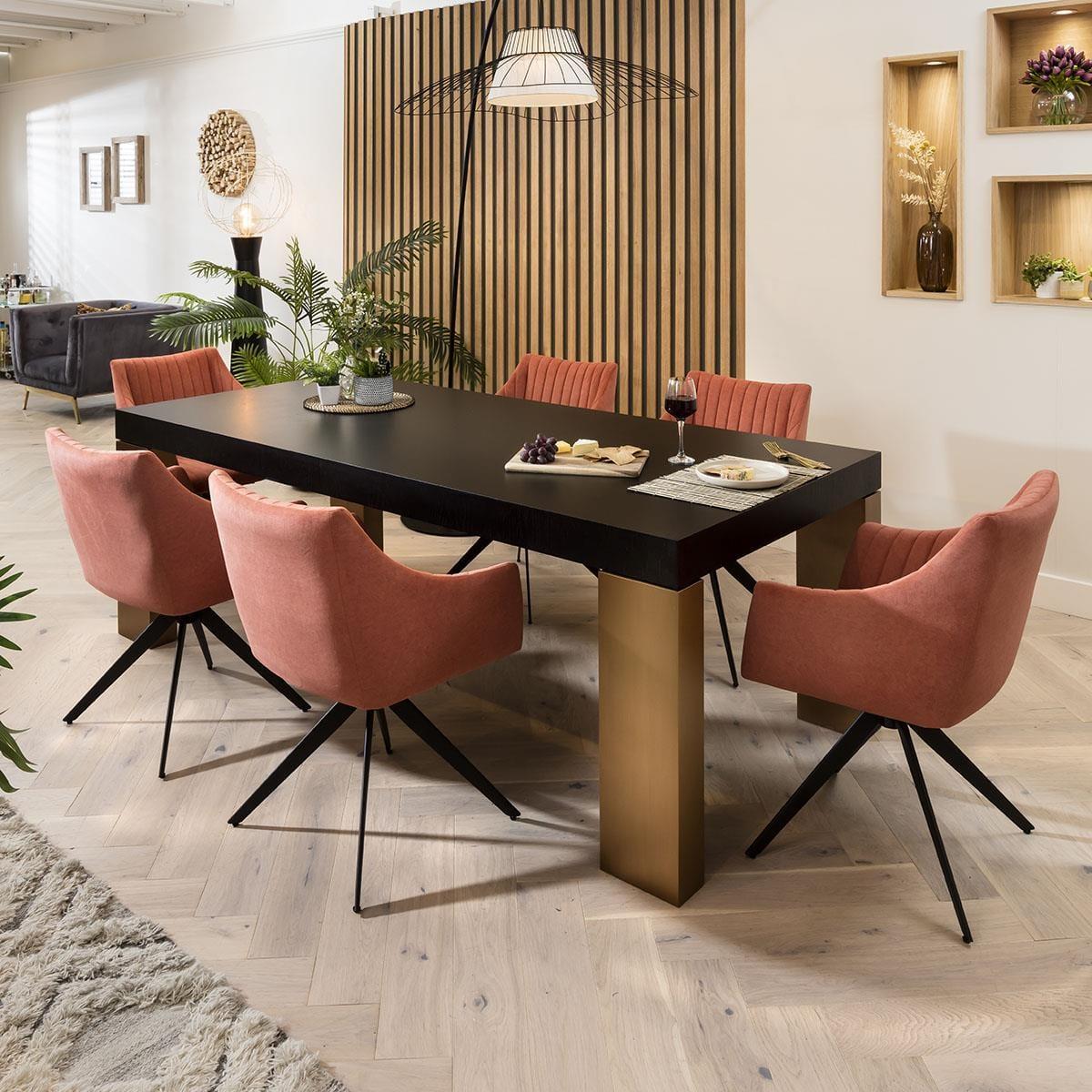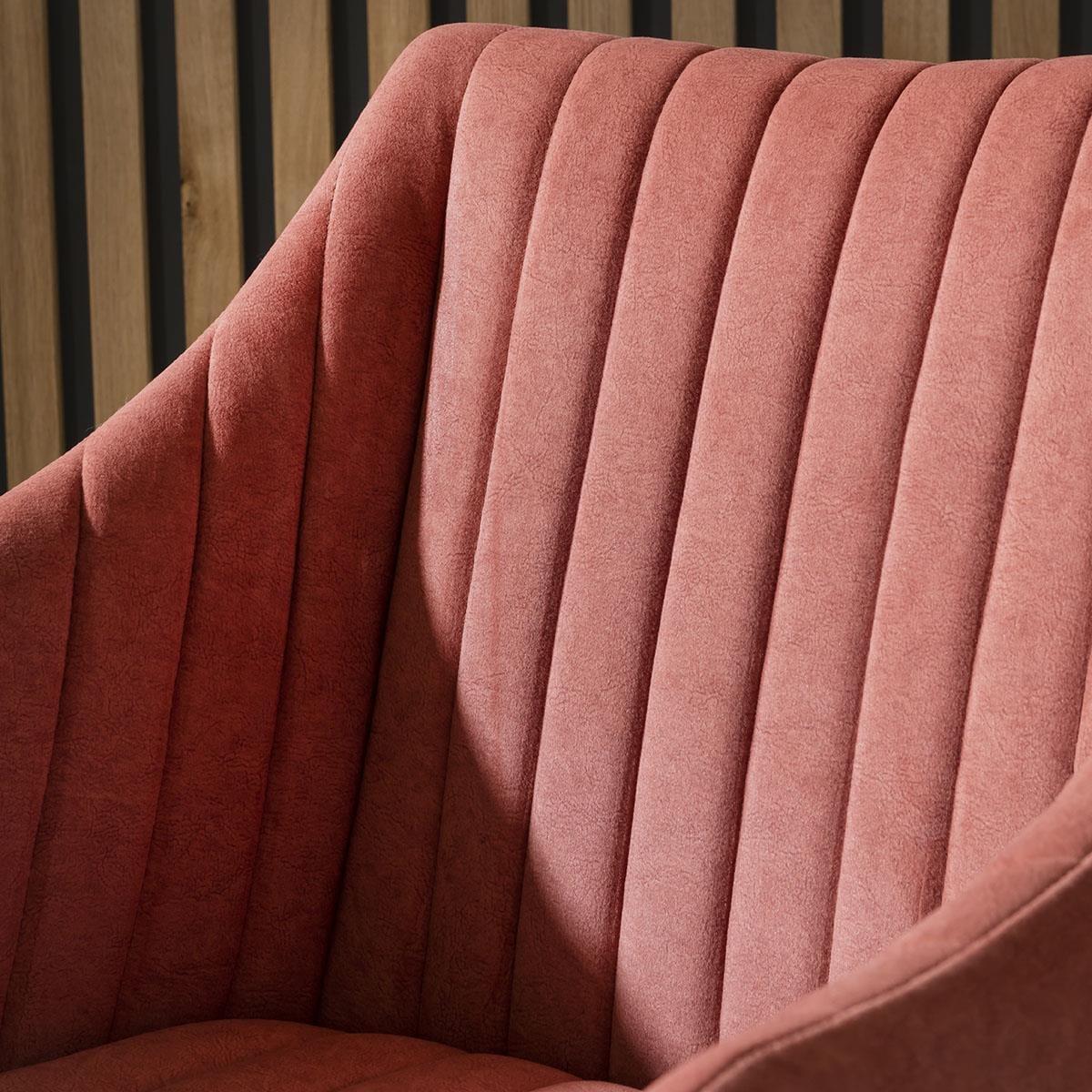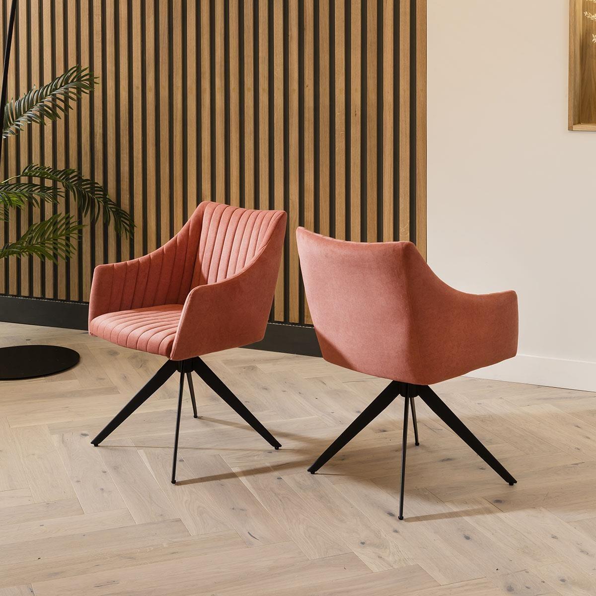 A real gem at the dining table, these modern swivel carver dining chairs with arms with medium backrests and armrests all covered in premium pink fabric, ensuring particularly high comfort. The unique cocooning shape lets you sit back snugly and the swivel base makes it super easy to go in and out of the dining chair. Channel tufted dark grey fabric upholstery and foam cushioning ensure you'll want to stay. The chair is upholstered with a premium fabric and has a black powder coated base - both fit perfectly in any modern interior. For an added touch of practicality, the swivel seat allows for seamless socialising. Elegant yet edgy, this chair is sure to add a very luxurious and rich appearance to any dining room. W60cm D61cm H83cm Seat Height 48cm Swivel Base