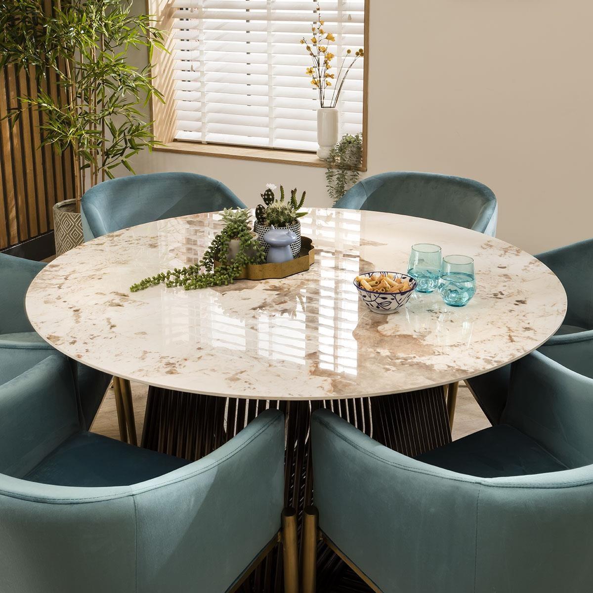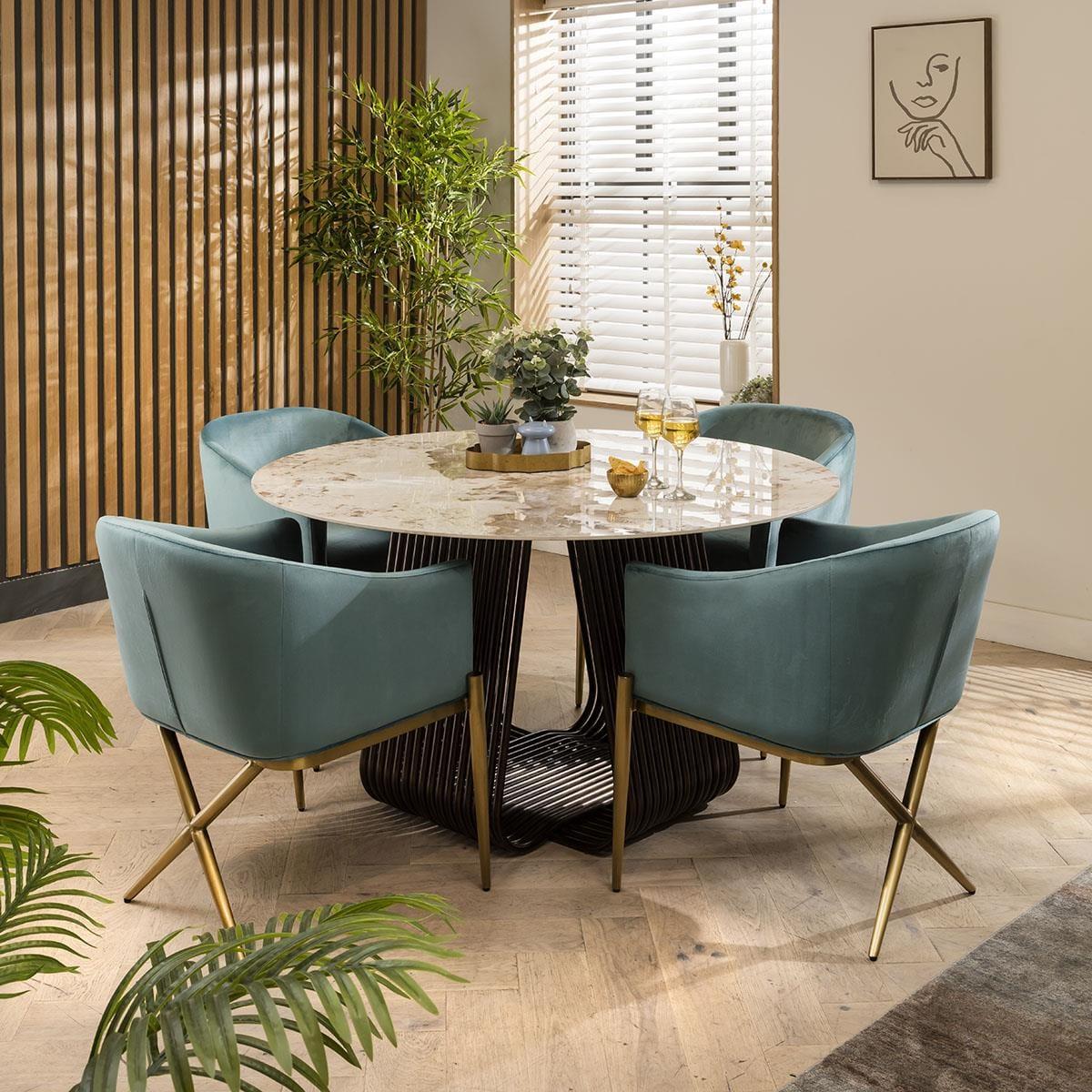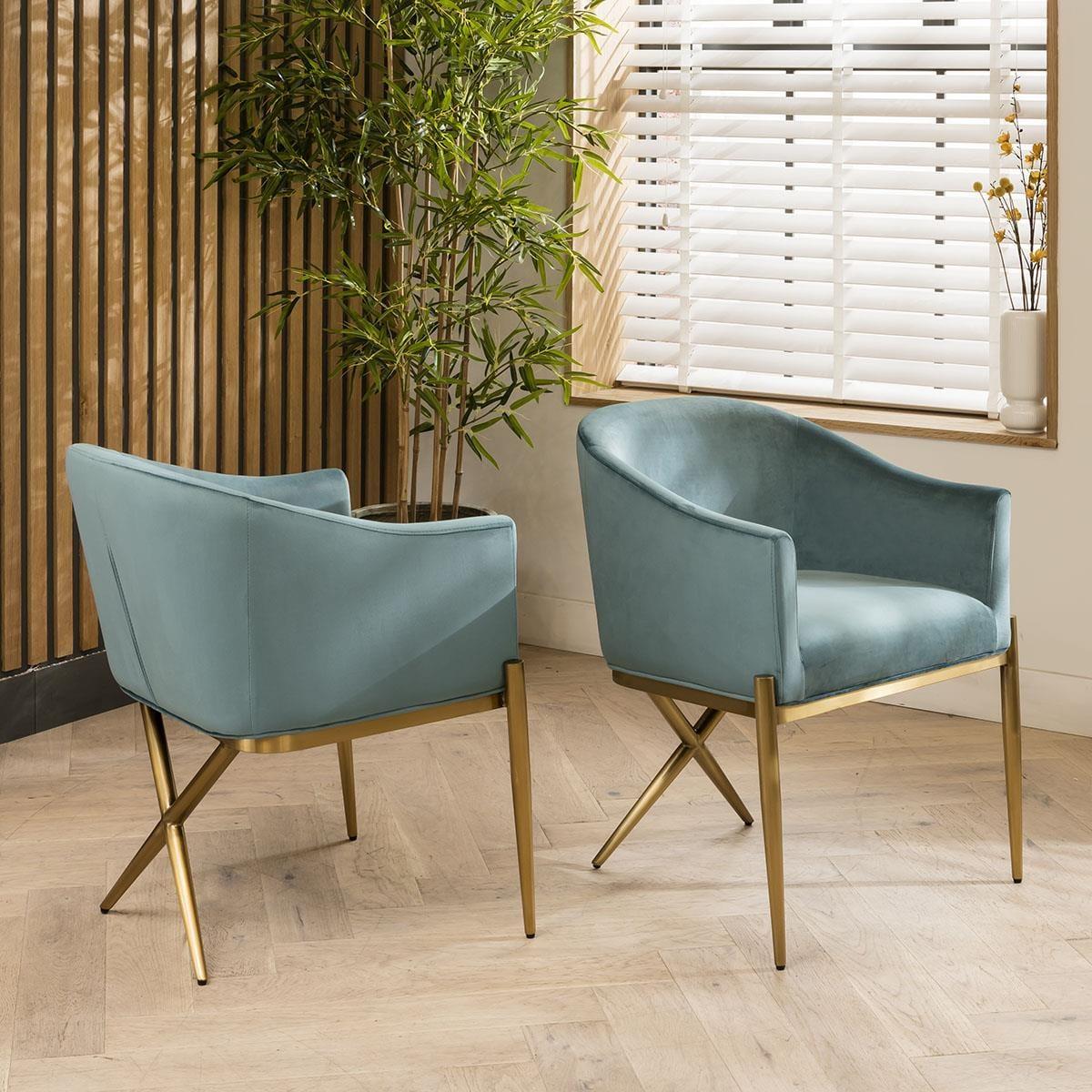 A perfect blend of elegance and modern design, the premium Zoe teal green velvet dining chair will elevate your home's ambiance with its modern carver style, wrap-around backrest, and captivating brushed gold metal legs. Make a statement with your dining chairs and indulge in the charm of our teal velvet masterpiece. Adorned with sumptuous teal velvet upholstery, the Zoe dining chair exudes an air of refinement that complements any interior decor. The carefully curated design showcases a harmonious marriage of form and function, boasting both visual appeal and ergonomic support. The inclusion of armrests elevates your dining experience. Supported by glam brushed gold metal legs, this dining chair stands as a testament to both durability and elegance. The cross leg feature on the rear legs not only adds a striking visual element but also ensures exceptional stability. Whether you're hosting an intimate dinner or a lively gathering, our dining chair is designed to impress your guests while being a comfortable retreat for you. With its versatile design and plush velvet upholstery, this dining chair effortlessly adapts to various settings, from formal dining rooms to trendy kitchen spaces. Its timeless appeal and modern edge make it a captivating focal point that seamlessly integrates into your home decor. Elevate your dining area with a touch of lavishness and contemporary flair by choosing the Zoe premium teal velvet dining chair - an embodiment of style, comfort, and enduring quality. W65cm D62cm H80cm Seat Width 46cm, Seat Depth 43cm, Seat Height 46cm Soft Touch Teal Velvet Dining Chairs