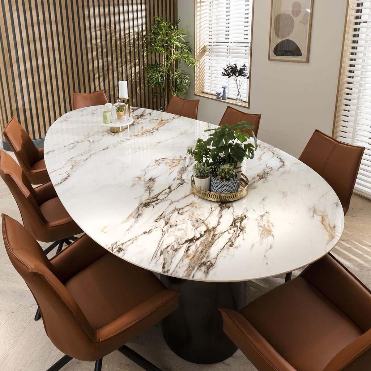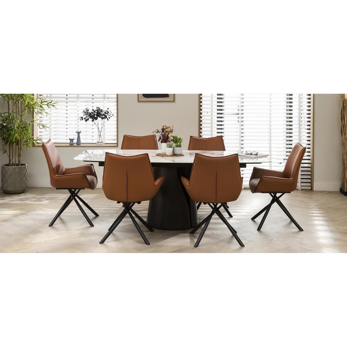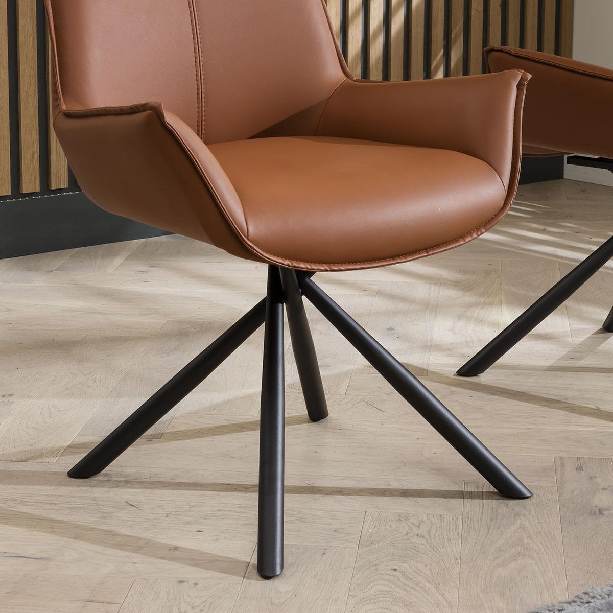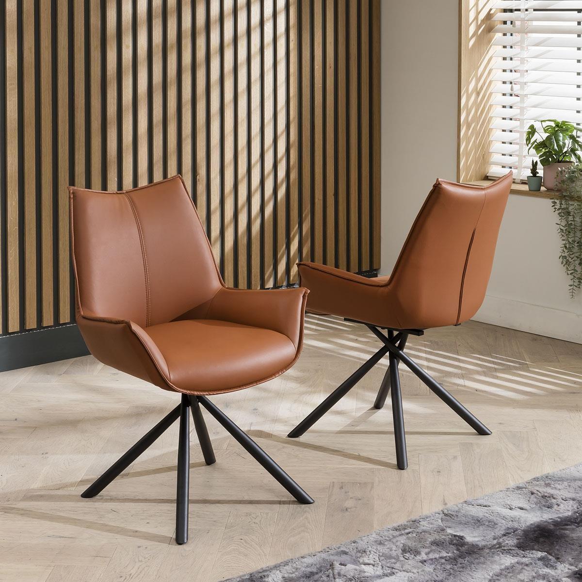This set of sleek and streamlined contemporary swivel dining chairs, sure to compliment most modern dining tables, boasts in both style and comfort. This modern dining room chair features tan faux leather upholstery with a densely cushioned chair seat atop a unique metal swivel base. These dining chairs are upholstered in luxurious tan faux leather, exuding an air of opulence while remaining easy to clean and maintain. The supple faux leather not only adds a dash of warmth to your dining area but also ensures a comfortable seating experience for you and your guests. Designed for both convenience and versatility, these chairs feature a swivel base that effortlessly resets to a forward-facing position. Say goodbye to awkward shuffling – simply glide into your desired seating orientation. The sweeping low arms not only provide a comfortable resting spot for your arms but also enhance the overall aesthetic appeal of the chairs. The sleek metal legs with their unique rotated design offer a stunning contrast to the tan faux leather upholstery. Not only do they provide robust support, but they also add a contemporary edge to the chairs' design. Elevate your dining experience and create an ambiance of modern luxury with our exceptional dining chairs. Redefine your space with these stunning pieces that blend style, comfort, and innovation seamlessly. W64cm D55cm H88cm Set of 2 Swivel Dining Chairs Luxury Swivel Dining Chairs Upholstered in Tan Faux Leather