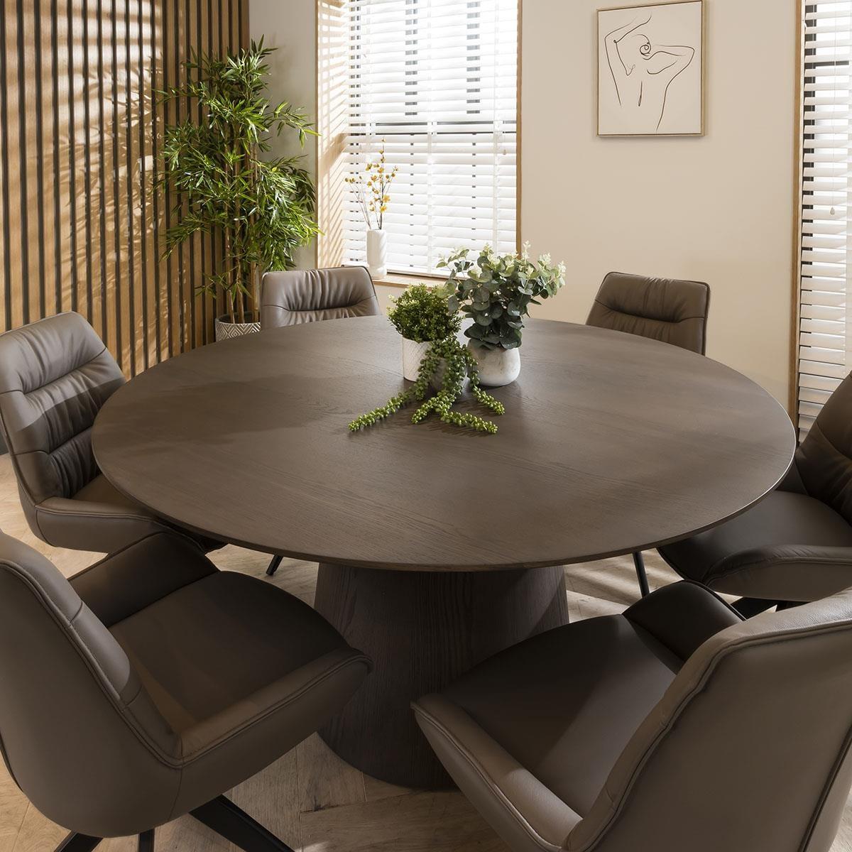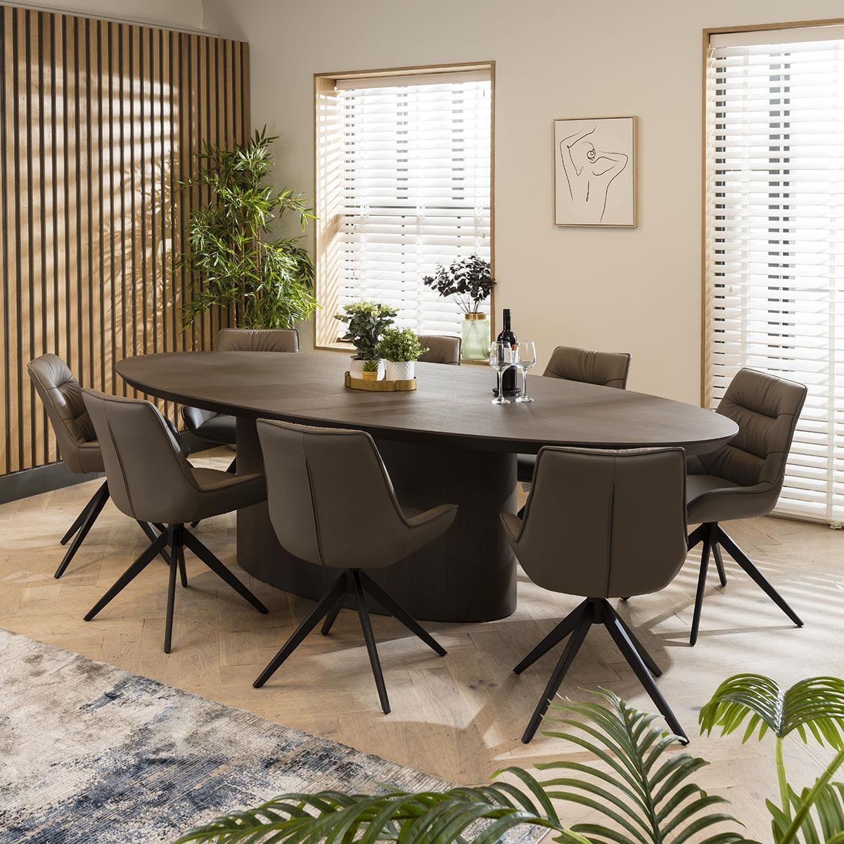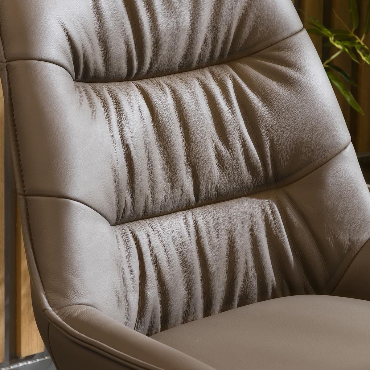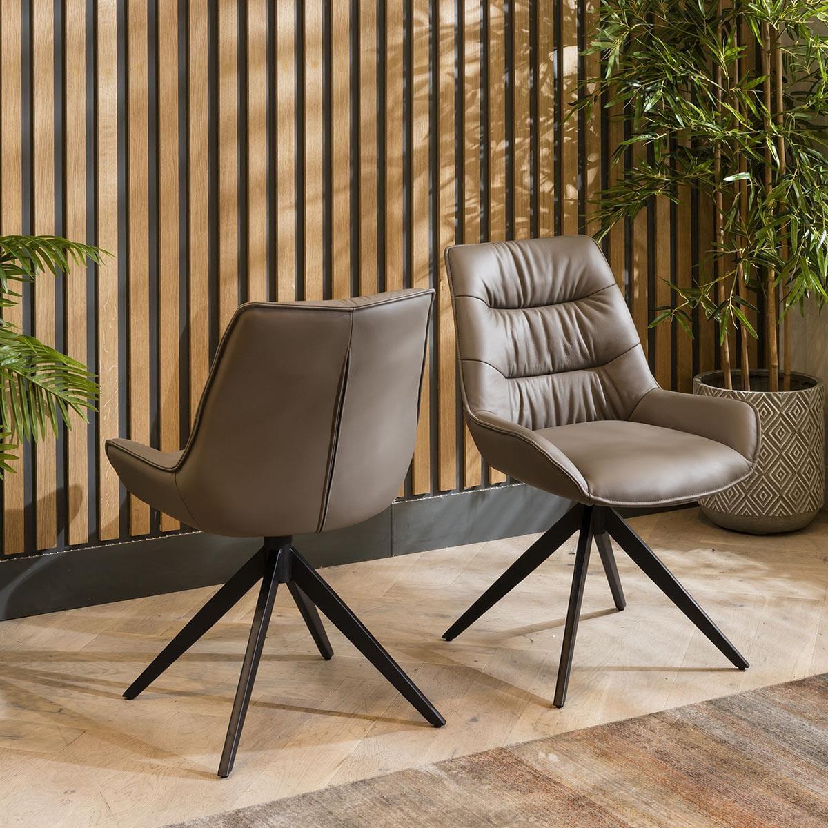 Elegance with comfort is effortlessly blended with the Nora leather dining chairs, crafted with genuine grey leather. These cushioned dining room chairs feature a sleek 4-point swivel base that ensures stability and ease of movement, making the chairs a perfect addition to any contemporary kitchen or dining space. Upholstered in genuine grey leather, the rich, dark shade exudes sophistication, making these chairs the ideal choice for those seeking a touch of opulence in their decor. To further enhance their unique appeal, the backrest of each chair is adorned with a stylish stitched line detail, adding a distinctive visual element that sets them apart from the ordinary. The attention to detail doesn't stop there. These dining chairs feature a clean piped edge around the chair, and the cushioned seat and backrest ensure you and your guests will enjoy a comfortable dining experience every time. The Nora dining chairs feature a swivel base for added convenience. The black powder-coated 4-point base not only ensures stability but also complements the cream leather upholstery beautifully. W58cm D64cm H85cm Seat Height 50cm Set of 2 Modern Dining Chairs
