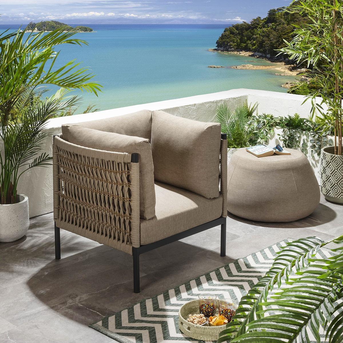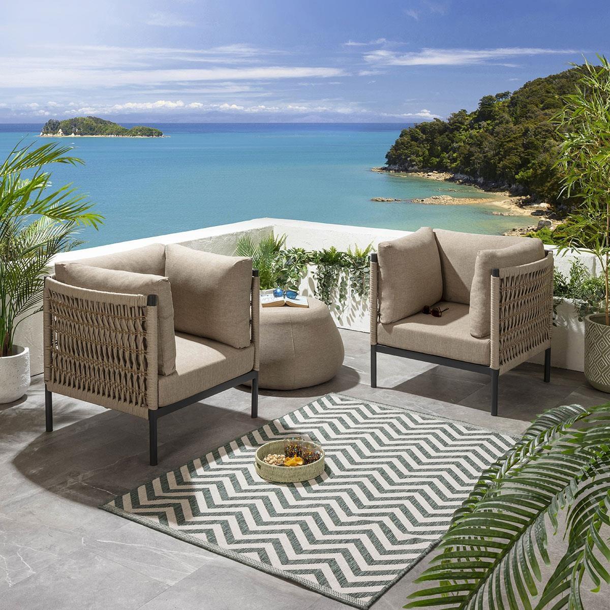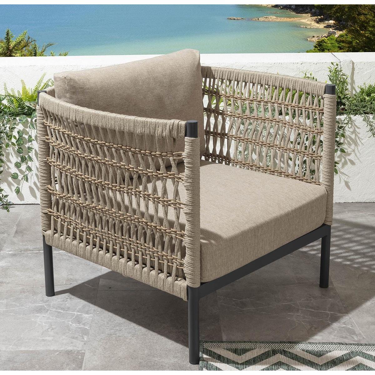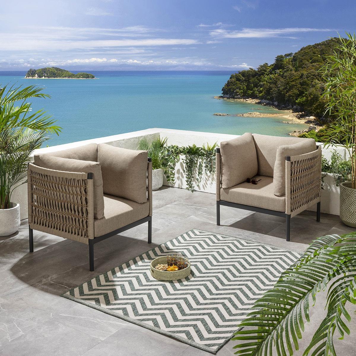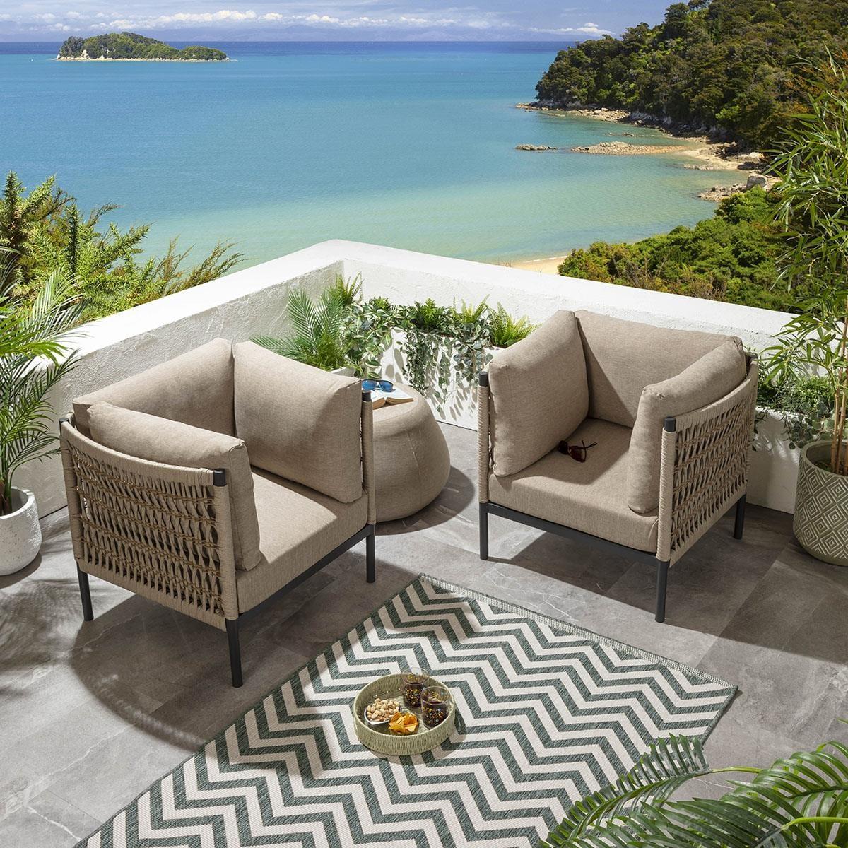 Elevate your outdoor relaxation with our modern Bailey outdoor armchair set. This metal garden furniture set includes two high-back armchairs, crafted with premium grey aluminum frames. Adorned with beige rope weave, this set exudes luxury and comfort, perfect for any garden or patio. Designed for modern garden spaces, our outdoor armchairs feature a cubey design with high backs and sides. The premium grey aluminum frames provide durability and style, while the intricate beige rope weave adds an artisanal touch, creating a luxurious seating experience. The outdoor cushions are crafted with the utmost attention to comfort and durability. Made with luxury foam, they provide plush support for hours of relaxation. Upholstered in a sleek beige outdoor fabric, the cushions seamlessly complement the modern design of the sofa set. For added convenience, this set comes with weather covers to protect your furniture when not in use. Chair Size W90cm D80cm H80cm Seat Height 39cm Set includes 2 armchairs Weather covers included