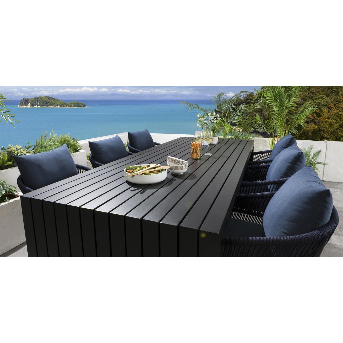 Reinvent your outdoor space with these fabulous all-weather blue rope-back garden dining chairs. The generously padded outdoor chairs are enhanced by a supportive back cushion for an extra layer of luxurious comfort. Our gorgeous rope back garden chairs will make a stunning addition to your outdoor seating area or patio. The garden chairs come complete with our signature luxuriously thick cushioning that offers unbeatable comfort, topped off with high-end marine fabric which has amazing resilience to colour fading and damage caused by extreme weather conditions. Expertly crafted aluminium frames are highly durable, complemented by clean lines that lend contemporary style. W61cm D65cm H75cm Includes 2 x dining chair Extra deep cushions