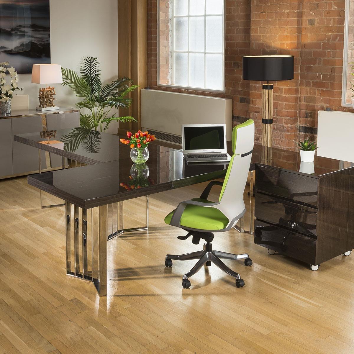 This 2 desk group with drawer cabinet can be used as a conference desk or as a corner L shaped desk, comprising of a 600 x 600mm 3 drawer cabinet, 2200mm x 800mm and a 1700mm x 800mm desk. The contemporary angled polished steel legs add some flare to the Linea dining table, but it also means that seating on the end of table is made somewhat easier - maximising usability without sacrificing style is the goal here! This version of the Linea desk comes finished with luxury high gloss smoked oak table tops. Our high gloss finishes are hard-wearing and very easy to keep clean. If you need more information about this product, use the Live Chat service to speak to the team or send us a message. Spread the cost our with interest-free finance options. Minimum spend applies. W220cm D310cm H75cm High Gloss Finish Matching Items Available
