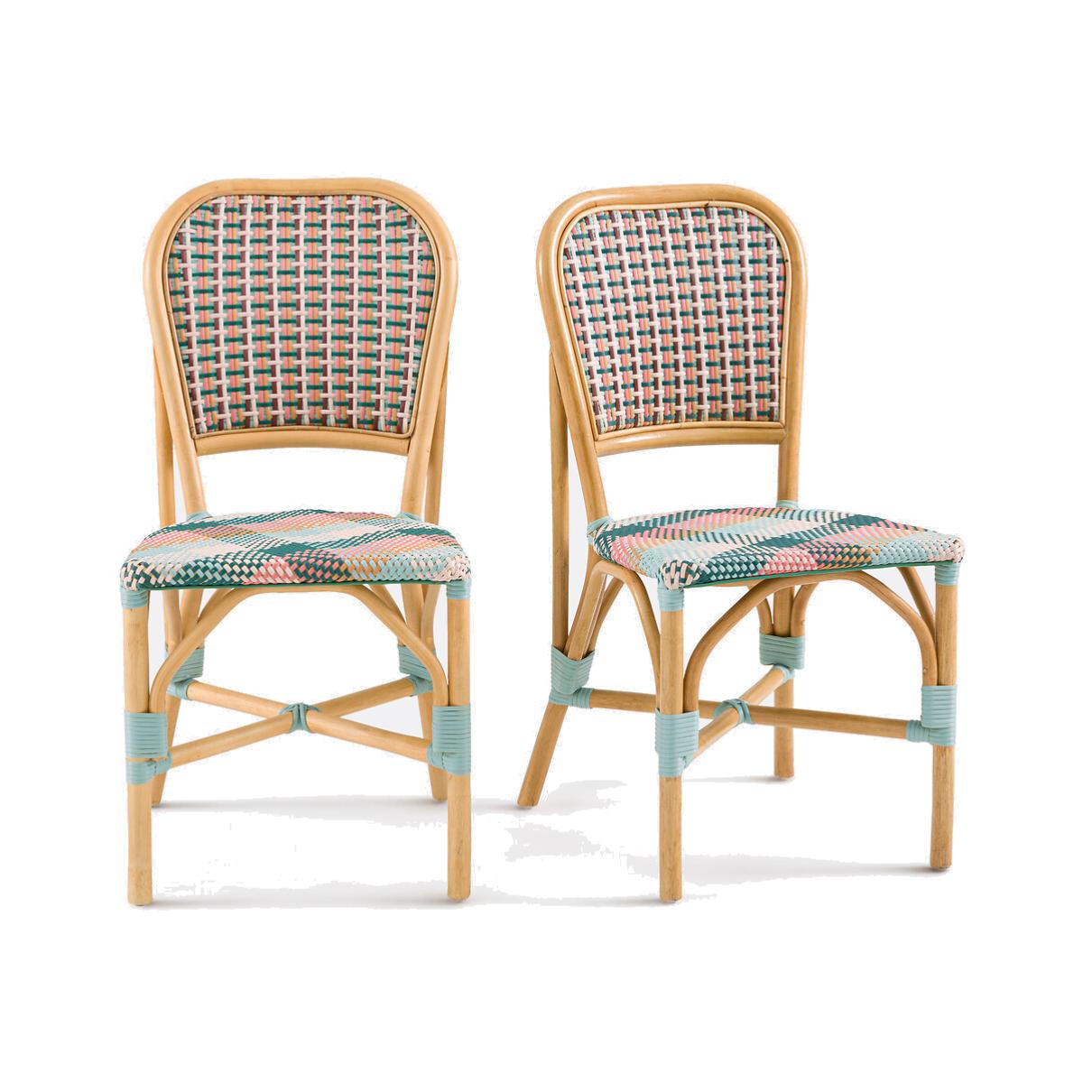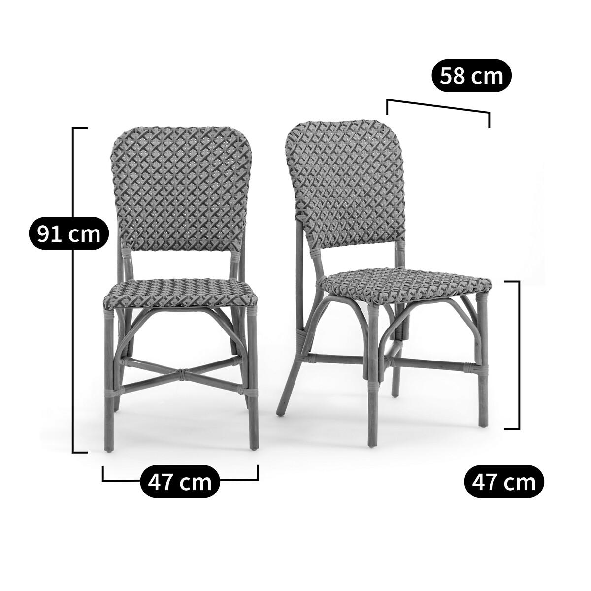Introducing the Musette chairs, inspired by bistro style. Showcased here in a rattan and tartan braided version, perfect for bringing a touch of country chic into your home. Designed by La Redoute Intérieurs. Product Details • Rattan cane legs and structure with nitrocellulose varnish finish • Seat and back in poly rattan • Mounted with crossover webbing • Polypropylene glides • Set of 2 chairs • Artisanal craftsmanship. Dimensions • Width: 47cm • Height: 91cm • Depth: 58cm • Seat: L45 x H47 x D44cm • Weight: 3.6kg • Sold pre-assembled. Dimensions and weight of parcel1 parcel • L71 x H96 x D49cm. 11kg