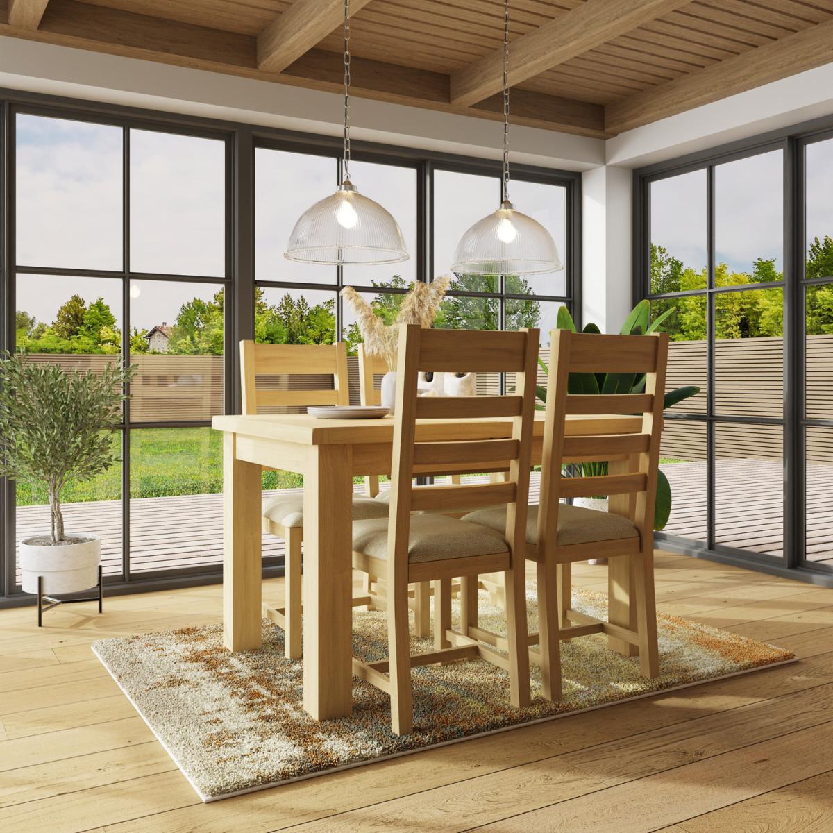 Introducing our Pair of Slatted Back Solid Oak Dining Chairs, a perfect blend of style, comfort, and durability for your dining area. These chairs feature a classic slatted back design that adds a timeless charm to any space. The padded seat, upholstered in cloth, ensures optimal comfort for extended periods of sitting, allowing you and your guests to enjoy meals and conversations in utmost relaxation. Crafted from a blend of solid oak, oak veneer, and MDF, these dining chairs are built to withstand the test of time. The use of high-quality materials guarantees their longevity and resistance to everyday wear and tear. With additional stretcher bars, these chairs offer enhanced strength and stability, providing a secure seating experience. Sold as a pair of two, these dining chairs perfectly complement our dining tables. Their ergonomic design ensures proper support for your back, promoting good posture and making your dining experience comfortable and enjoyable. Furthermore, these chairs have undergone rigorous testing and are fully certified for UK FR (Fire Resistance) and stability, assuring you of their quality and safety. Enhance your dining area with our Pair of Slatted Back Solid Oak Dining Chairs. With their classic slatted back design, padded seat, and robust construction, they are an ideal choice for both everyday meals and special gatherings.