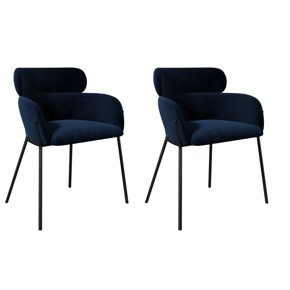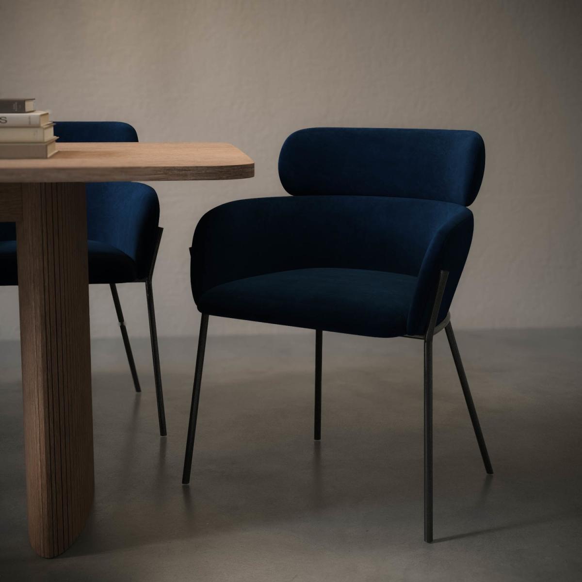All about me The modern Isla dining chairs boast a unique back and arm design that's guaranteed to create a dark and sophisticated statement in any dining room, and it's filled with spongey foam to make the perfect comfy seat. The opulent velvet fabric is made from recycled plastic bottles, so it not only looks stunning in your home, but it's also great for the environment. Need to know Dimensions:W61.5 x D57.5 x H78.5 cm Number of chairs:2 Weight: 7.9 kg Max supported weight: 130 kg Colour: Navy and black Finish: Upholstered and powder coated legs Material: Velvet fabric (made from recycled plastic bottles) and metal legs Assembly required: Yes – just attach the legs Packed dimensions:W83 x D63 x H52 cm