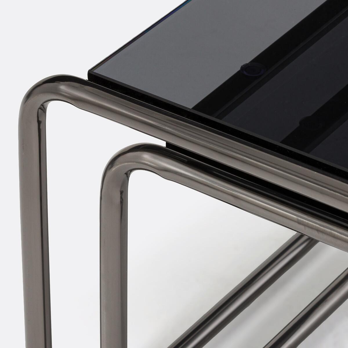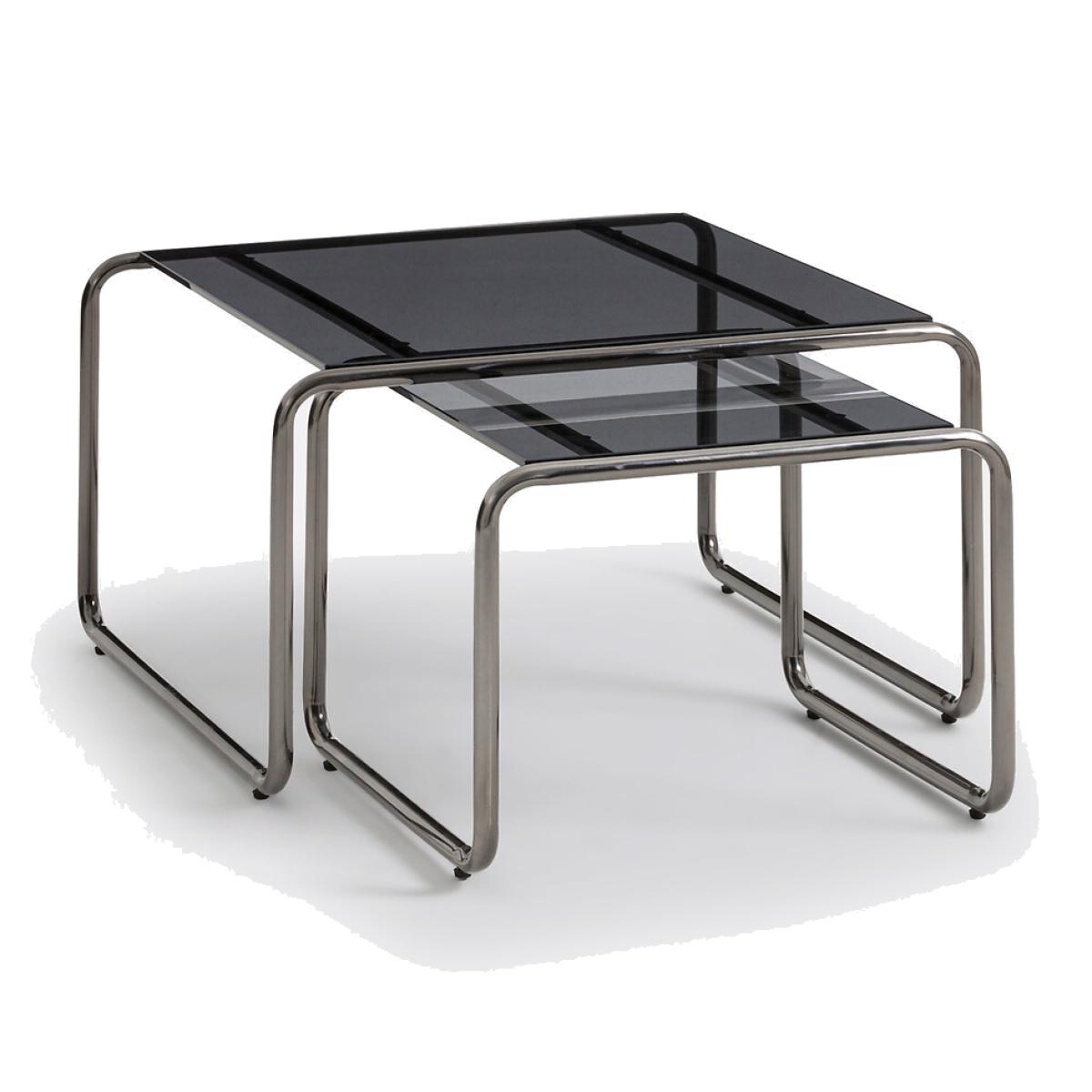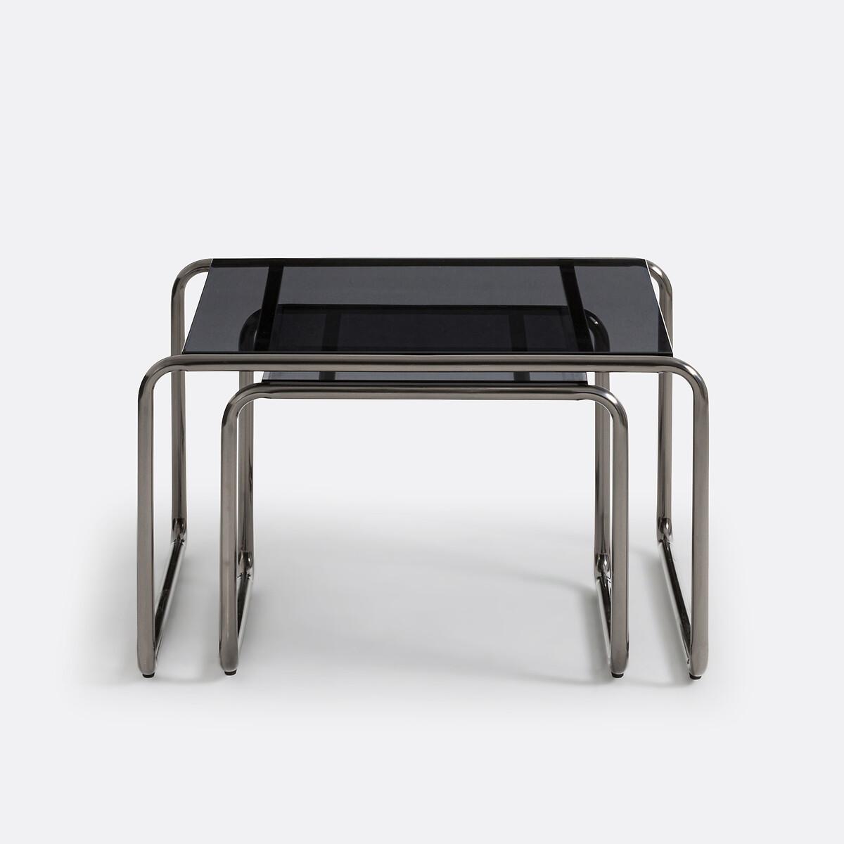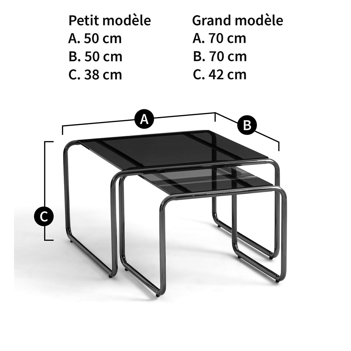 These two nesting coffee tables have a 70s influence that combine smoked tempered glass and steel. Separated or grouped, they lend themselves to all combinations. Designed by La Redoute Interiors. Product Details • Tempered and frosted glass table top • Steel tube base with black chrome finish • Adjustable plastic feetDimensions. Model 1 • Width: 70cm • Height: 42cm • Depth: 70cm • Top: L66 x D60cm Model 2 • Width: 50cm • Height: 38cm • Depth: 50cm • Top: L46 x D40cm • Assembly required. Dimensions and weight of parcel2 parcels • L78 x H12 x D68.5cm. 16kg • L75 x H48 x D75cm. 8.5kg
