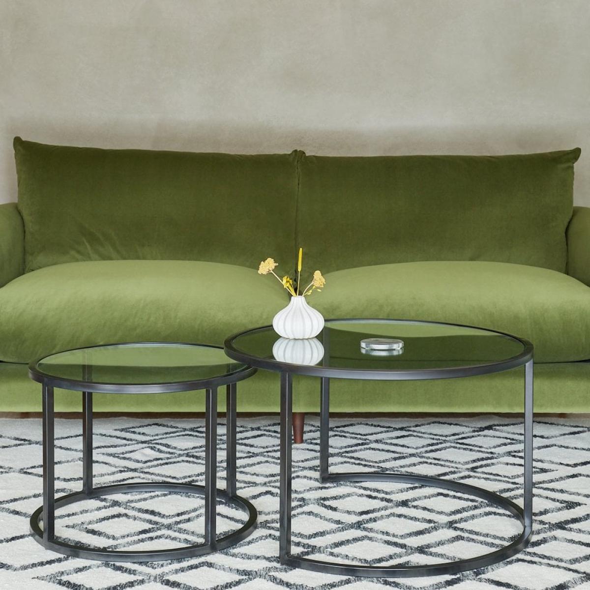 I love these brass nesters for their lightweight frame and clear glass tops, which keep a room feeling open rather than cluttered. They suit modern, Scandinavian or Art Deco schemes equally well, with the warm metal pairing nicely against neutral colour palettes or richer jewel tones. For practical styling, tuck the smaller table partly under the larger when not in use, then layer a low vase or succulent on one and a neat stack of books or a decorative tray on the other to create interest without overwhelming the space.