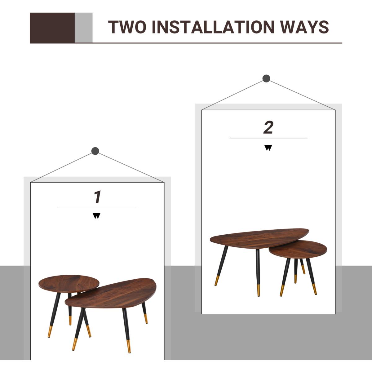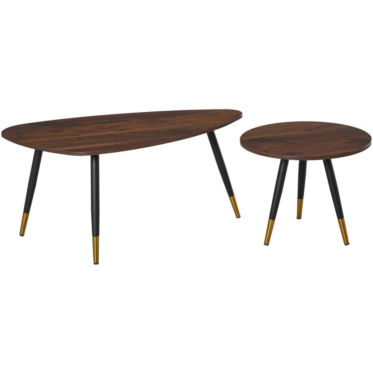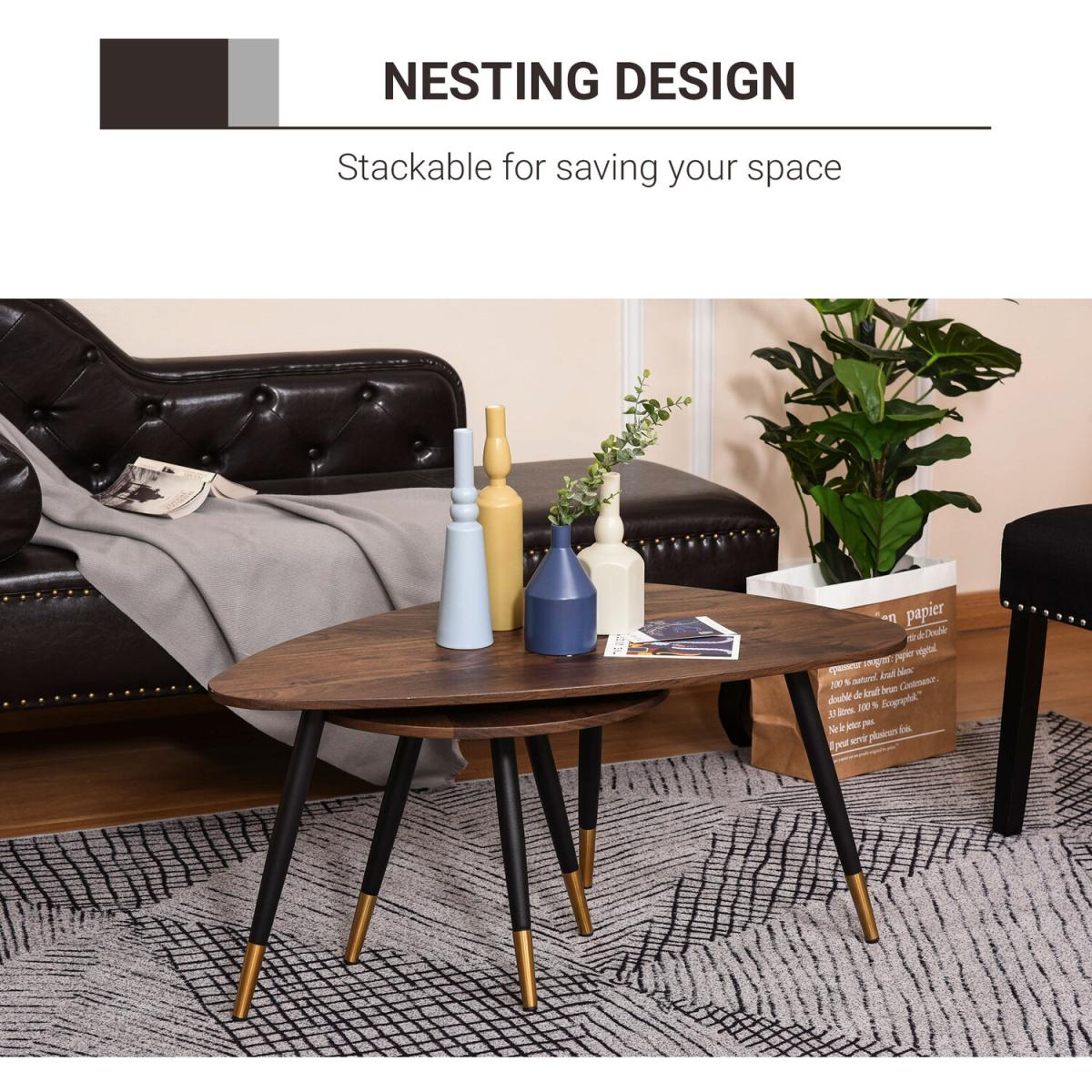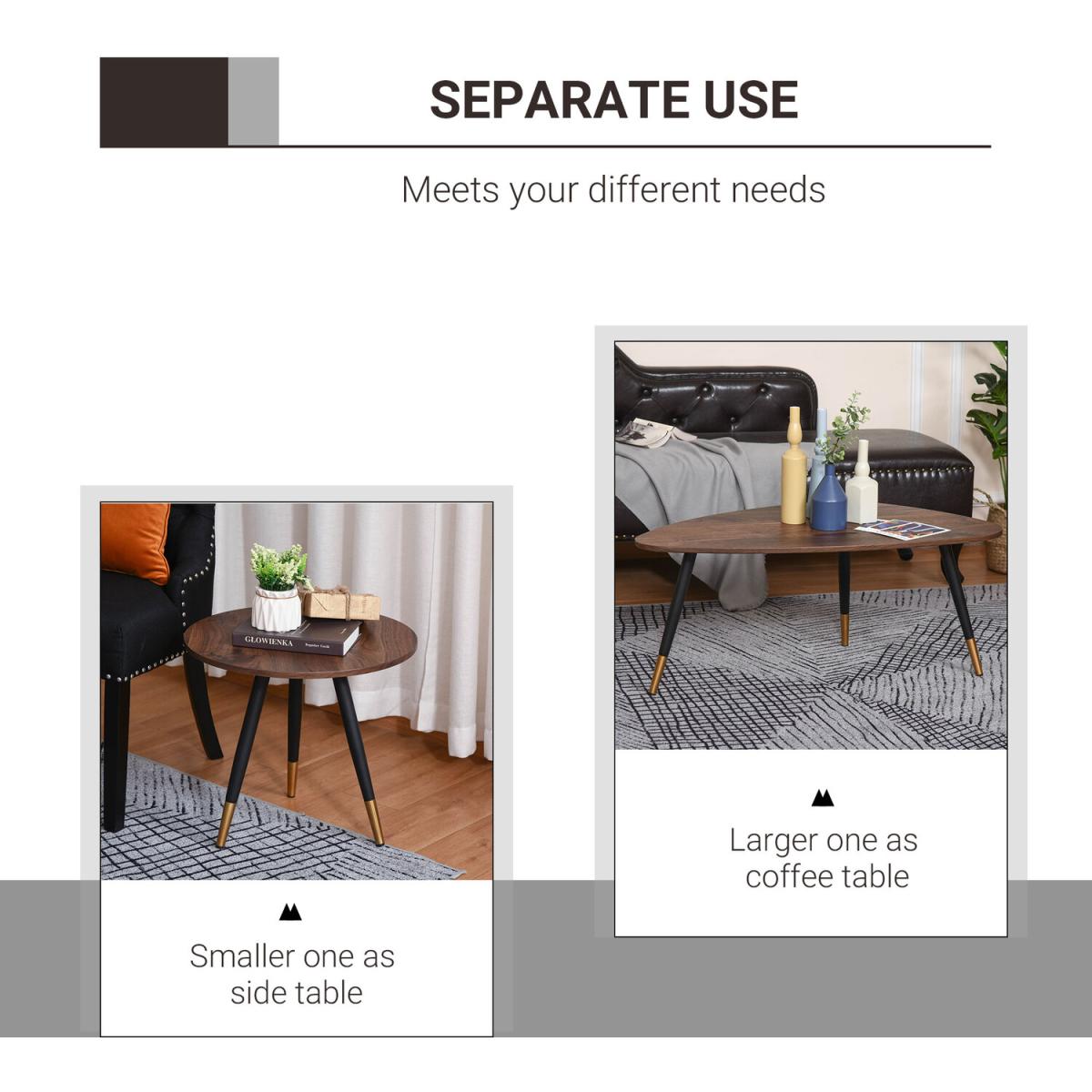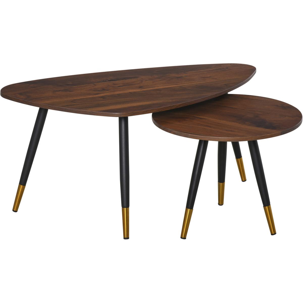 Go for gold in your home styling with this coffee table set from HOMCOM. The set comes with one small table and one longer - both can be combined for extended space or even left separated if wanted. There are three steel legs on each piece, keeping the tables balanced and steady, with gold-tone markings on the end for sophistication. The tabletops, made from durable MDF, are covered in a wood-effect design, bringing a classic furniture look - with its walnut colour finish - making it appear more on the vintage side.