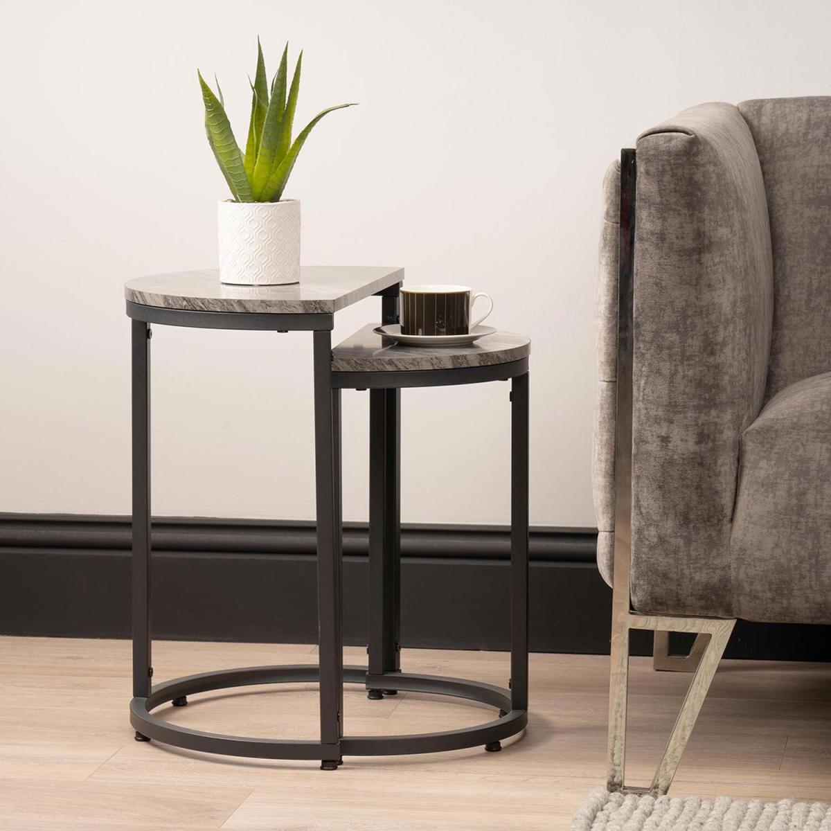 Enhance your living room decor with our set of 2 nesting side tables, crafted for both style and functionality. These tables feature MDF tops with a sleek half-moon design, adding a touch of elegance to your space. Supported by sturdy metal bases, they ensure stability and durability for everyday use. The nesting design offers space-saving storage when not in use, perfect for smaller living areas. Elevate your living room's ambiance with this chic and versatile set of nesting side tables.