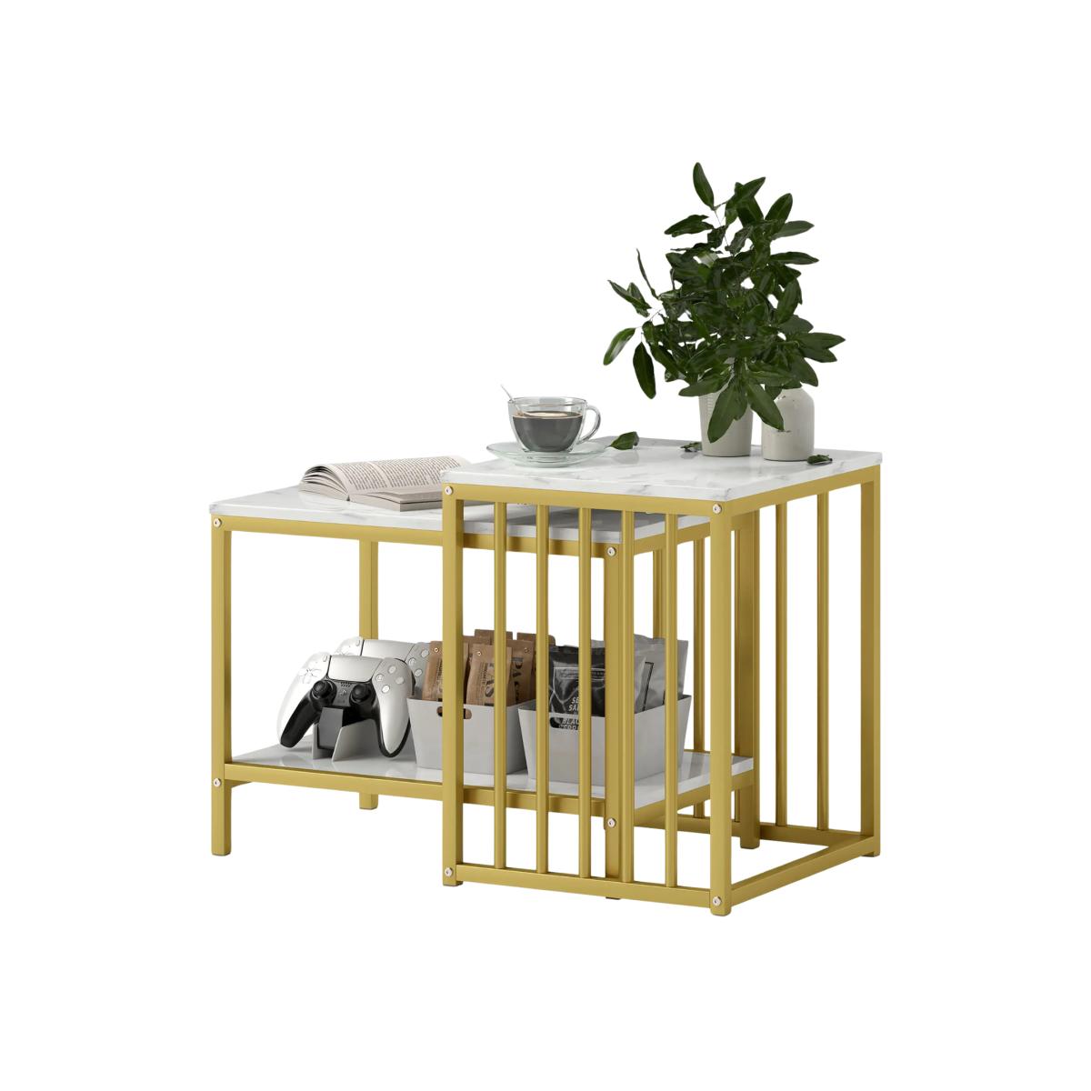 Includes a versatile tall table that can function as a nightstand or end table, paired with a smaller, wide table perfect for use as a coffee table. The smaller table can be conveniently tucked under the larger one to save space when not in use. The smaller table is equipped with a lower shelf for added storage, allowing you to keep books, magazines, or decorative items organized and accessible. Constructed with a strong steel frame for enhanced stability and longevity, paired with an MDF tabletop that is easy to clean and maintain, ensuring a fresh and polished look over time. The large table measures 52cm in height, 45cm in length, and 40cm in width. The small table measures 45.5cm in height, 60cm in length, and 39.5cm in width, making them suitable for a variety of spaces. Each table supports up to 30kg, providing ample strength for everyday use. Easy assembly is required, with instructions and components provided.