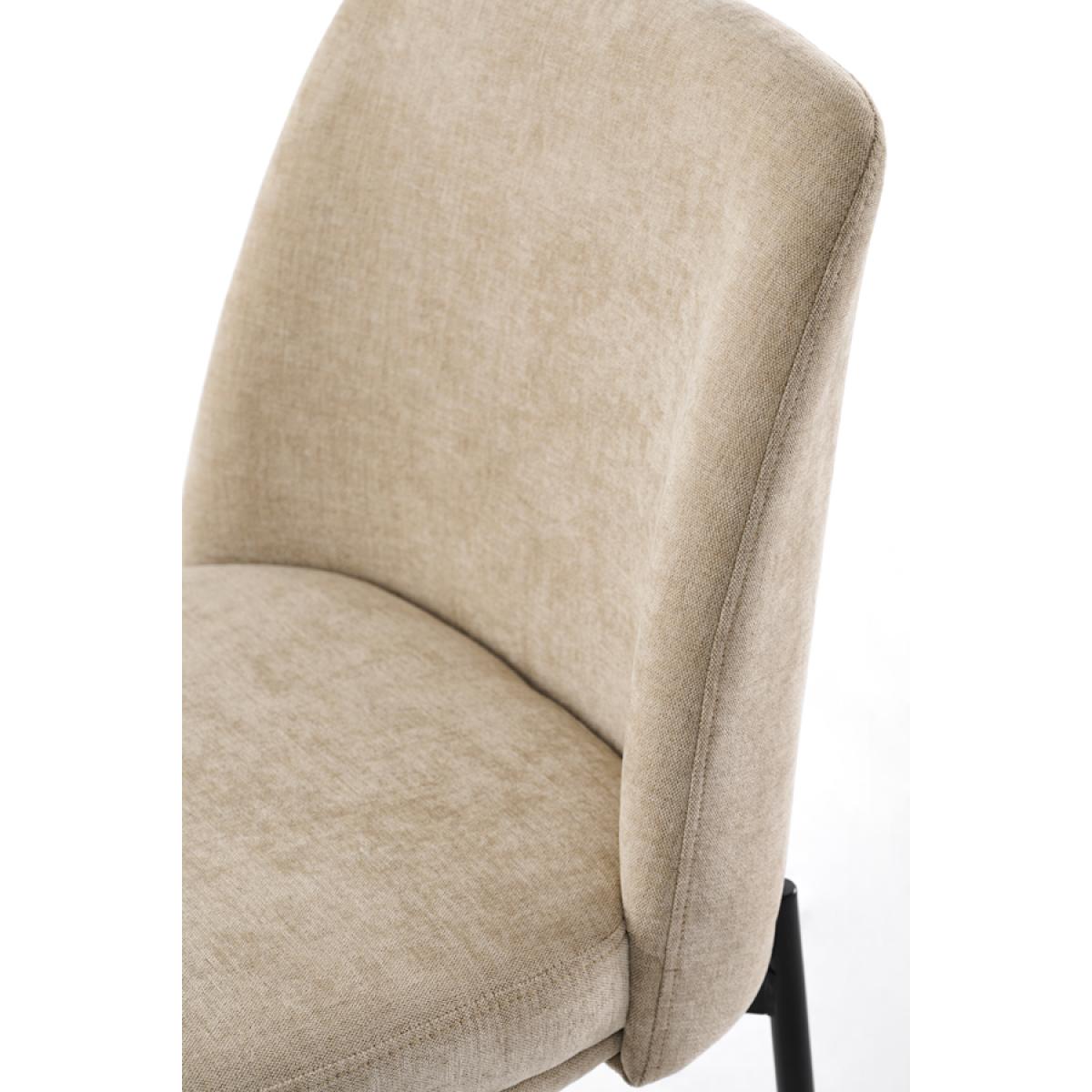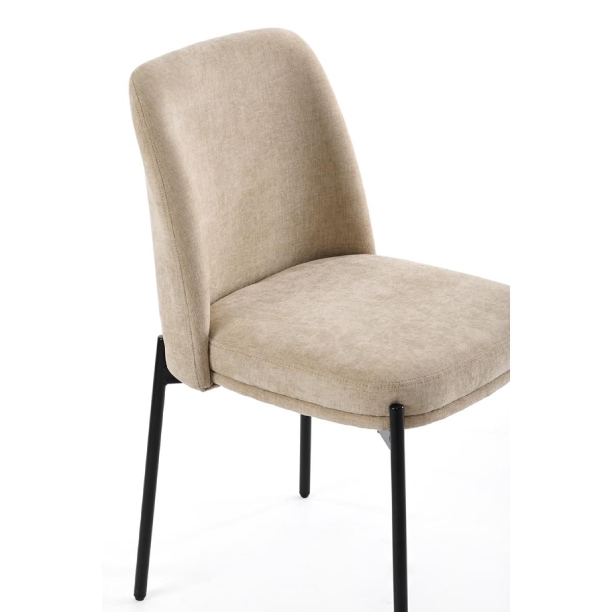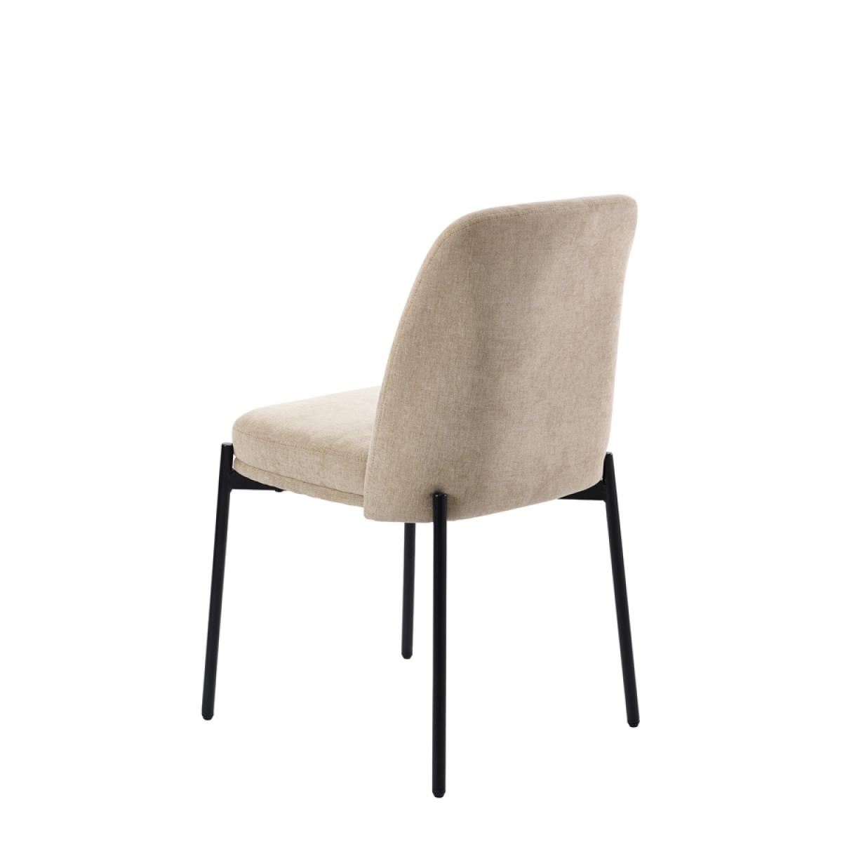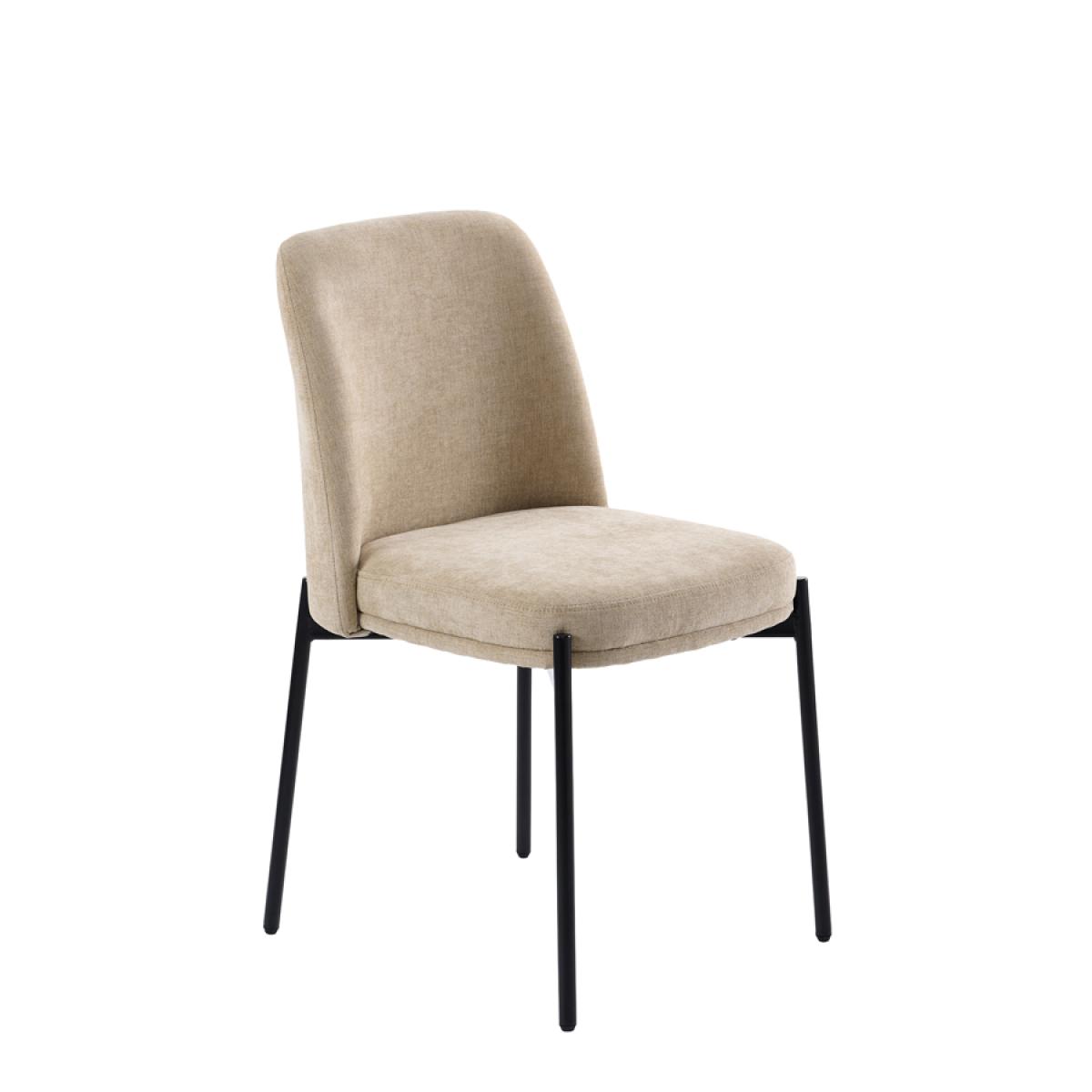 A stylish, modern dining chair with subtly sculpted curves. Deep foam-padded seat and back, upholstered in a soft, washed-effect short-pile chenille fabric. Striking steel base, with a durable black powder-coated finish. Black height-adjustable glide feet. Minimal assembly required — approximately 10 minutes.