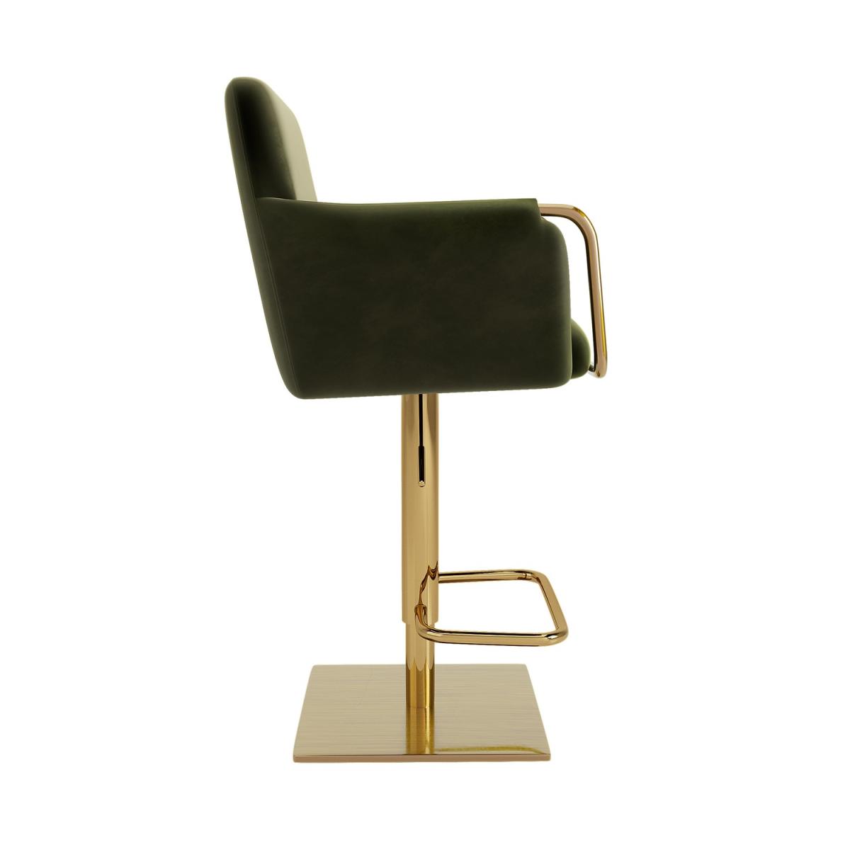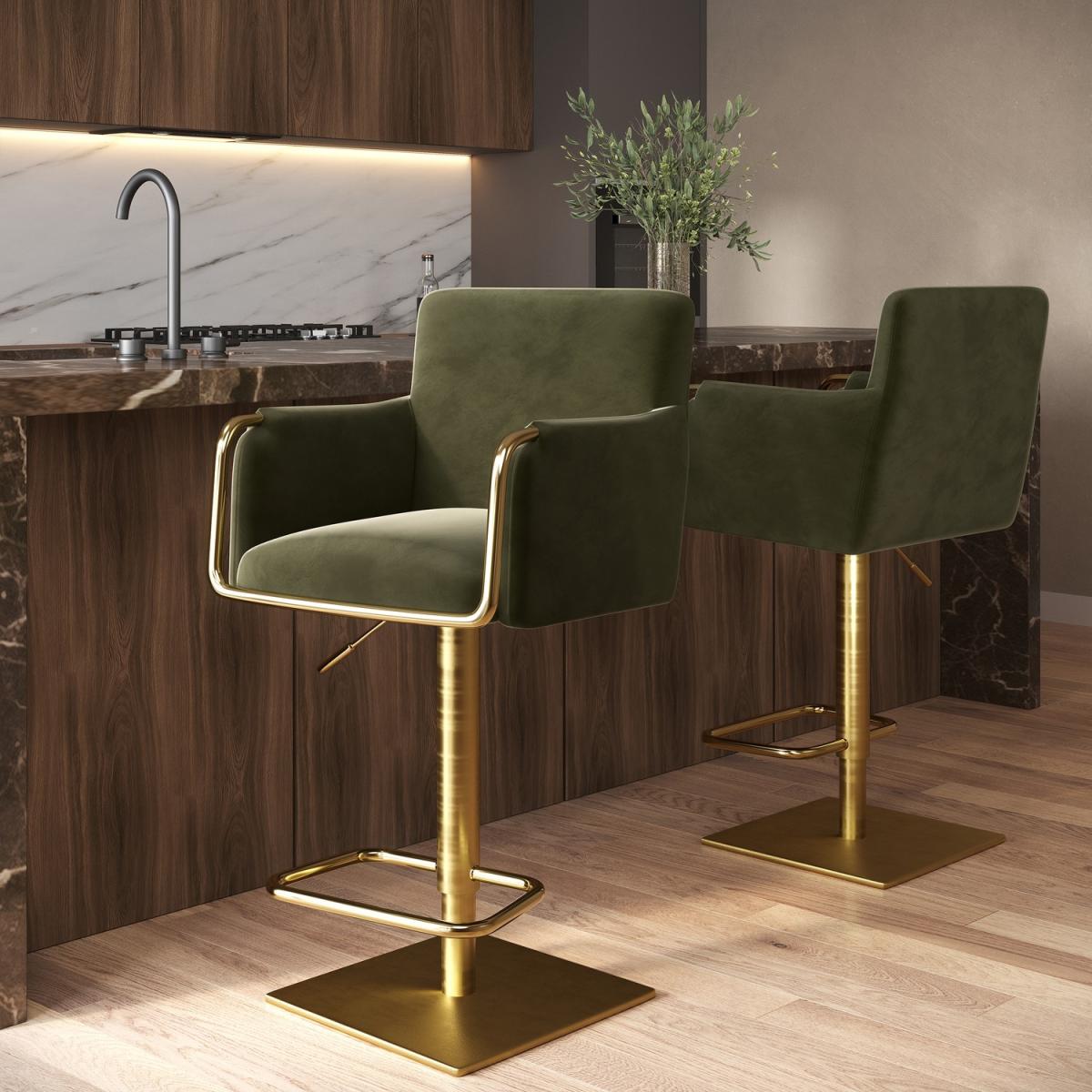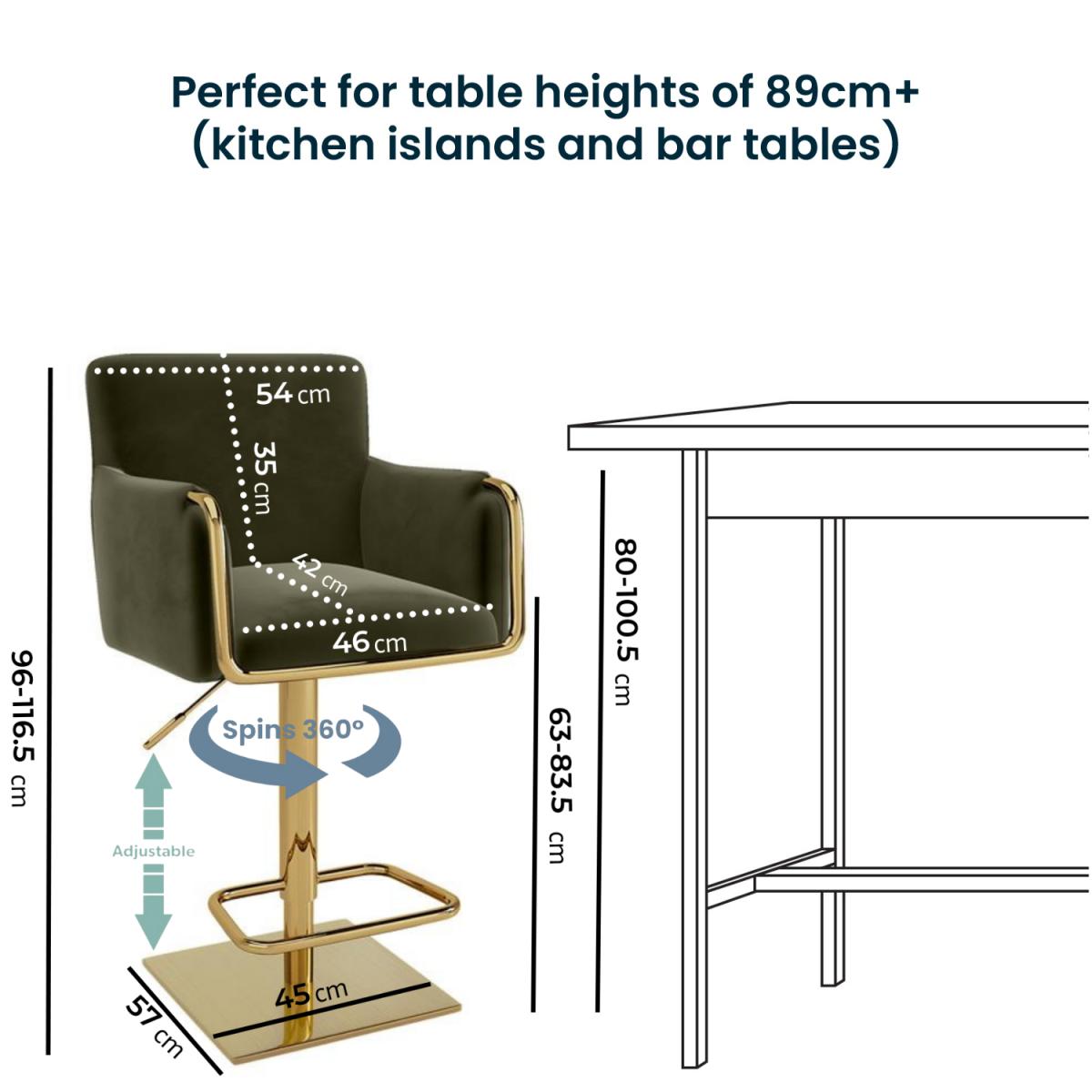 Upholstered in soft and smooth olive green velvet, offering a plush, sophisticated look that enhances any space. Effortlessly customise the stool's height to suit your needs with an easy-to-use lever, making it ideal for various counter or bar heights. 360-degree swivel functionality allows for seamless movement and flexibility, perfect for entertaining or casual use. The brushed gold base not only adds a touch of glamour but ensures exceptional stability and durability. Designed with an extra-large seat and supportive backrest, offering supreme comfort for extended periods of seating. Elevate your home bar or kitchen island with these Sonny Adjustable Barstools. Upholstered in smooth olive green velvet, it exudes a refined elegance that pairs beautifully with the brushed gold base. Designed for both style and functionality, this barstool features an adjustable height mechanism, allowing you to tailor it perfectly to your setup. Its 360-degree swivel function offers ease of movement, while the extra-large seat and supportive backrest ensure comfort during extended use. Whether you’re entertaining guests or enjoying a quiet moment, the Sonny Barstool is the perfect combination of luxury and practicality.