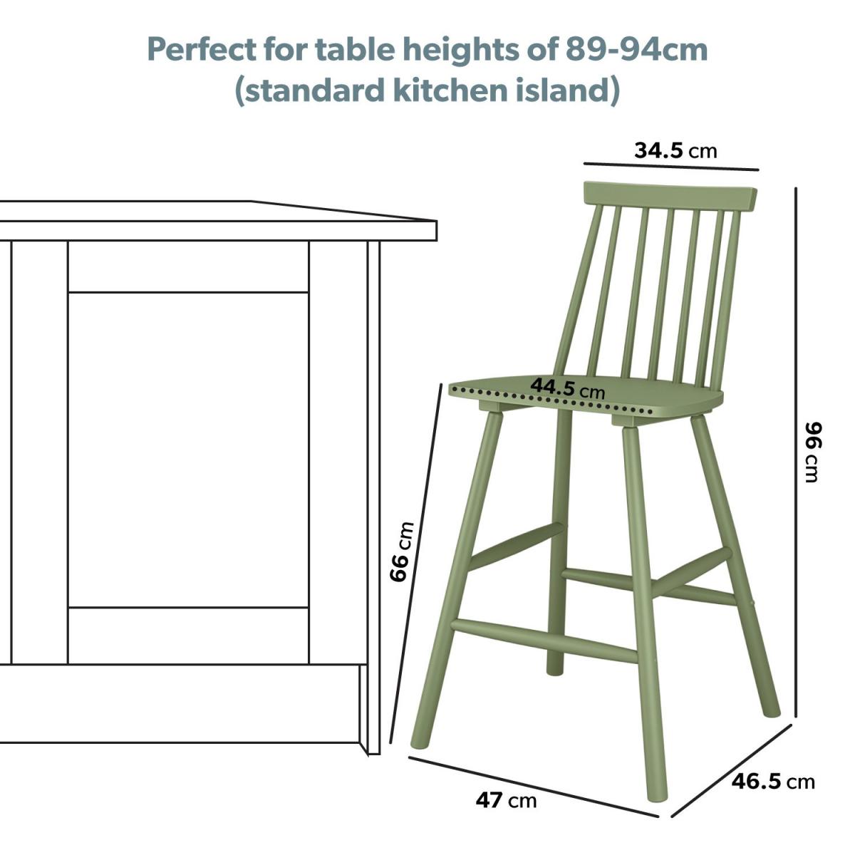 . This bundle includes. 2 x Olive Green Wooden Kitchen Stool with Spindle Back - 66cm - Cami Features we love. Striking olive-green kitchen stool with backrest. With tapered legs oval seat and footrest. The classic spindle design is timeless in any home. Made from solid rubberwood its built to last Versatile style that can be sat at any breakfast bar Need to know. Dimensions. W44.5 x D47 x H95.5 cm Seat Height. 66cm Weight. 5.5kg Max supported weight. 140kg Colour. Olive Green Material. Solid rubberwood Finish. Painted For use. Indoors Assembly required. Yes just the legs parts to affix..