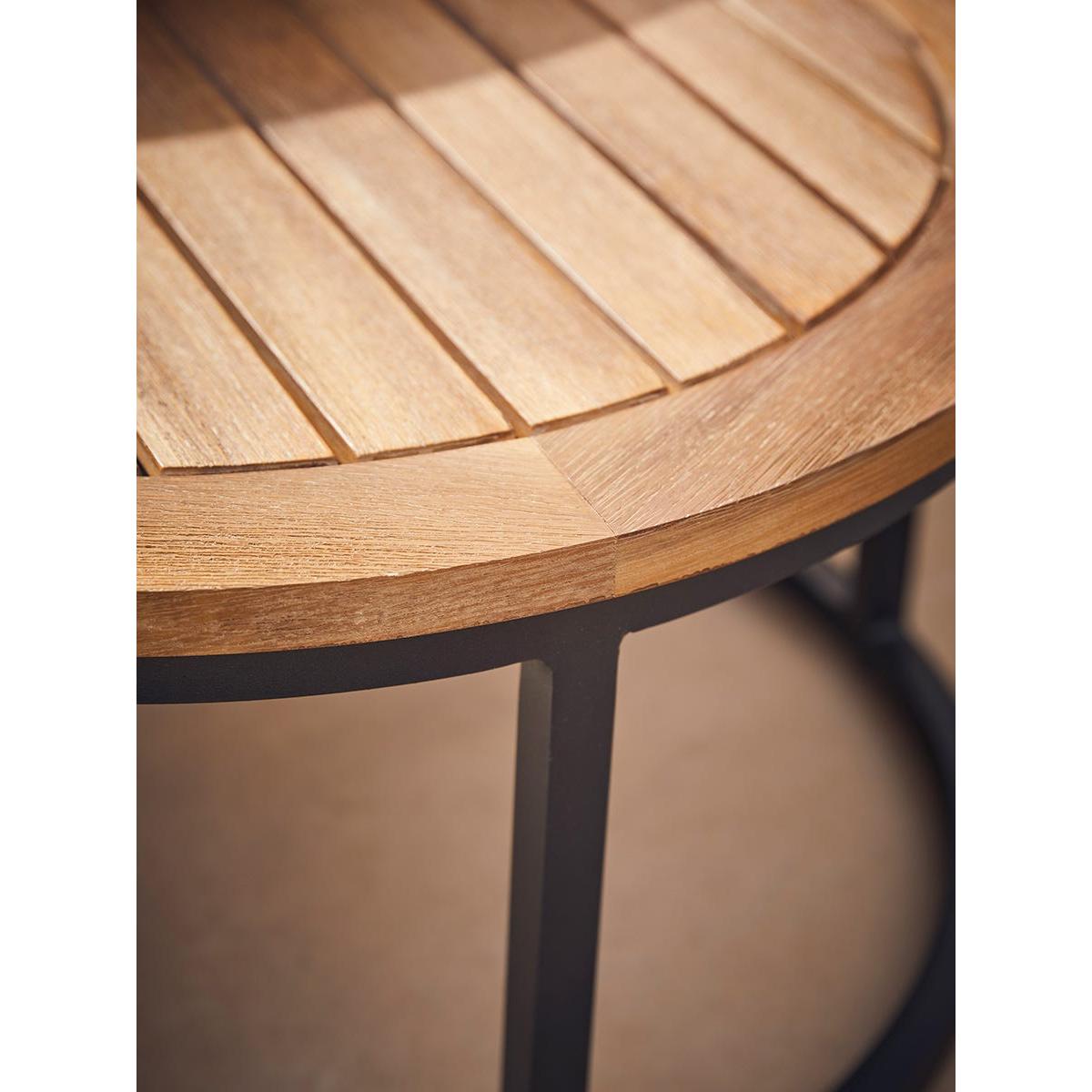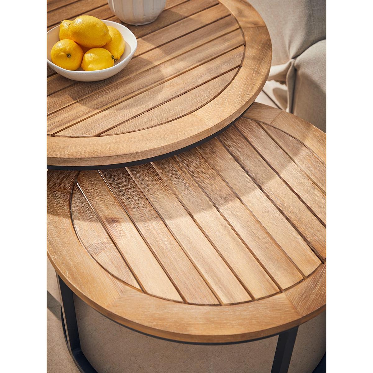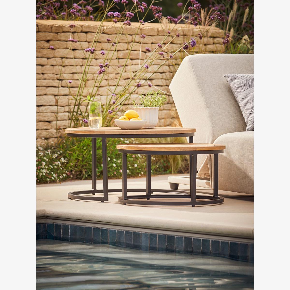 Bring sleek, stylish and practical furniture to your garden with our set of two nesting coffee tables. A striking black metal frame contrasts the warm acacia wooden table top, adding modern simplicity to your garden. Pull out the smaller table when guests are round for extra space, or use as a side table next to a lounger to place your drinks and relax for the perfect way to while away the long summer days.