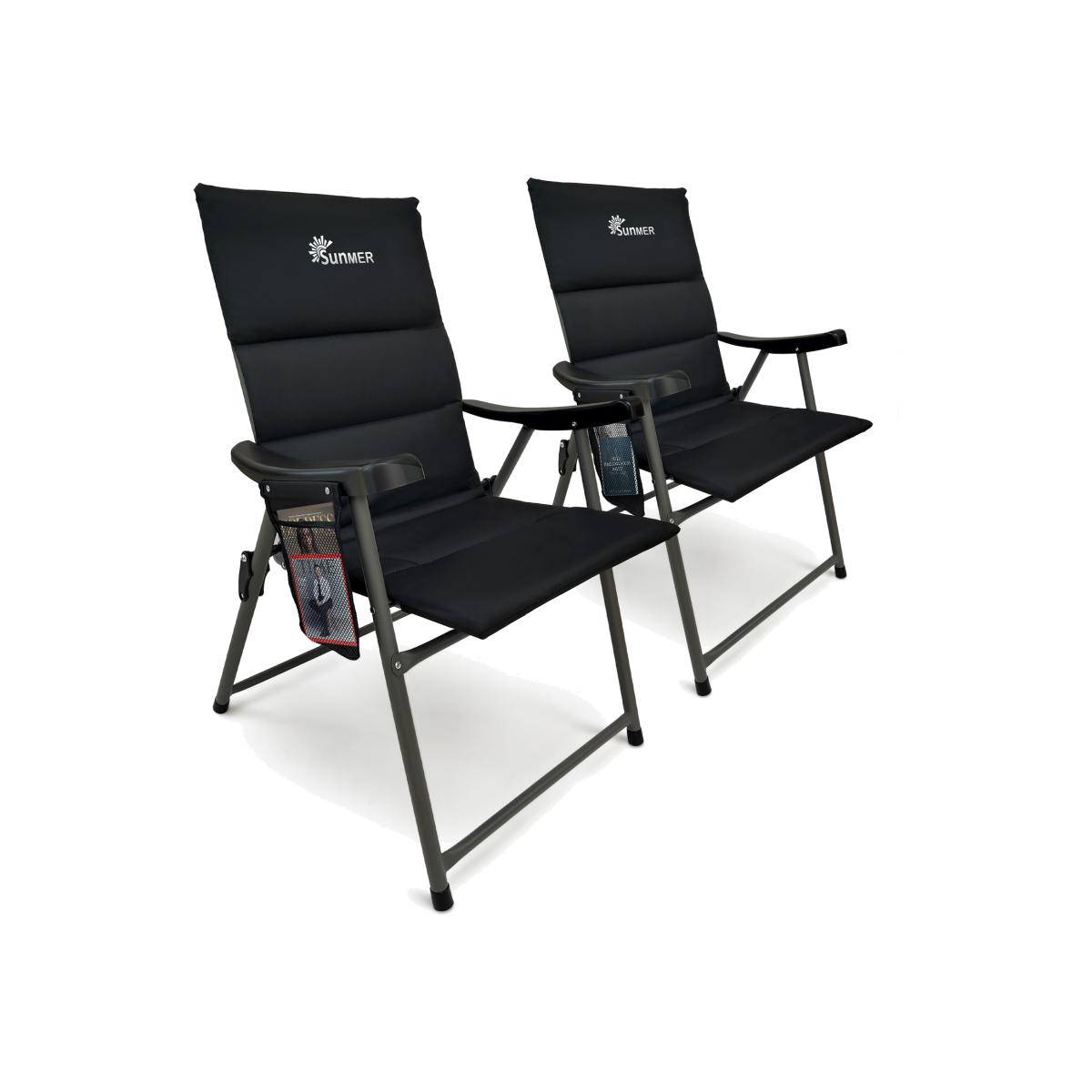 These Padded Folding Chairs are the ideal way to soak up the summer sun when the weather gets warmer. Featuring a handy side pocket for magazines as well as being padded for extra comfort, these chairs are ideal for sitting back and relaxing. Weighing just 4KG per chair, these folding chairs will have no problems being transported or stored away. They can fold and unfold in a matter of seconds as there is no assembly required. The chairs are constructed from quality materials that are designed to withstand the weather and whatever else you may throw at them. They can hold up to 120KG or 18 stone - meaning these chairs are more than capable of supporting most people. The feet stoppers on this chair reduce the risk of slipping whilst adding extra stability. As well as being fully padded for extra comfort, the chairs are also made with durable, easy-to-clean fabric. They fold down to almost flat so you should find no issues fitting them into the boot of your car.