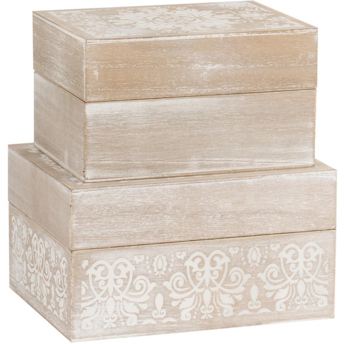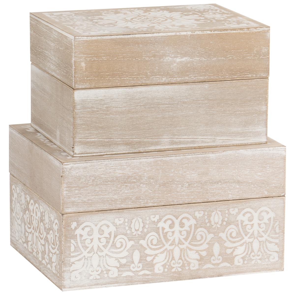 A beautiful and stylish way to keep your home neat and organised, this Set of 2 Patterned Boxes is a versatile and desirable collection that you'll love having around the house. Given a shabby chic, rustic wood design, these boxes are finished with an intricate, floral lace pattern that gives it a sophisticated edge. Ideal for adorning coffee tables and bookshelves, or using as under the bed or accessory storage in wardrobes, these organisational boxes are so fabulous, you'd be proud to keep them on display.