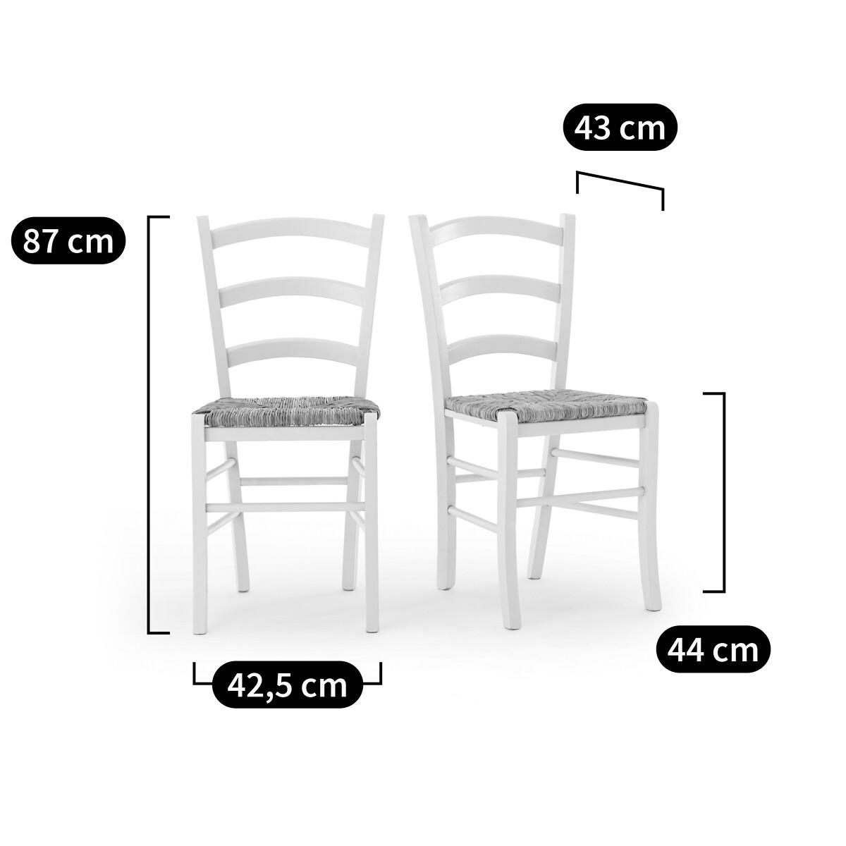 Set of 2 Perrine farmhouse chairs: a rustic model to freshen up your decor. This much-loved classic is revisited with a white or grey finish for an up-to-date look. Product Details • Untreated solid beech, with a polyurethane lacquered finish for the coloured models • Rice straw seatDimensions. Total: • L42.5 x H87 x D43cm. Seat: • Height 44cm • Sold pre-assembled. • Made in Europe. • WOOD FROM SUSTAINABLY MANAGED FORESTS. FSC® certified wood comes from forests that are environmentally, socially and economically well managed. Parcel Dimensions:1 parcel • W51 x H97 x D46 cm • 12kg