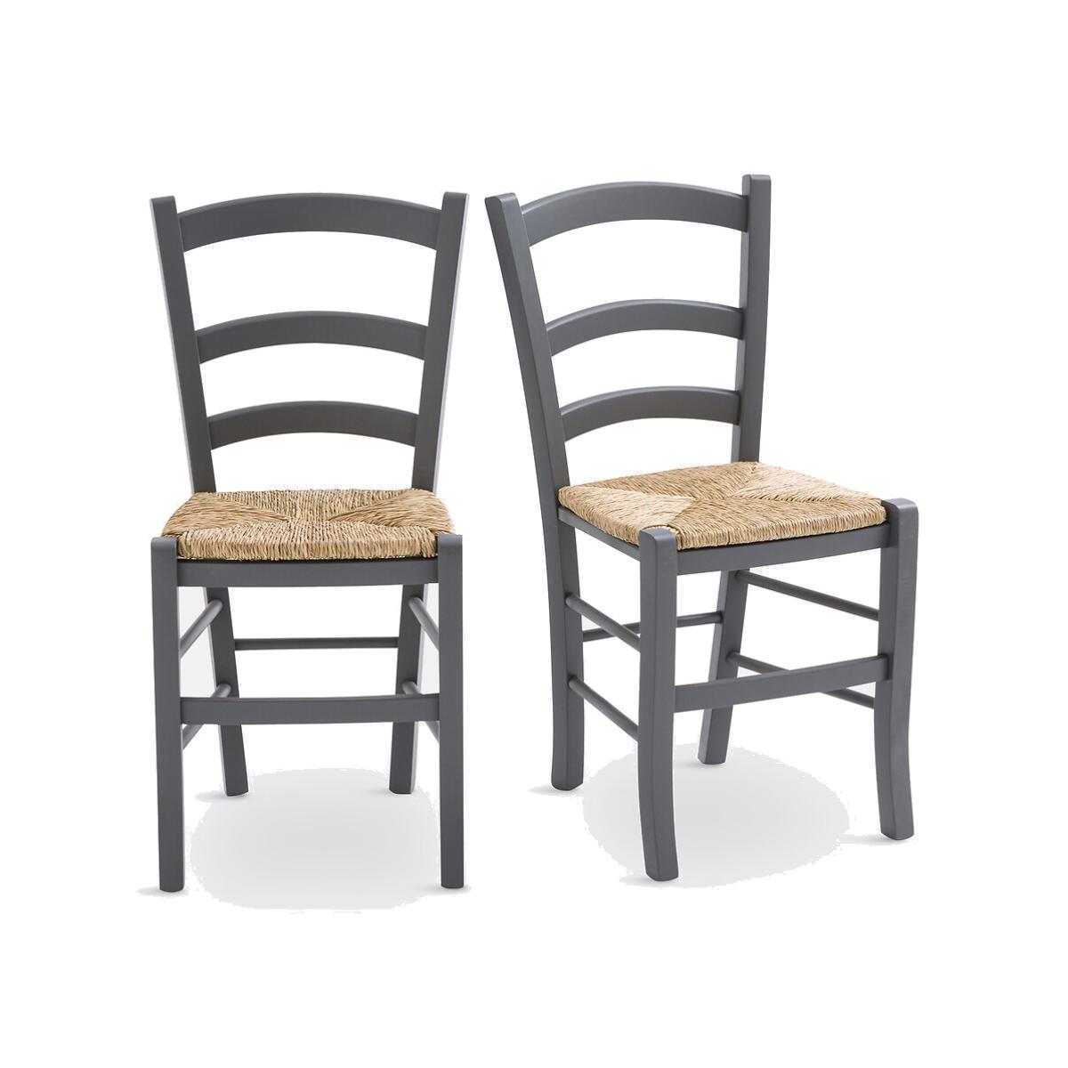 Set of 2 Perrine farmhouse chairs: a rustic model to freshen up your decor. This much-loved classic is revisited with a white or grey finish for an up-to-date look. Product Details • Untreated solid beech, with a polyurethane lacquered finish for the coloured models • Rice straw seatDimensions. Total: • L42.5 x H87 x D43cm. Seat: • Height 44cm • Sold pre-assembled. • Made in Europe. • WOOD FROM SUSTAINABLY MANAGED FORESTS. FSC® certified wood comes from forests that are environmentally, socially and economically well managed. Parcel Dimensions:1 parcel • W51 x H97 x D46 cm • 12kg