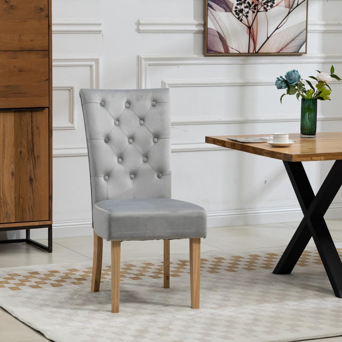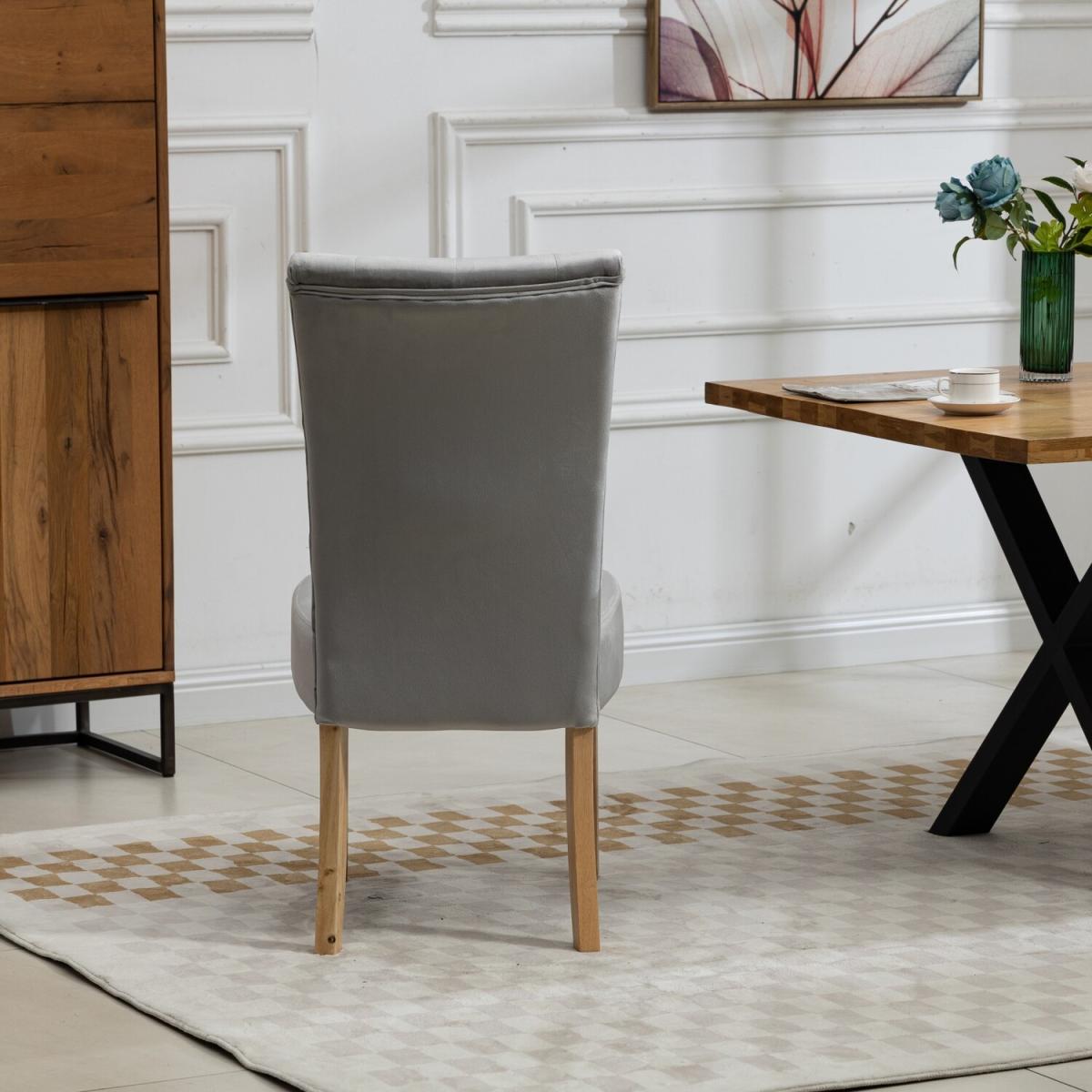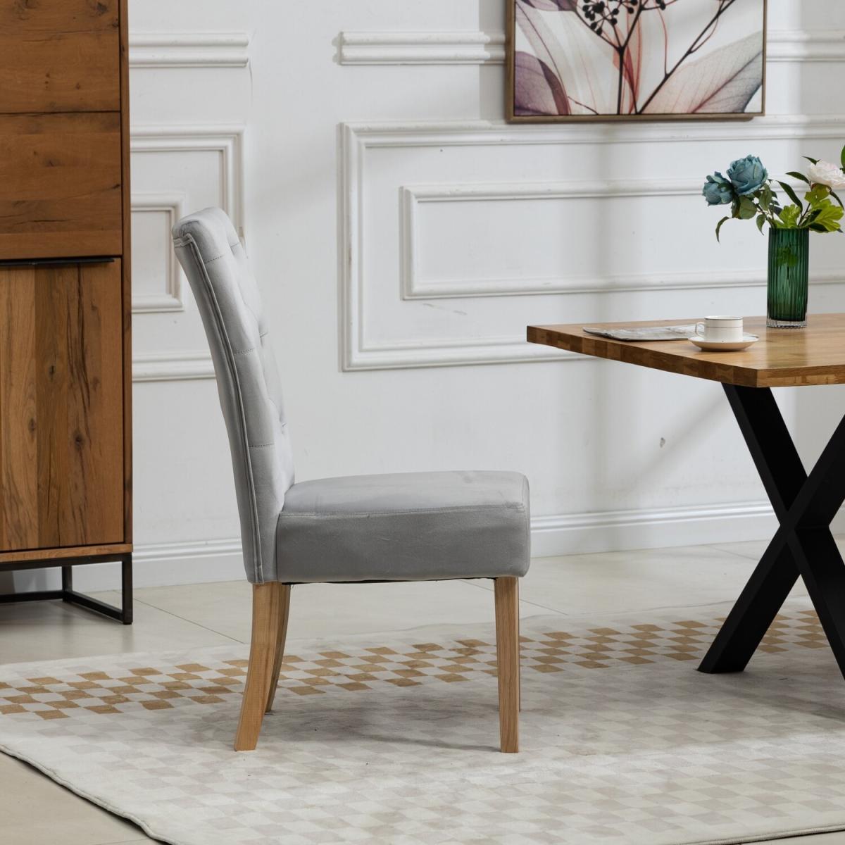 Indulge in an elevated dining experience with our alluring pair of dining chairs, featuring a high studded back that infuses a sense of regal charm into your dining area. Wrapped in luxurious velvet upholstery, these chairs are meticulously built around a solid wooden frame, ensuring lasting quality and exceptional comfort. The pine-coloured wooden legs not only provide reliable support but also bring a touch of natural beauty to your space. Effortless self-assembly is guaranteed through our user-friendly design, complemented by efficient delivery for a seamless experience. Explore a range of captivating colours to seamlessly match your decor or create a captivating contrast. Elevate your dining ambiance with this sophisticated and functional pair of dining chairs, redefining your dining moments through a perfect blend of elegance and ease.