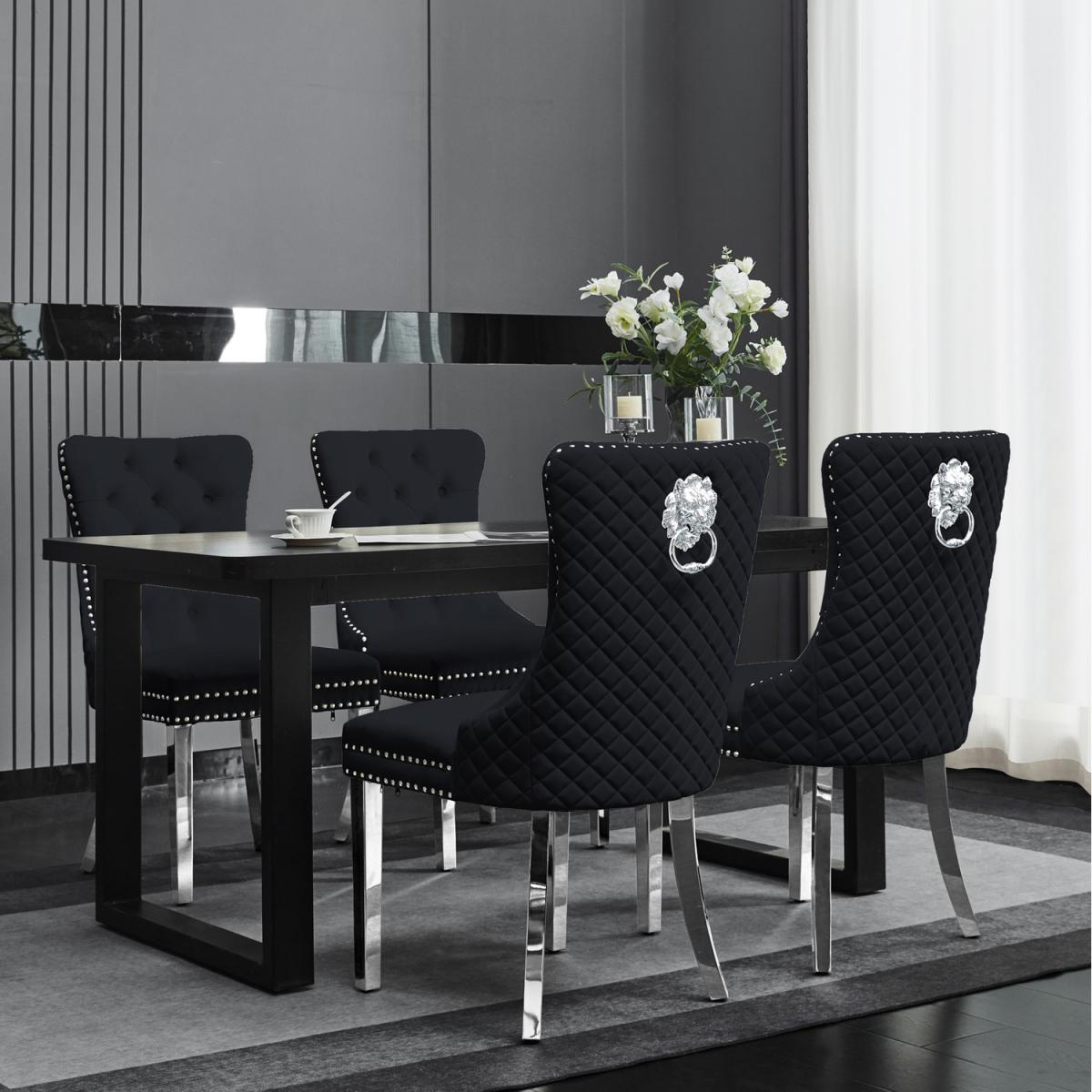 Add a touch of sophistication to your dining space with this Set of 2 Velvet Dining Chairs, featuring a stunning lion head knocker detail on the back. Upholstered in plush, soft-touch velvet with a sleek, quilted design, these chairs offer both comfort and statement style. The silver studded trim and chrome-finished legs complete the luxurious look, making them perfect for modern and elegant interiors. Whether for a dining room, home office, or statement seating, these chairs bring a regal touch to any space. Luxurious Velvet Upholstery is soft, plush fabric for a premium feel. Elegant Lion Head Knocker brings a striking feature that adds a regal touch. Silver Stud Detailing enhances the sophisticated, high-end look. Padded for Comfort, these chairs are supportive, cushioned and provide a comfortable dining experience. Chrome-Finished Legs provide a sturdy and stylish for a modern aesthetic. The Versatile Design is ideal for dining rooms, offices, or as accent chairs. Upgrade your space with these chic and timeless lion knocker chairs, bringing elegance and luxury to your home.
