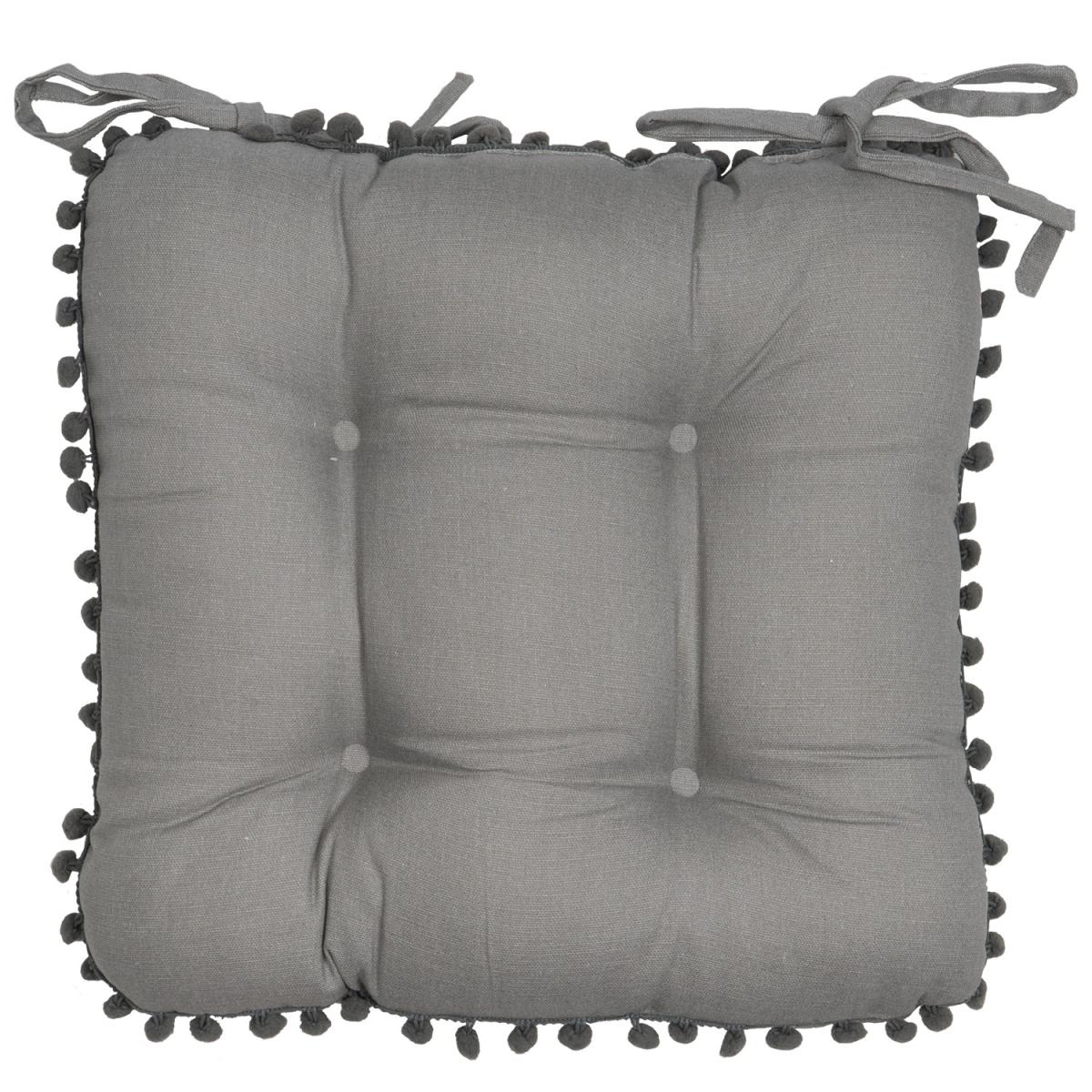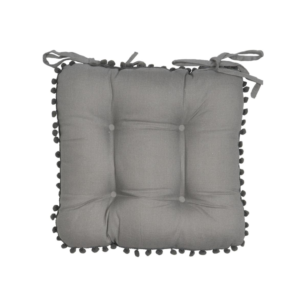 Add a bit of comfort to your dining chairs with this set of 2 Pom Pom Seat Pads. Coloured a lovely, neutral shade of grey that will fit in with any colour scheme, these cushions feature tie strings so you can secure them to your dining chairs. The covers feature charming yet understated decoration through the four buttons and a pom pom trim, and are made from 100& cotton.