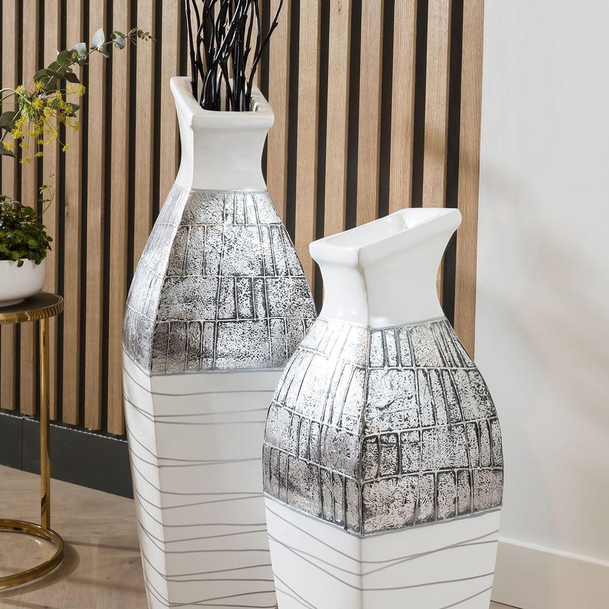 These vases are a versatile addition, perfect for modern and contemporary interiors. I love their sleek silver line gloss finish, which adds a subtle touch of sophistication without overpowering a space. They work particularly well in minimalist or industrial settings, where their clean lines and reflective surface can really stand out. For styling, consider placing them on a console or shelf with fresh or dried botanicals to create visual interest, or let their striking pattern be the focal point on their own. Because of their size, they are great for making a statement in open-plan living areas or hallways without cluttering the space.