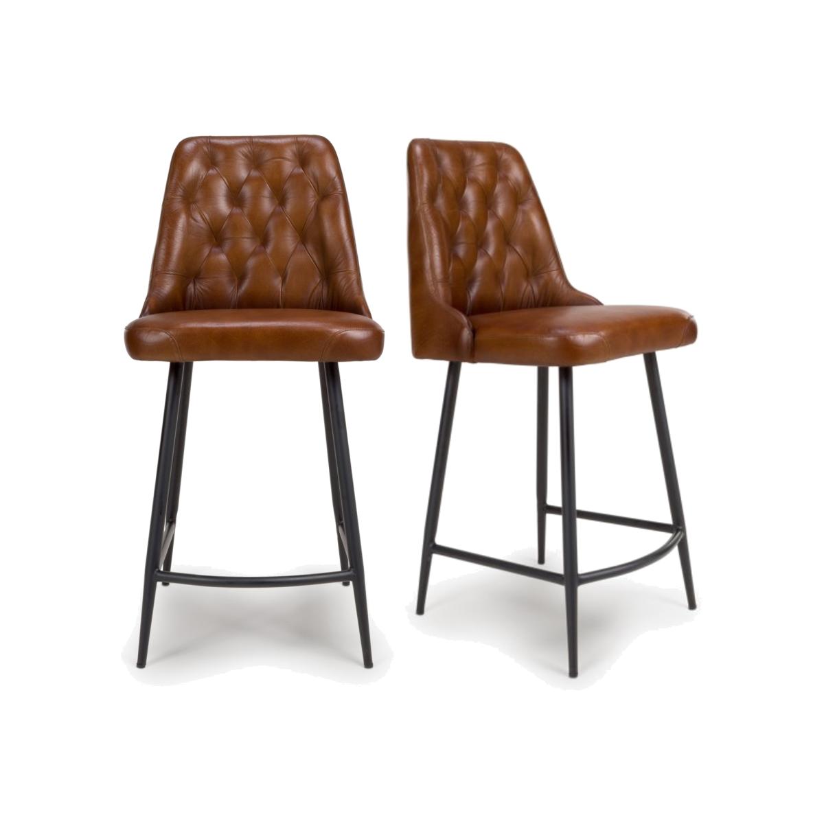 Set Of 2 Real Leather Tan Kitchen Stools with Quilted Back - Jaxson