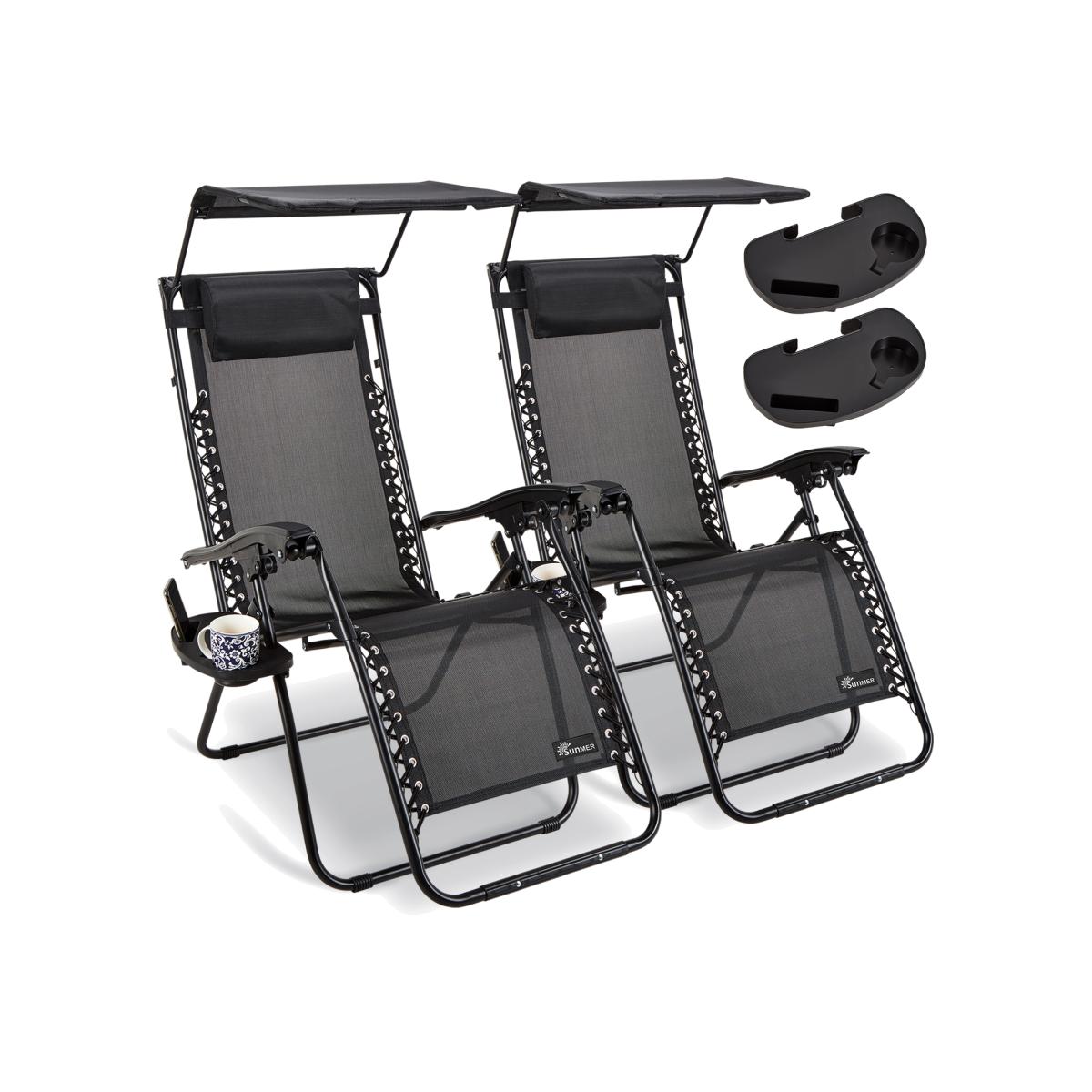 These Sun Lounger Garden Chairs are the ideal way to soak up the summer sun when the weather gets warmer. Featuring individual canopies, cup holders and cushions, you are sure to notice the luxury touches added to this set of two chairs. Weighing just 8.5KG per chair, these sun loungers will have no problems with being transported or stored away. They are easy to move around your garden so you will be able to position yourself in the prime sunny spots. These Sun Loungers can be reclined between 30 degrees and 90 degrees making them ideal for summer snoozes. The canopies are fully adjustable meaning you can block out harmful UV rays when sun lounging or simply block out the sun if you're trying to read or relax. The cushions can also be adjusted for ultimate comfort. The lightweight powder-coated steel frame will prevent rusting on the chairs. The feet on the loungers prevent them from slipping whilst in use and the high-quality Textilene fabric ensures a quick and easy clean.